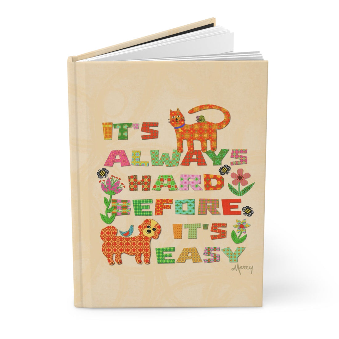 Each letter in the quote is crafted from unique, textured patterns, giving the message an eclectic, artistic spirit. But the magic doesn’t stop there—this journal is brought to life with whimsical companions: a curious cat with a butterfly on its back, a sweet Maltipoo pup with a feathered friend, and a trio of colorful flowers buzzing with bumblebees. All of this is set against a soft cream paper-textured background to keep the focus warm and inviting.