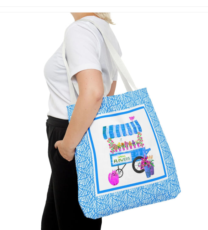 Adding to the whimsy is a chubby pink cat sitting in front of the cart, while a pink bird perches on top and a blue dragonfly flutters nearby. The combination of playful details and vibrant colors brings a fresh, springtime energy to this tote, making it a perfect companion for those who love nature, flowers, and the joys of the season.