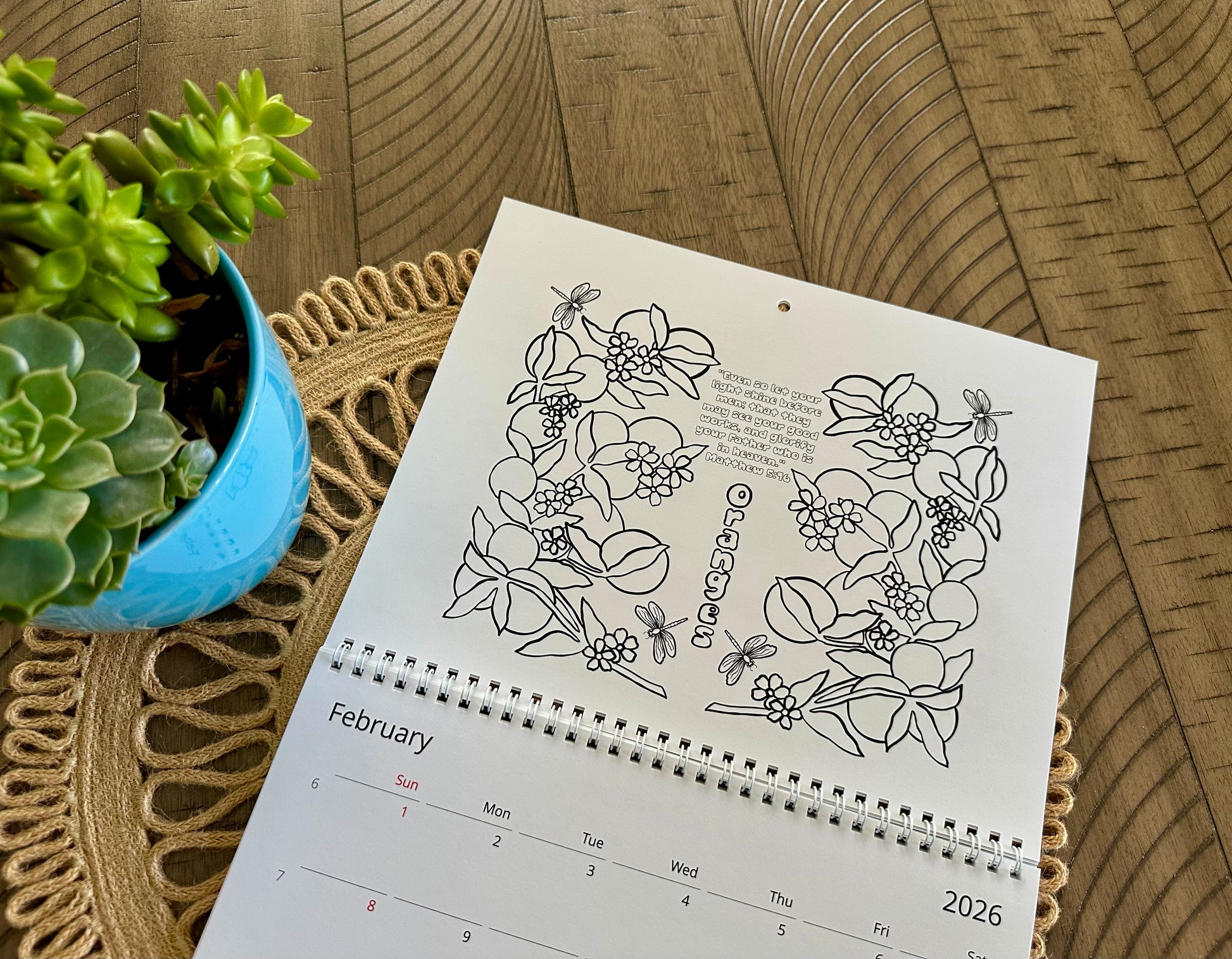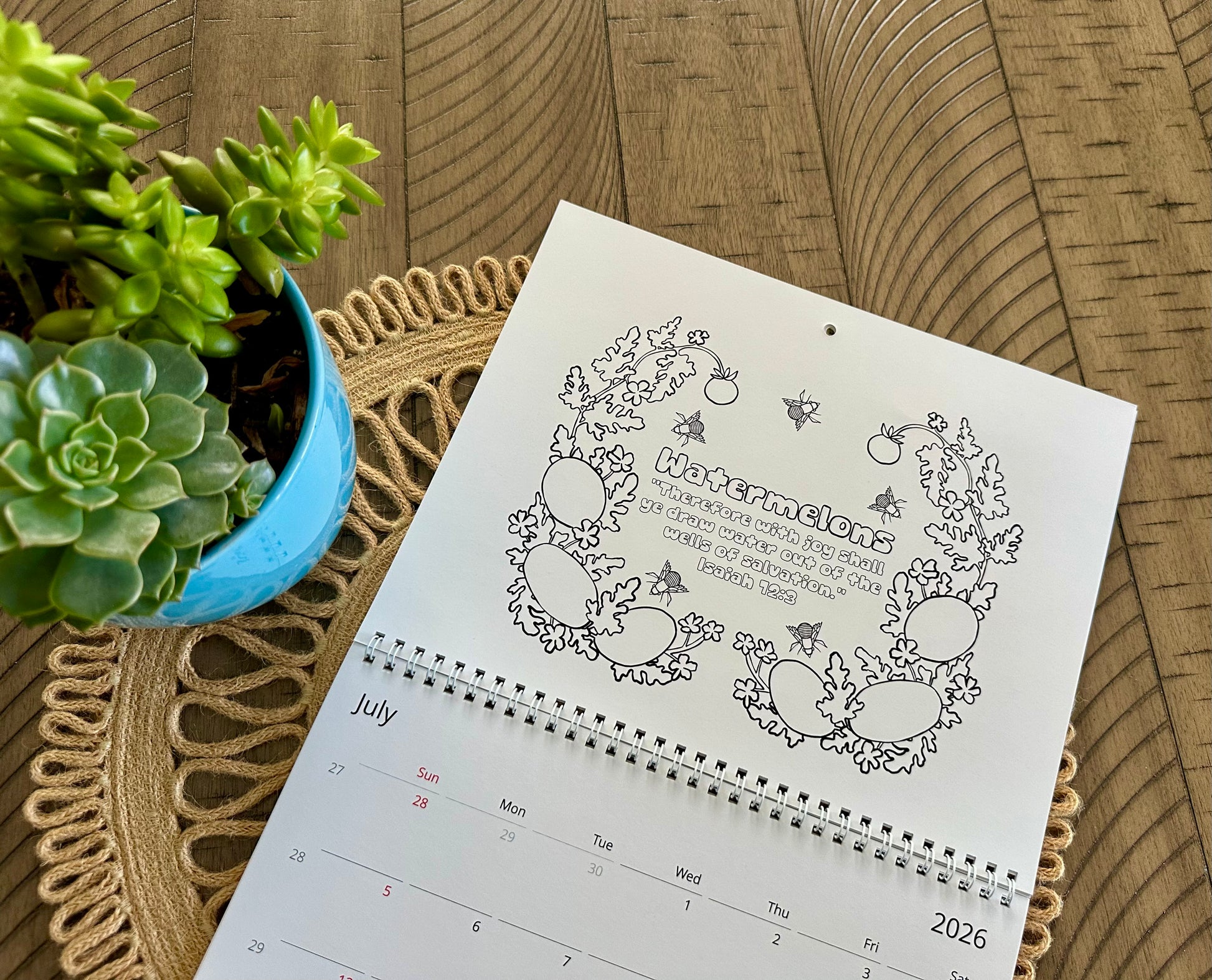 Celebrate the beauty of God’s creation and the nourishment of His Word throughout the year with the A Fruitful Year 2026 Coloring Calendar. Each month features a black and white illustration of fruit growing on the tree or vine, paired with an uplifting Bible verse. These hand-drawn designs were originally created for the A Fruitful Year 2026 Calendar and later inspired the A Fruitful Life Coloring Book: Fruit Designs with Bible Verses—now available on Amazon. This calendar is perfect for personal reflection, quiet devotional time, or as a faith-filled gift for loved ones who enjoy Scripture and creativity.