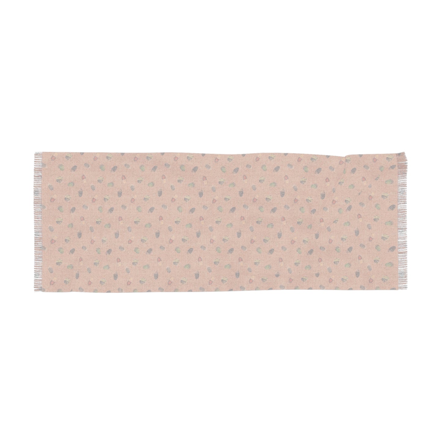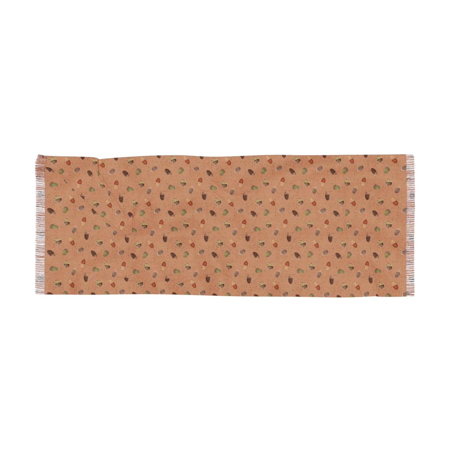 Delicate lightweight rectangular scarf featuring a charming acorns design. This elegant scarf showcases a variety of acorns in green, red, taupe, soft brown, and dark brown, set against a warm tan background. Perfect for adding a touch of autumnal sophistication to your outfit while staying comfortable and stylish.