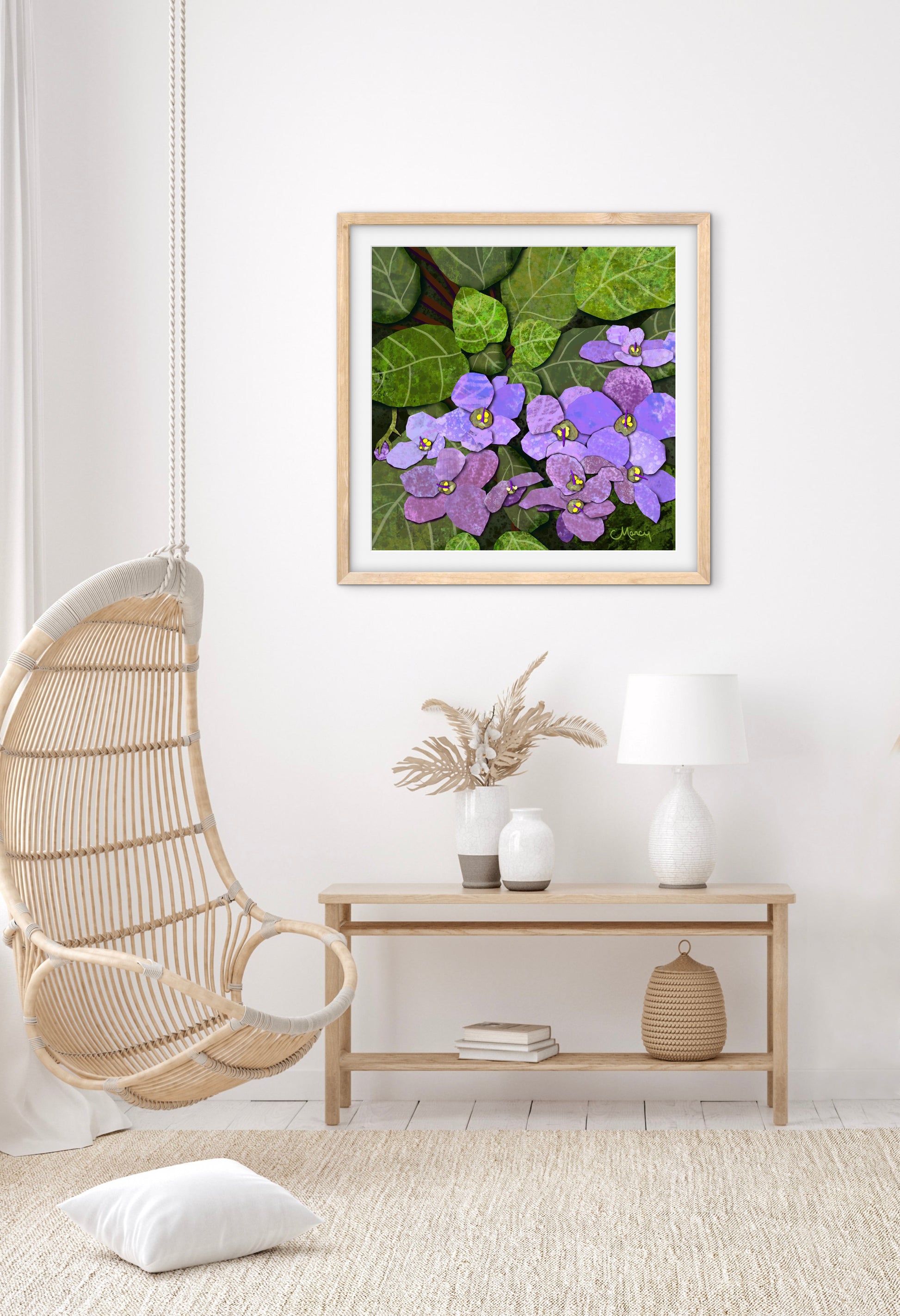 Transform your space with the vibrant allure of African violets captured in this stunning wood framed premium matte poster print. Crafted from digitally painted paper collage techniques, this illustration bursts with rich colors and intricate details, bringing the beauty of nature indoors. Perfect for adding a touch of botanical elegance to any room, this piece exudes charm and sophistication. Elevate your décor with this captivating artwork that celebrates the timeless allure of African violets.