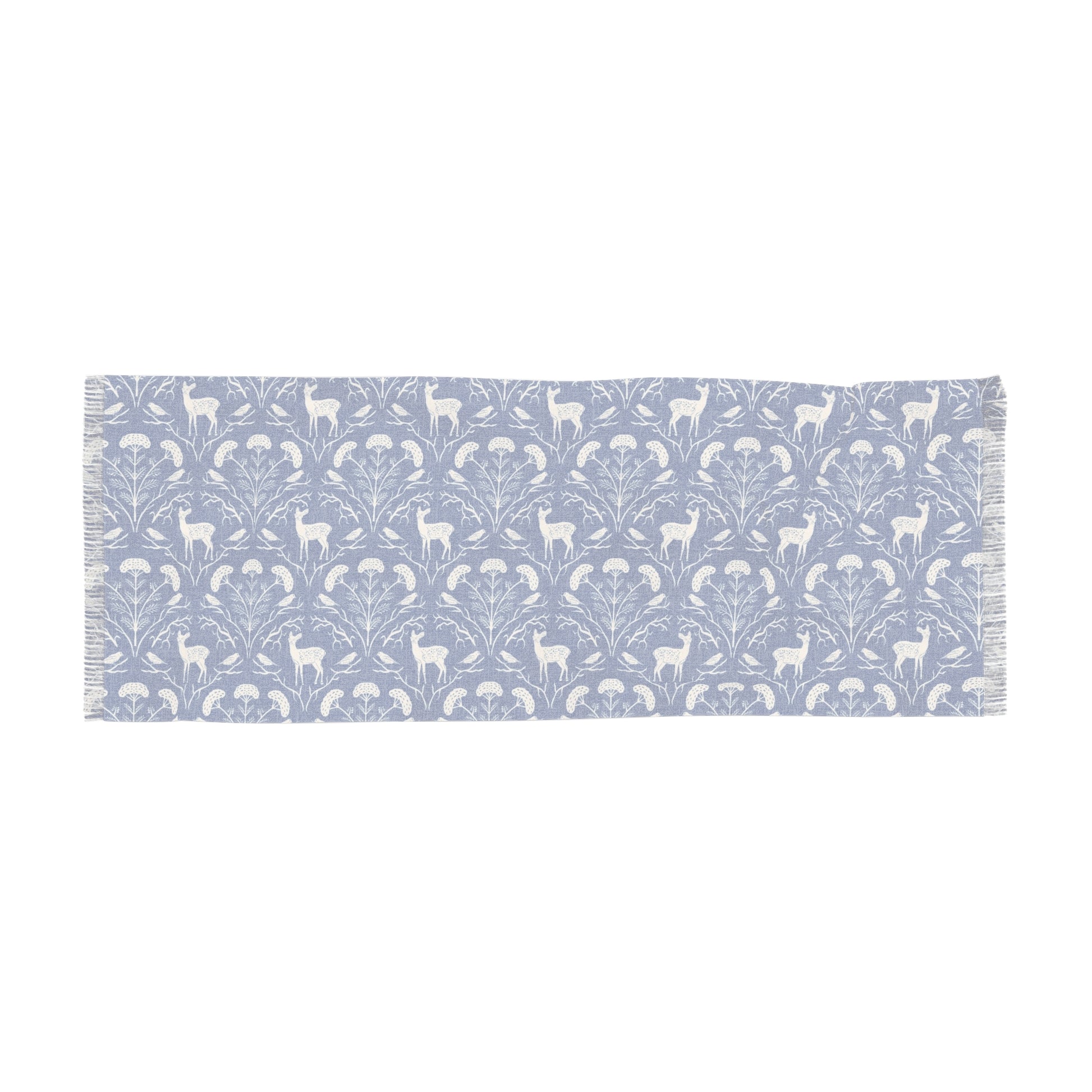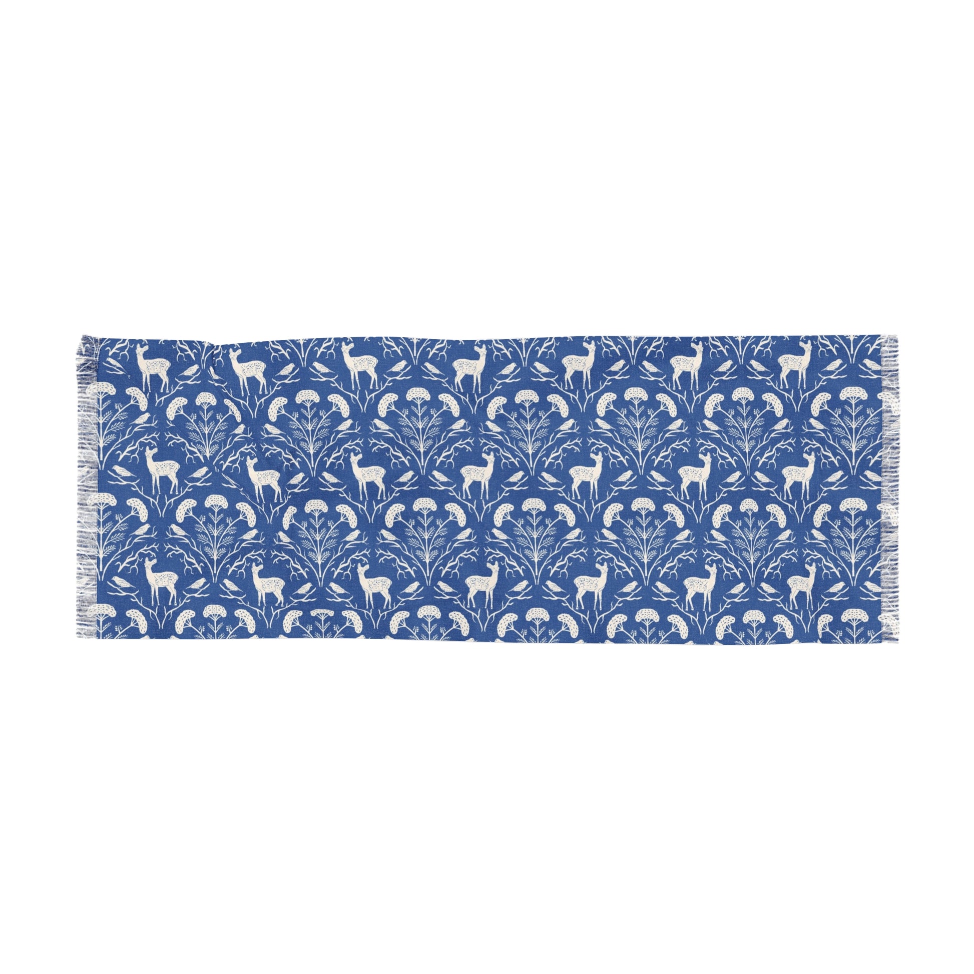 Wrap yourself in woodland elegance with this lightweight rectangular scarf featuring a scalloped pattern of yarrow, white-tailed deer, and goldfinches. Illustrated in soft cream on a richly textured deep cornflower blue background, this design captures the quiet beauty of Appalachian forests. Airy, graceful, and nature-inspired, it’s perfect for year-round wear.