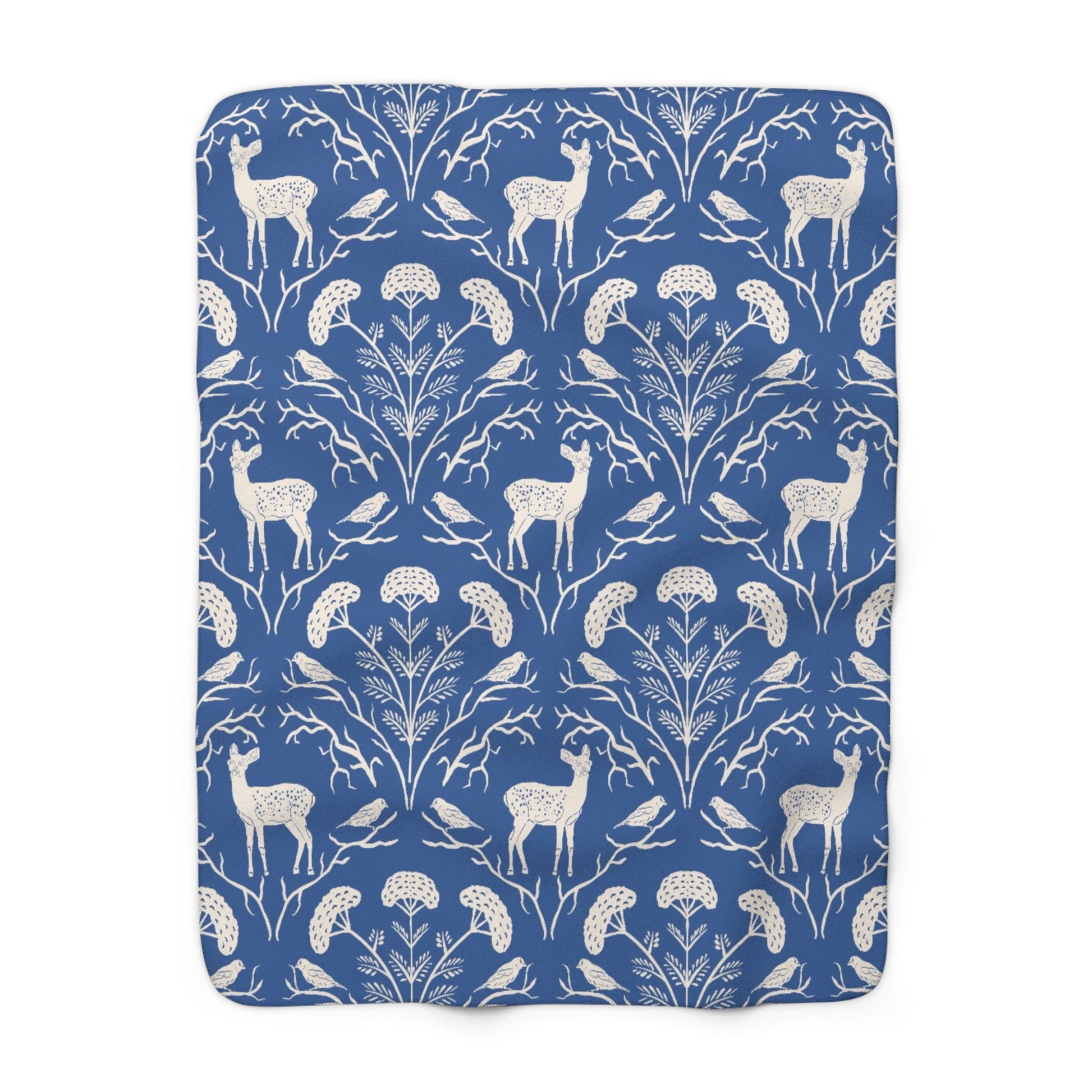 Wrap yourself in woodland calm with this Sherpa fleece blanket featuring a graceful scalloped pattern of yarrow, white-tailed deer, and goldfinches, illustrated in soft cream against a richly textured deep cornflower blue background. Inspired by Appalachian forests, this design blends gentle wildlife motifs with a cozy, timeless feel—perfect for quiet evenings and nature-loving homes.
