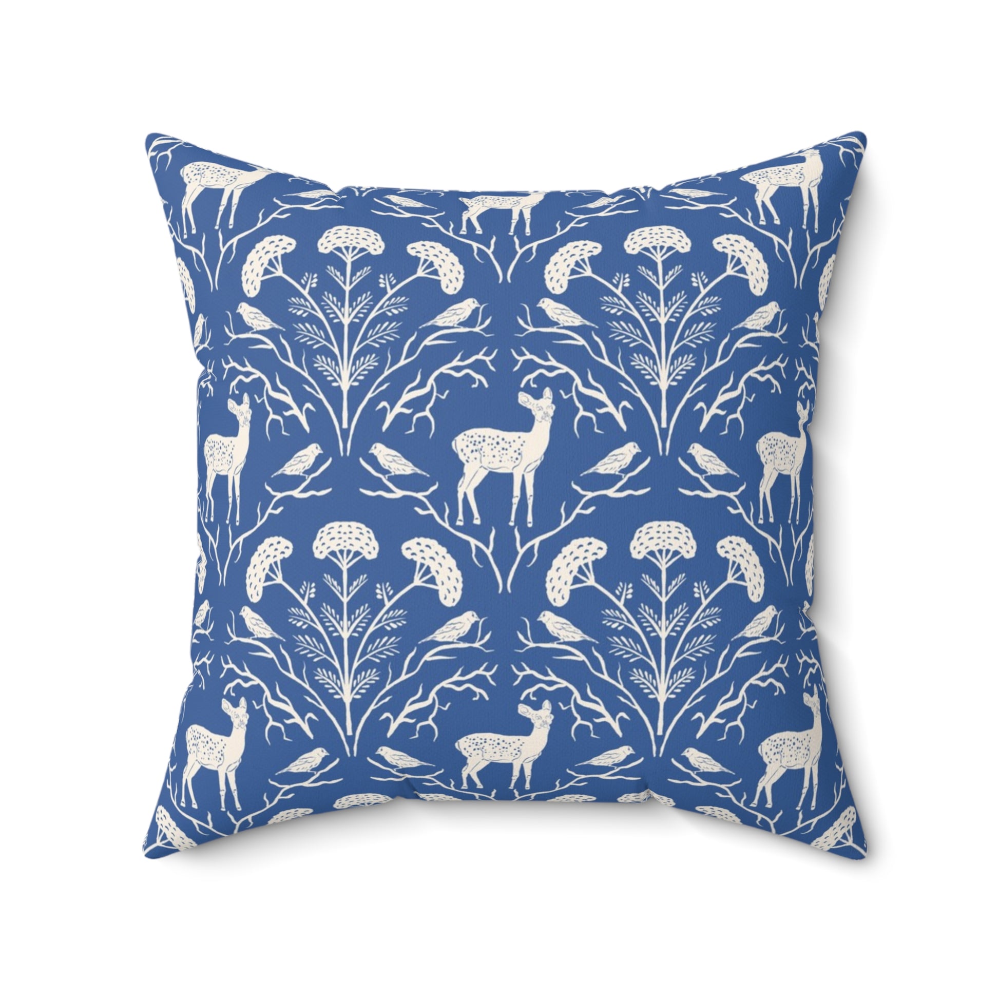 Bring woodland elegance into your space with this square pillow featuring a scalloped pattern of yarrow, white-tailed deer, and goldfinches. Illustrated in soft cream against a textured deep cornflower blue background, the design feels both timeless and cozy. Inspired by Appalachian forests, it adds quiet nature charm to any room.