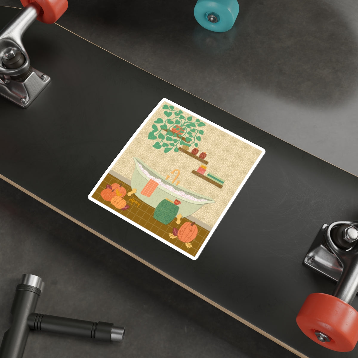 Step into a cozy autumn sanctuary with this enchanting die-cut sticker featuring an old-fashioned clawfoot tubsurrounded by pumpkins and fall leaves. A small table holds a steaming cup of coffee and a spellbinding book titled ‘Potions’ — the perfect touch of seasonal magic.