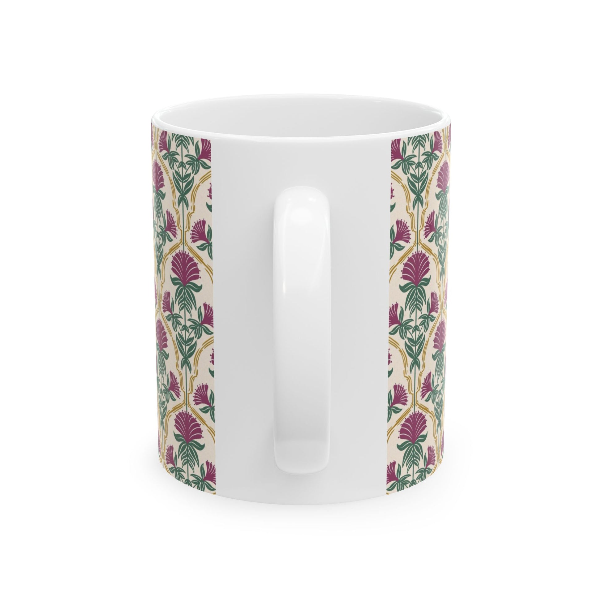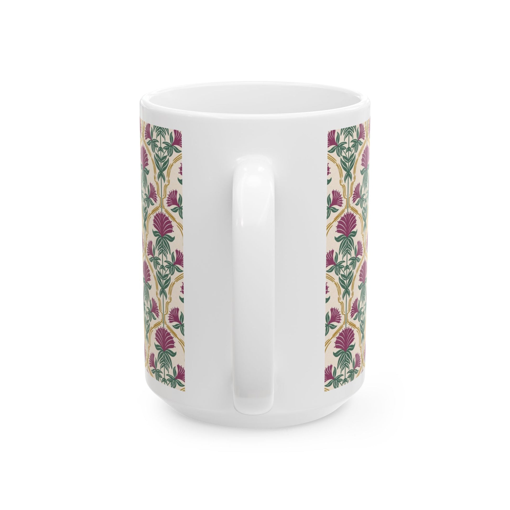 Bring the quiet beauty of Appalachian woodlands to your daily ritual with this ceramic mug featuring a stylized illustration of mulberry rose bergamot flowers framed in elegant gold line work. Set on a softly textured cream background, this design blends botanical charm with a warm, heirloom feel. Part of the Whispering Woods collection celebrating wild herbs of the Appalachian forests.
