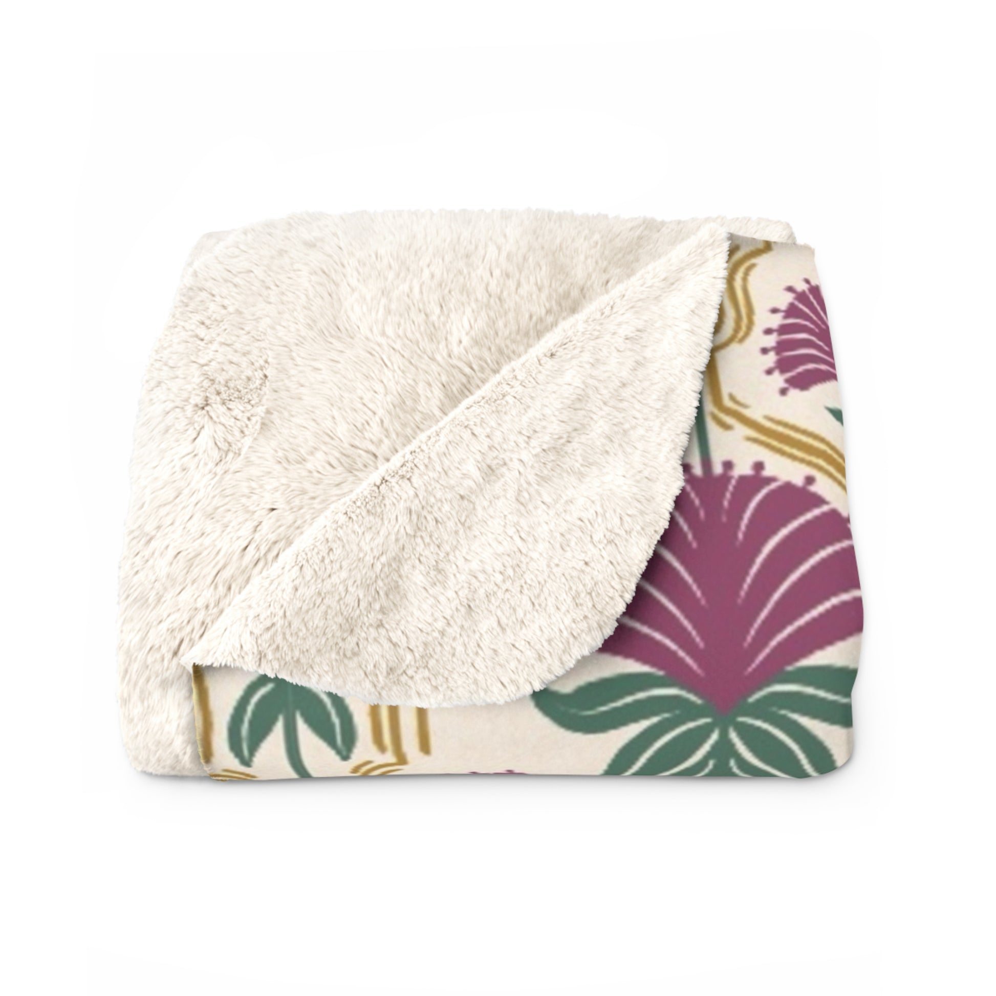 Wrap yourself in cozy woodland comfort with this Sherpa fleece blanket featuring a stylized illustration of mulberry rose bergamot flowers framed in elegant gold line work. Set against a softly textured cream background, the design evokes the quiet beauty of Appalachian forests. Part of the Whispering Woods collection, this blanket celebrates wild herbs found throughout the woodlands of Appalachia, blending warmth, nature, and timeless botanical charm. Perfect for restful evenings, reading nooks, or gifting to nature lovers.