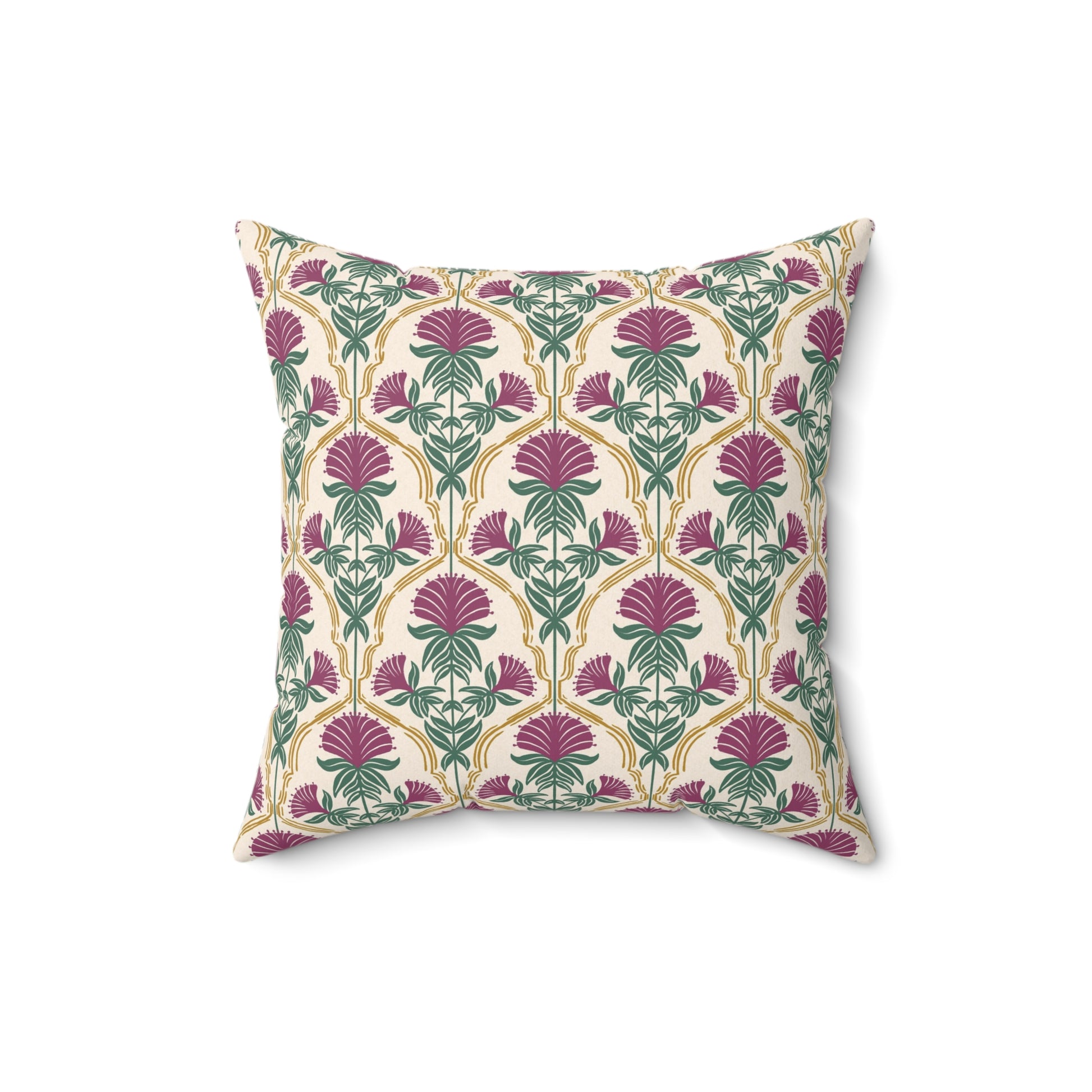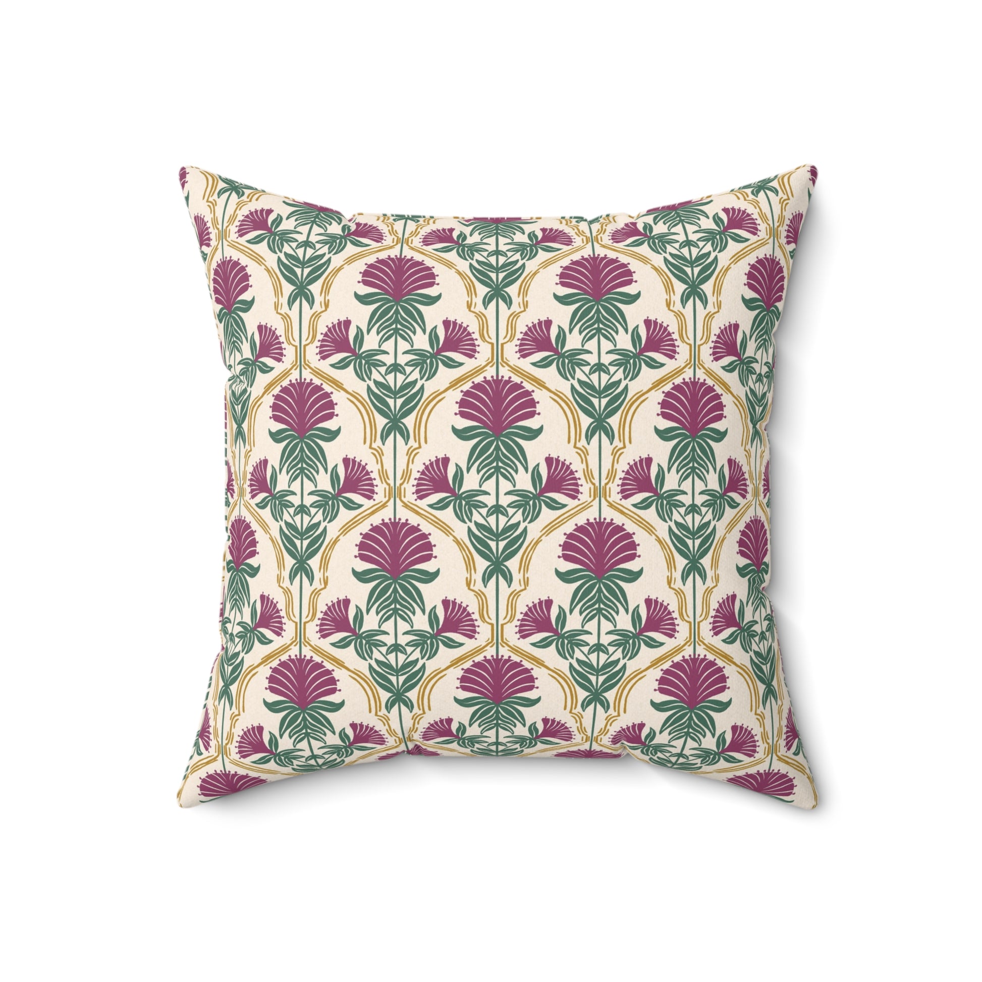 Bring soft woodland elegance into your space with this square pillow featuring a stylized illustration of mulberry rose bergamot flowers framed in delicate gold linework. Set against a textured soft cream background, this design reflects the quiet beauty of wild herbs found in the forests of Appalachia. Part of the Whispering Woods collection, it adds a warm, timeless accent to cozy, nature-inspired interiors.