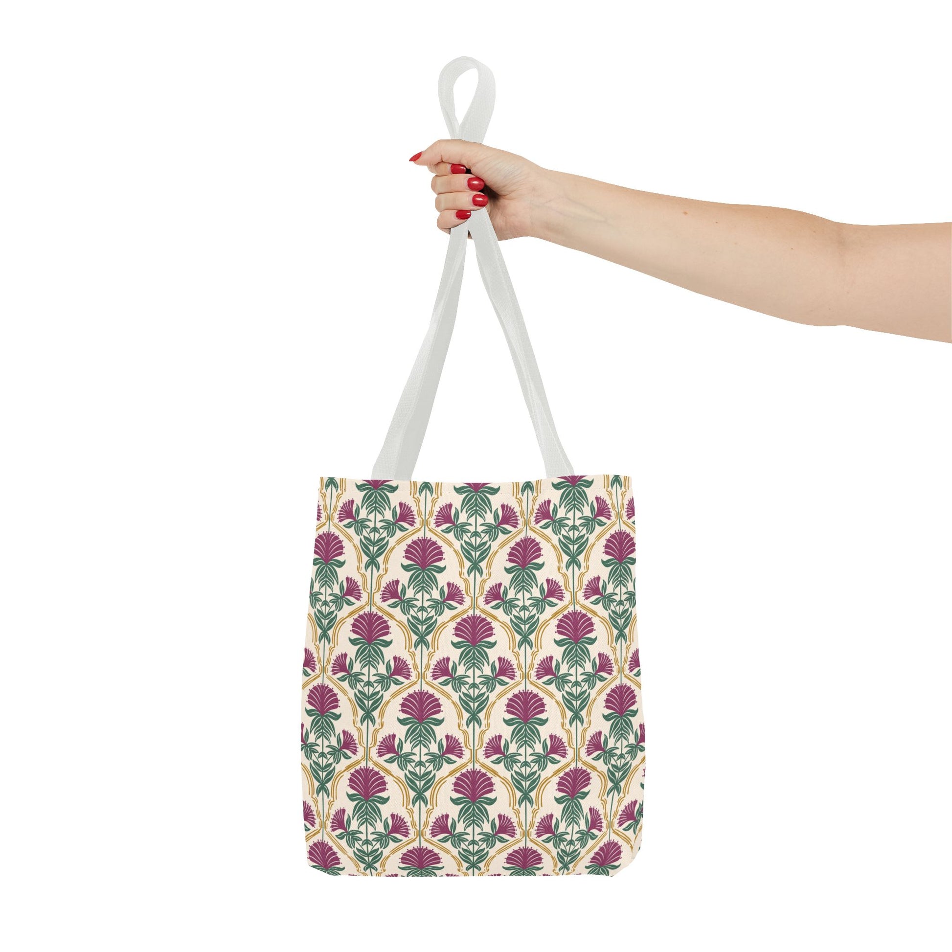 Carry a touch of woodland elegance wherever you go with this tote bag featuring a stylized illustration of mulberry rose bergamot flowers framed by delicate gold line work. Set against a softly textured cream background, the design evokes the feel of a vintage botanical notebook with a warm, handcrafted charm. Perfect for daily errands, book lovers, and nature-inspired style.