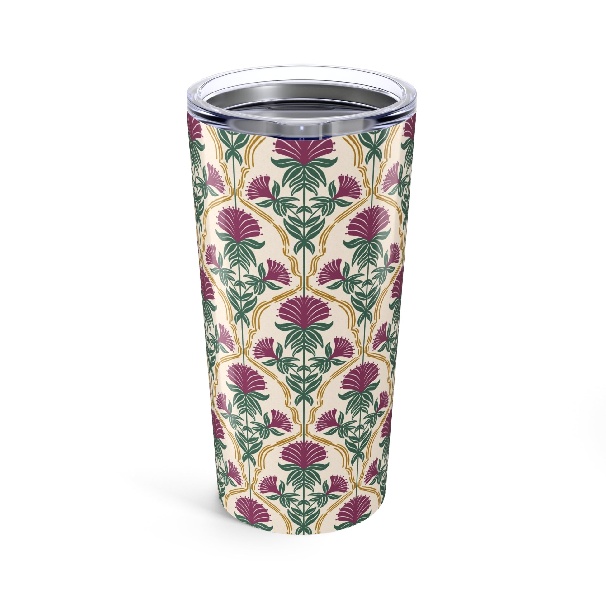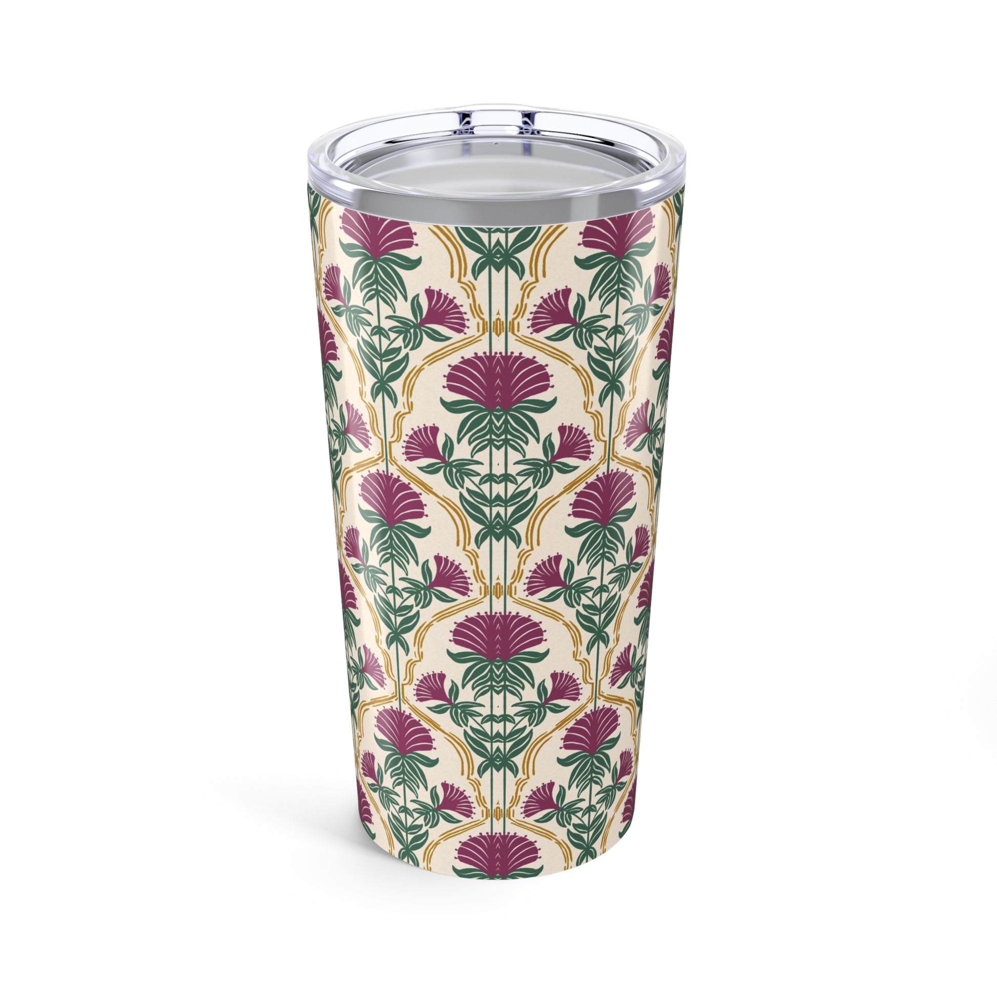 Carry a touch of woodland elegance wherever you go with this 20 oz stainless steel travel mug featuring a stylized illustration of mulberry rose bergamot flowers. The blossoms are beautifully framed with delicate gold line work, creating a timeless decorative border. Set against a textured soft cream background, the design has a subtle, gritty finish reminiscent of an heirloom botanical print. Durable, insulated, and artfully designed, this mug is perfect for cozy mornings, creative days, and nature-inspired living.