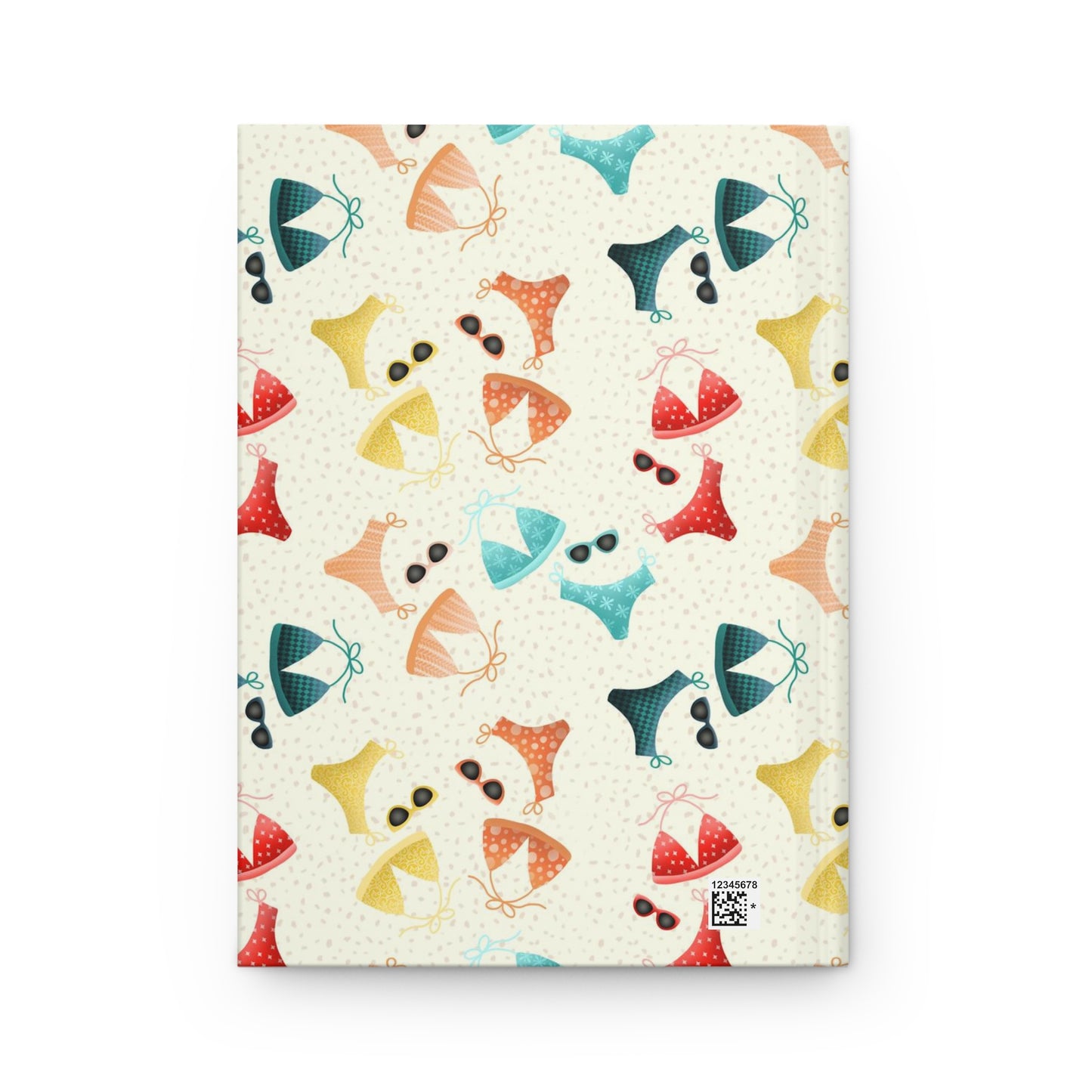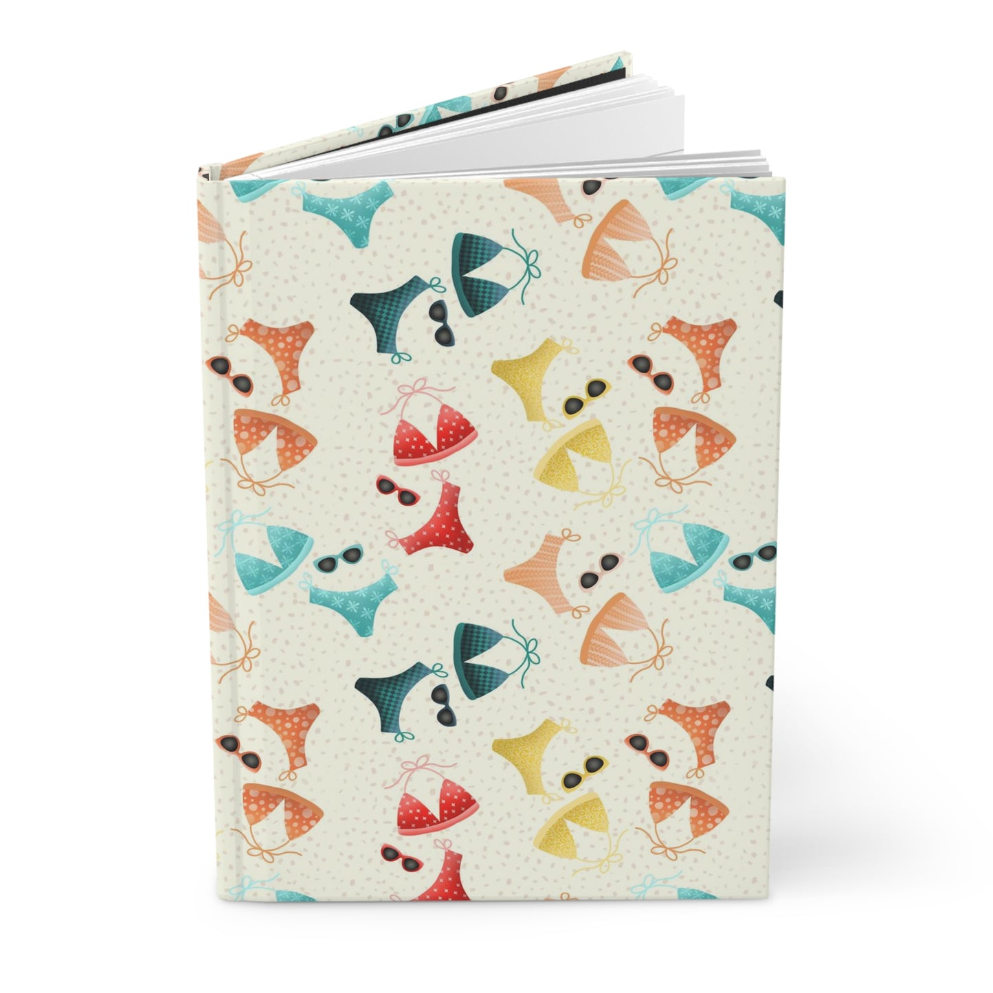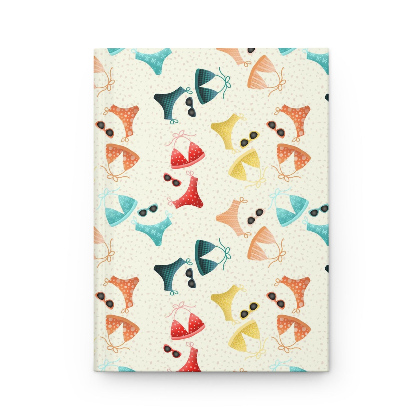 Embrace sun-kissed vibes with our hardcover matte journal adorned with vibrant bikinis. Dive into a world of summer hues featuring red, yellow, orange, pink, turquoise, and navy in playful patterns. Each journal is paired with vintage sunglasses, perfectly complementing its retro charm. Set against a textured sand-colored backdrop, this journal invites you to capture your beachside adventures and cherish every moment.