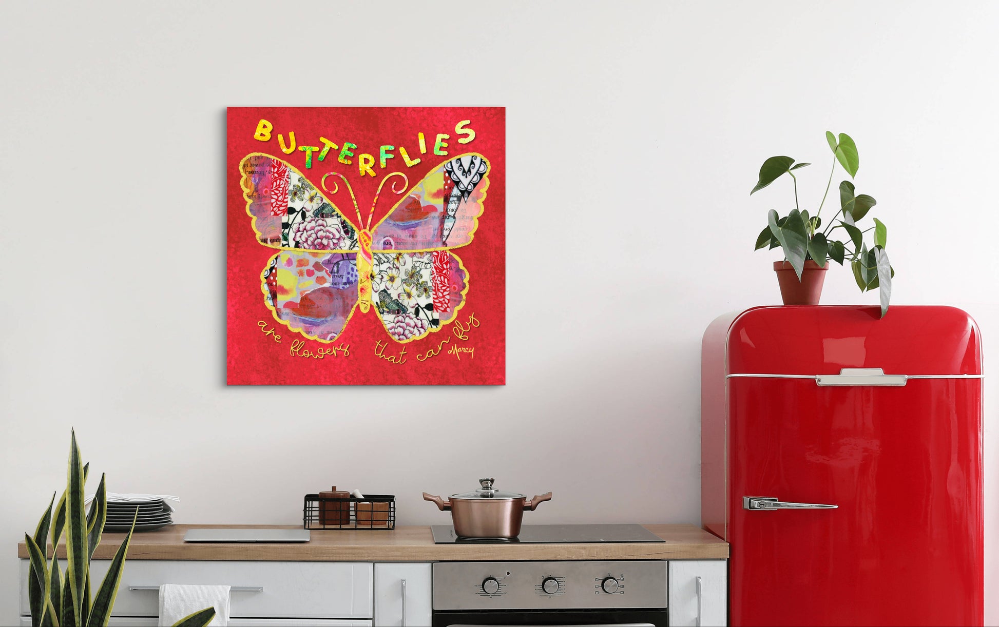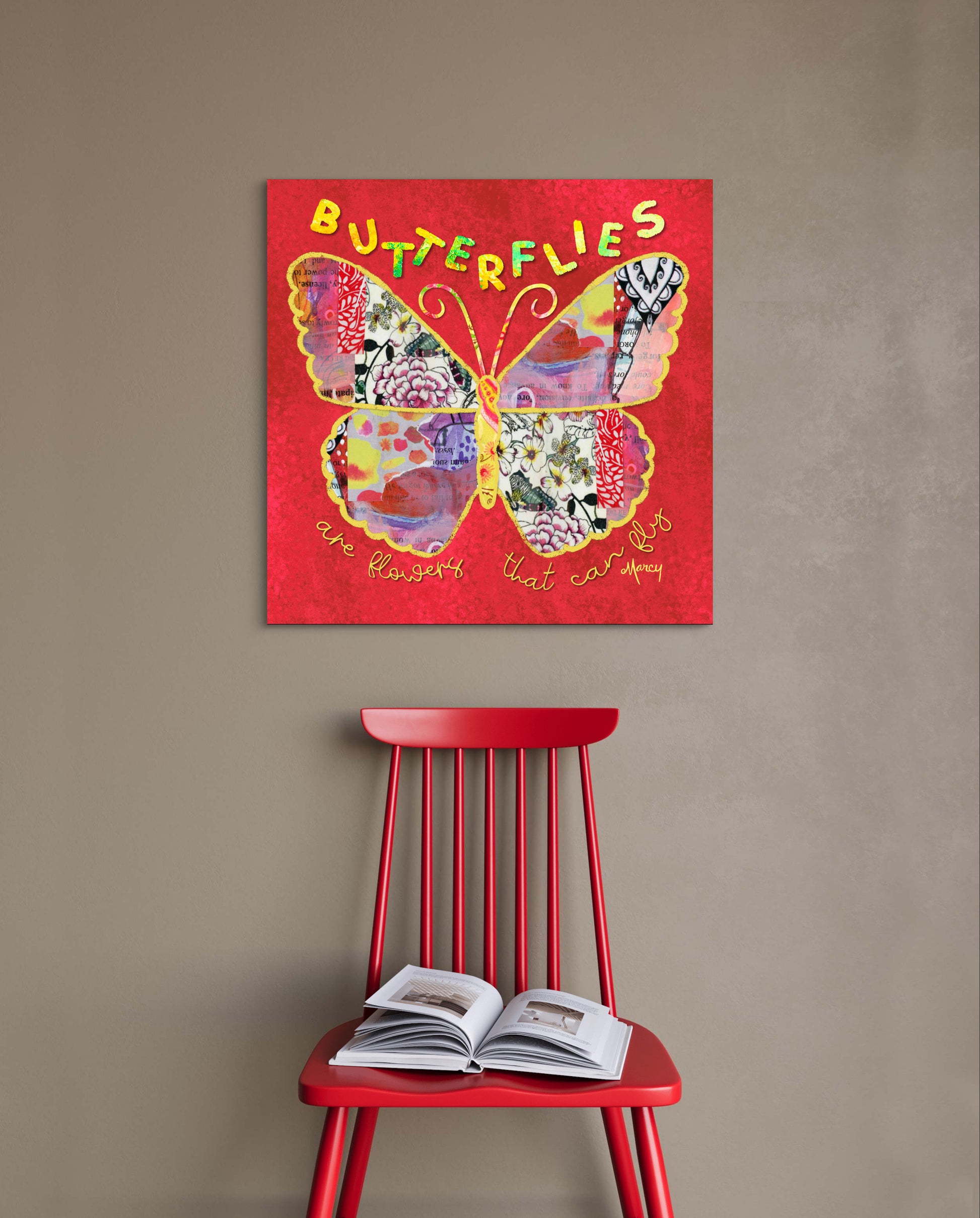 Add a vibrant pop of joy and creativity to your walls with this premium matte paper poster of Boho Butterfly Collage. This whimsical artwork features a hand-cut style butterfly adorned with floral collage papers, layered script, and playful abstract doodles. A thick, bright yellow pencil outline gives the butterfly bold personality, while sunshine-yellow lettering above and below reads: “Butterflies are flowers that fly.” Set against a rich red textured paper background, this high-quality matte print brings color, charm, and movement into any space—perfect for a gallery wall, creative nook, or cheerful gift.