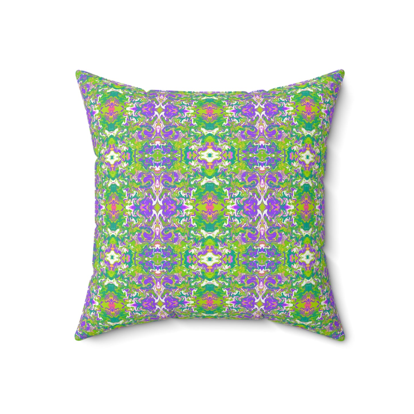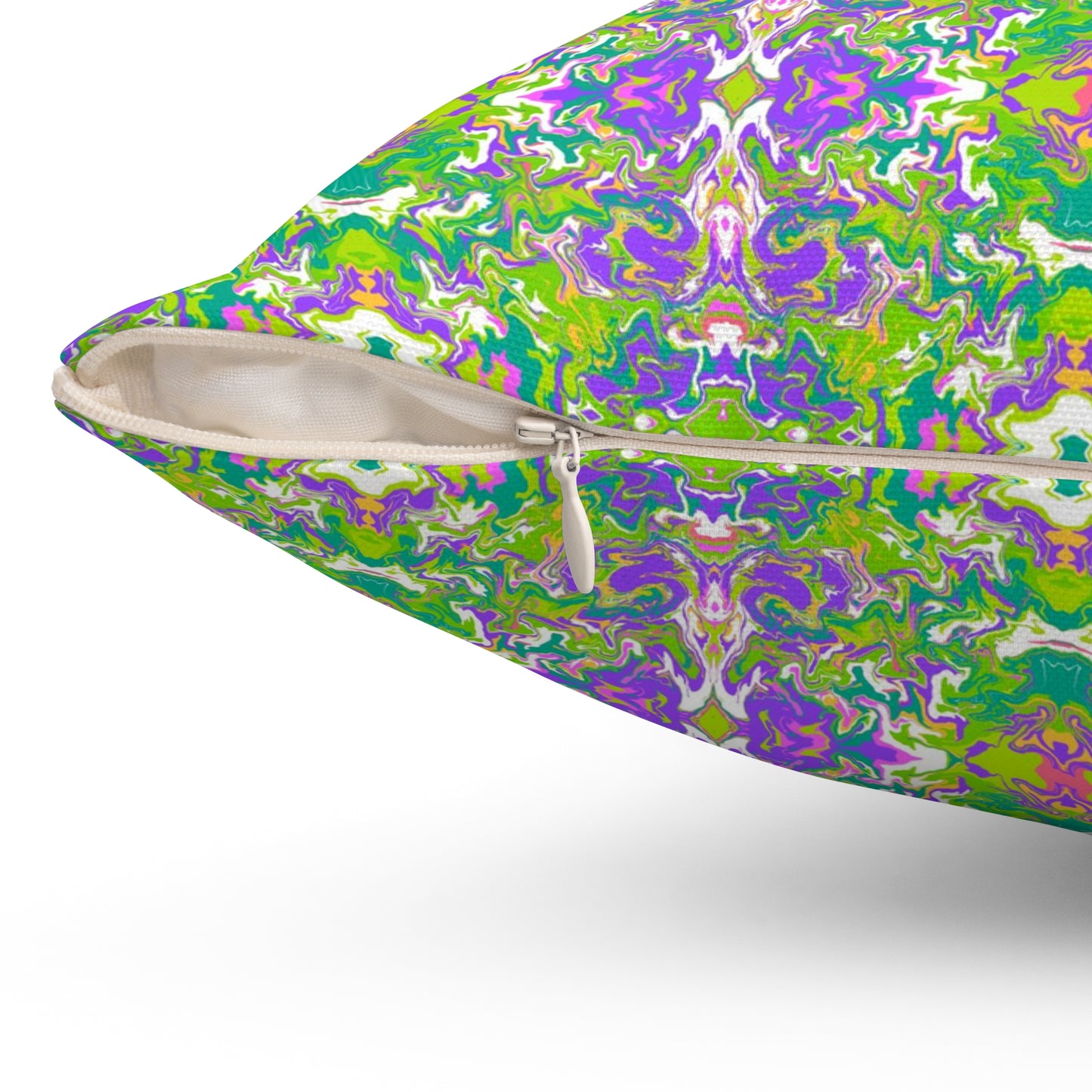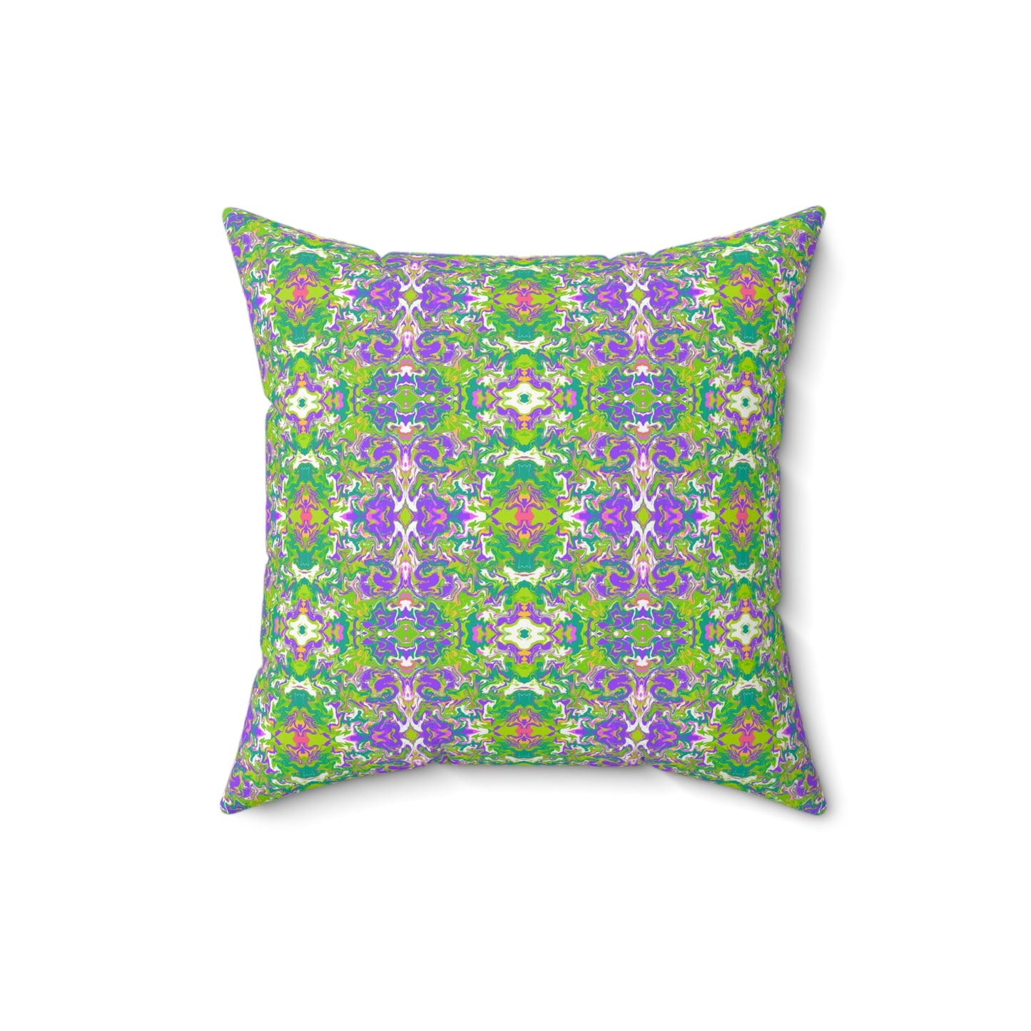 Introducing the mesmerizing spun polyester square throw pillow featuring an intricate boho style abstract spring garden design. This stunning pillow showcases a vibrant color palette of purple, pink, gold, green, and turquoise, bringing a burst of energy and life to any space. The high-quality spun polyester material ensures durability and comfort, making it a perfect addition to your home decor.