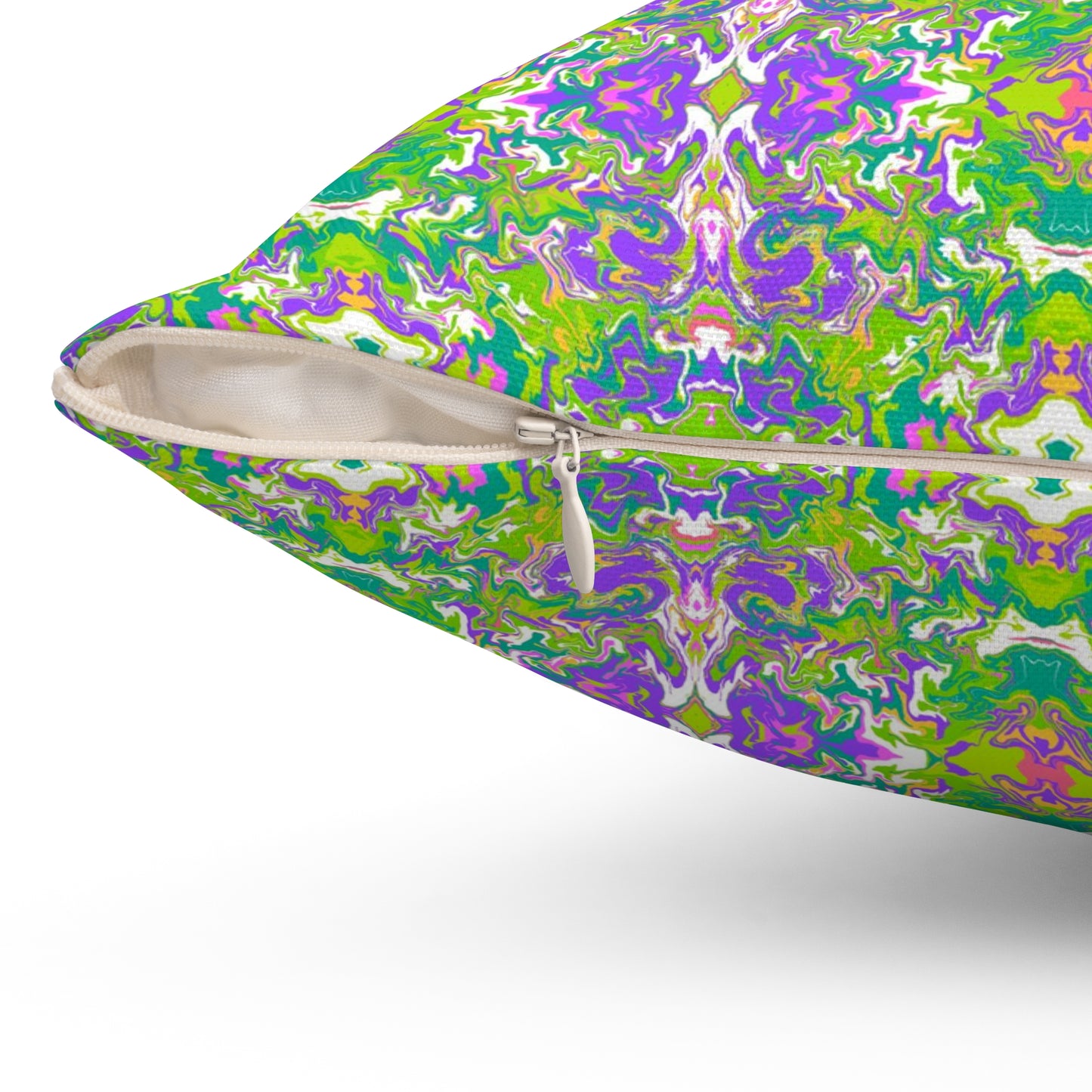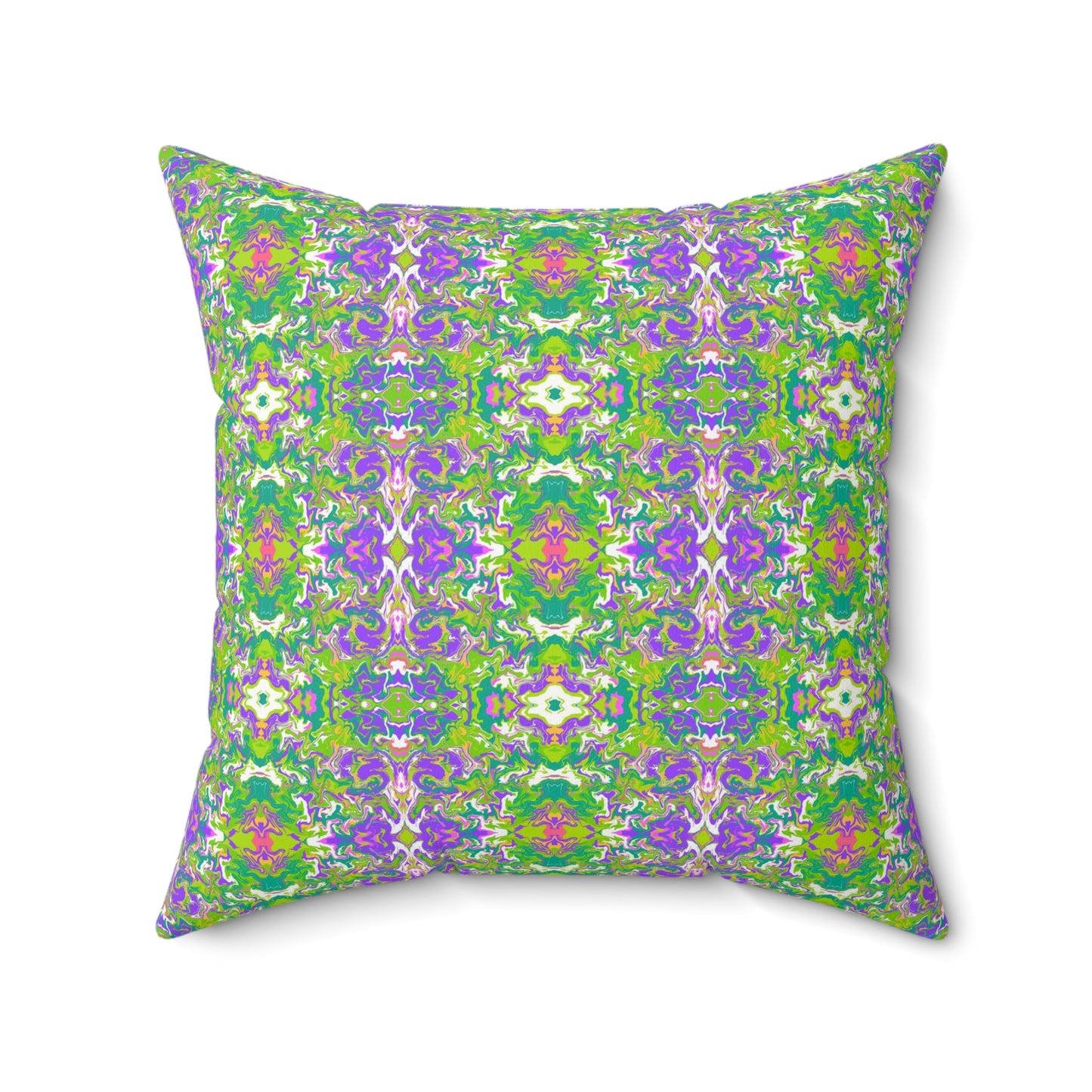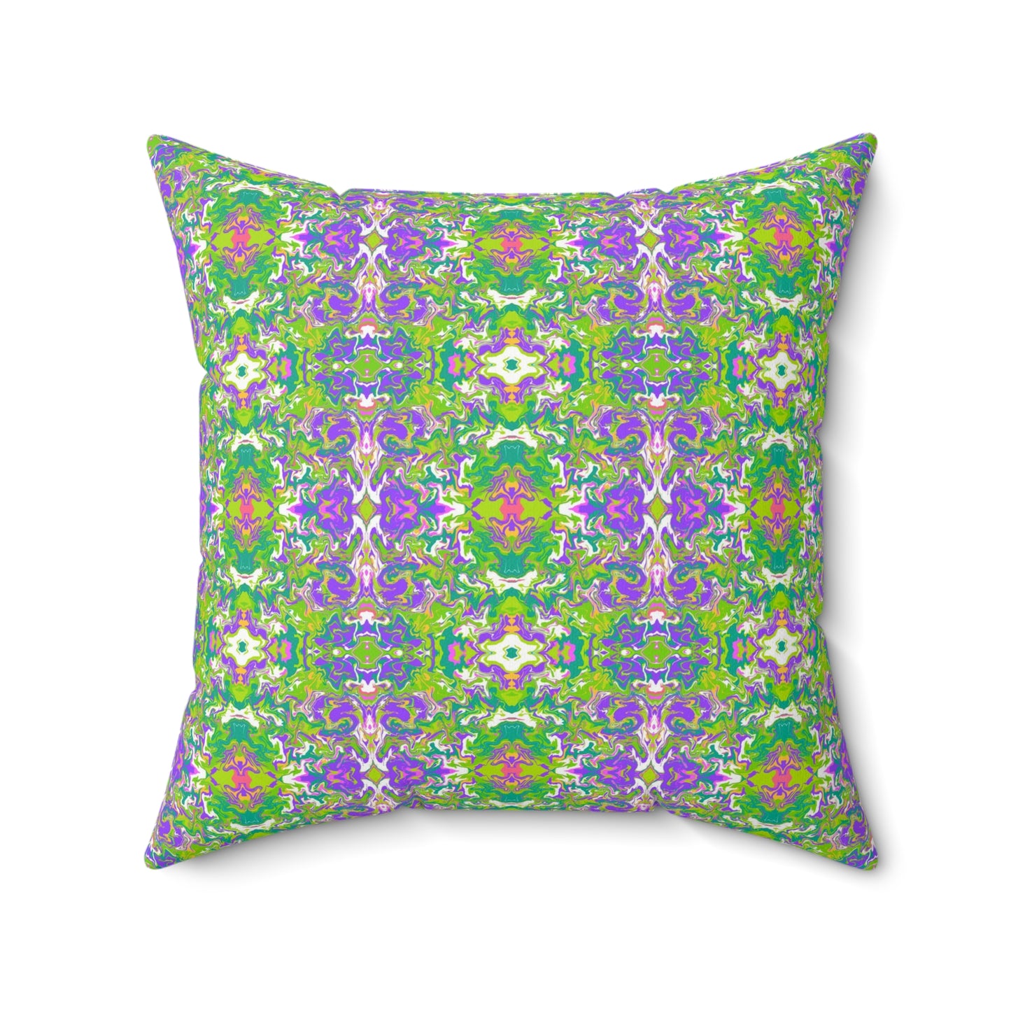 Introducing the mesmerizing spun polyester square throw pillow featuring an intricate boho style abstract spring garden design. This stunning pillow showcases a vibrant color palette of purple, pink, gold, green, and turquoise, bringing a burst of energy and life to any space. The high-quality spun polyester material ensures durability and comfort, making it a perfect addition to your home decor.