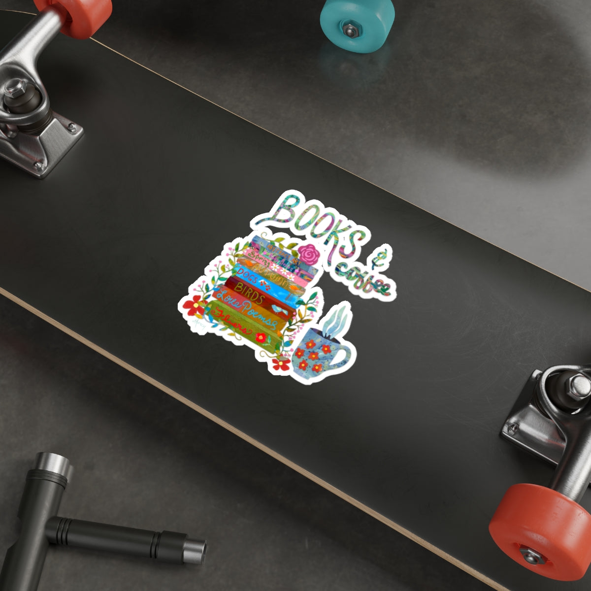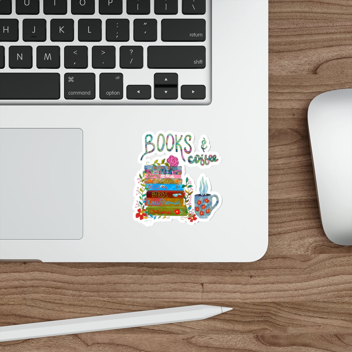 Add a touch of cozy charm to your favorite surfaces with my “Books and Coffee Collage” die-cut sticker! 📚☕✨ This colorful illustration features a vibrant stack of books with vines of pink flowers and leaves gracefully climbing on either side. A delicate pink rose rests on top, while a textured blue coffee cup with tiny orange flowers sits beside the stack, steam curling into the air. Hand-lettered in playful, boho-inspired style, the words “Books & Coffee” bring warmth and personality to this whimsical design. Perfect for decorating laptops, water bottles, notebooks, journals, or anywhere you want to show off your love for reading and coffee!