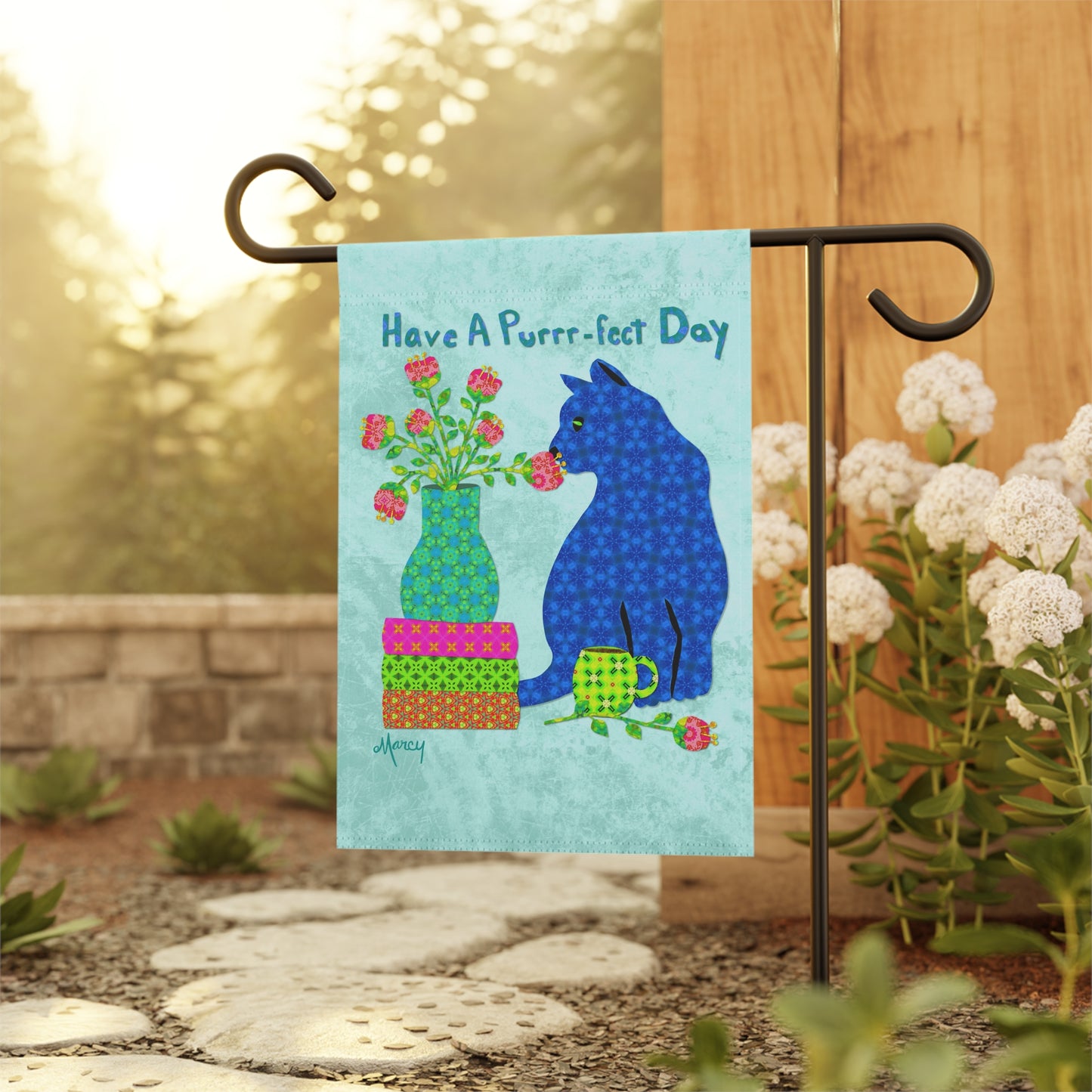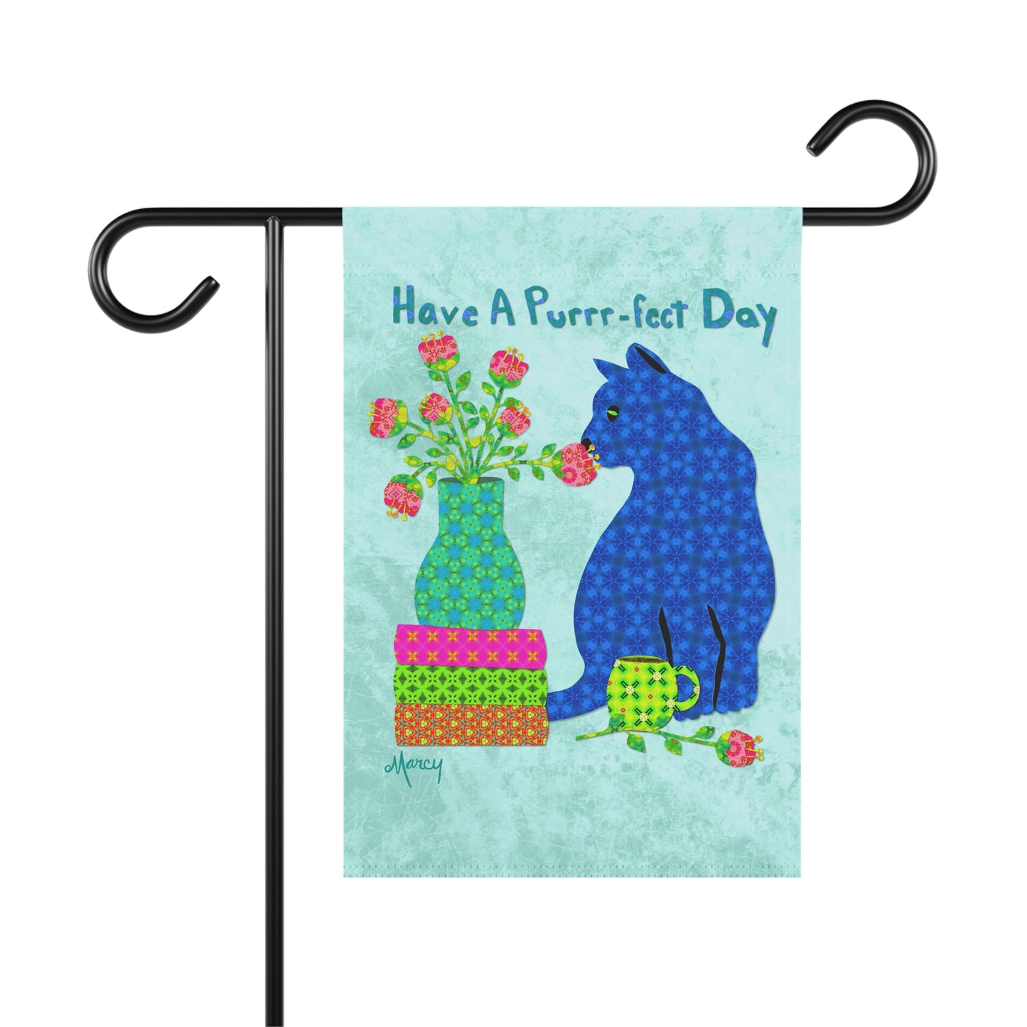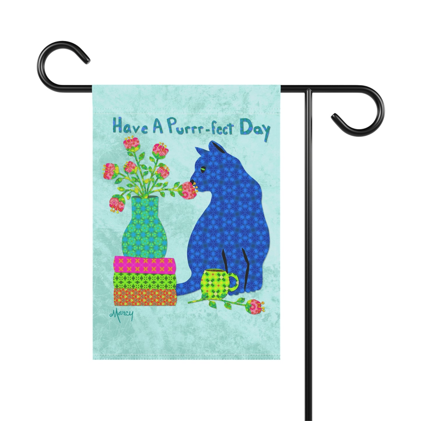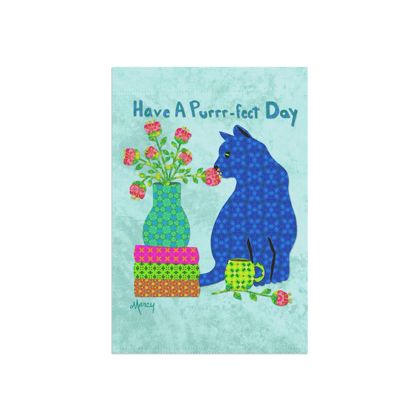 Floating above the scene is a hand-lettered message: “Have a Purrr-fect Day”, created in cheerful turquoise-patterned paper. The artwork is set against a tranquil light aqua background that brings calm, joy, and personality to your garden, porch, or patio.