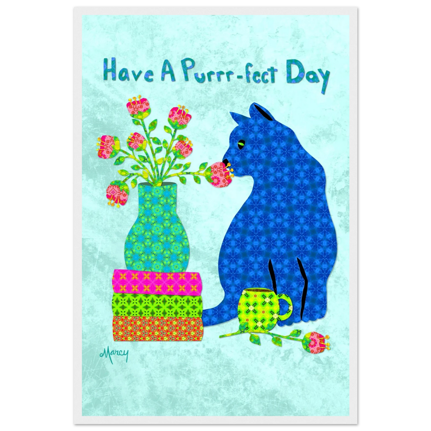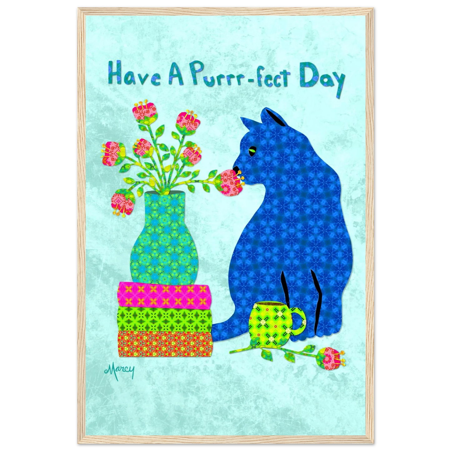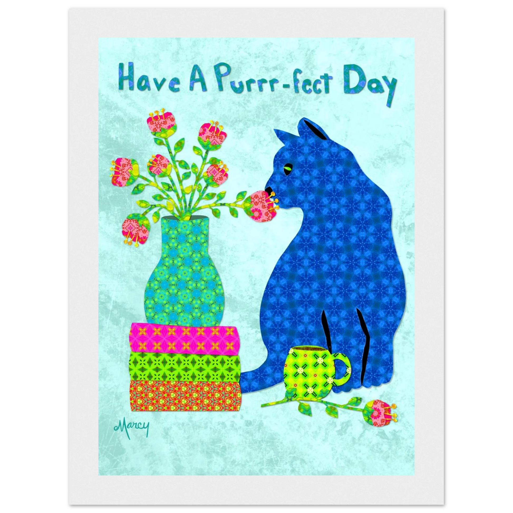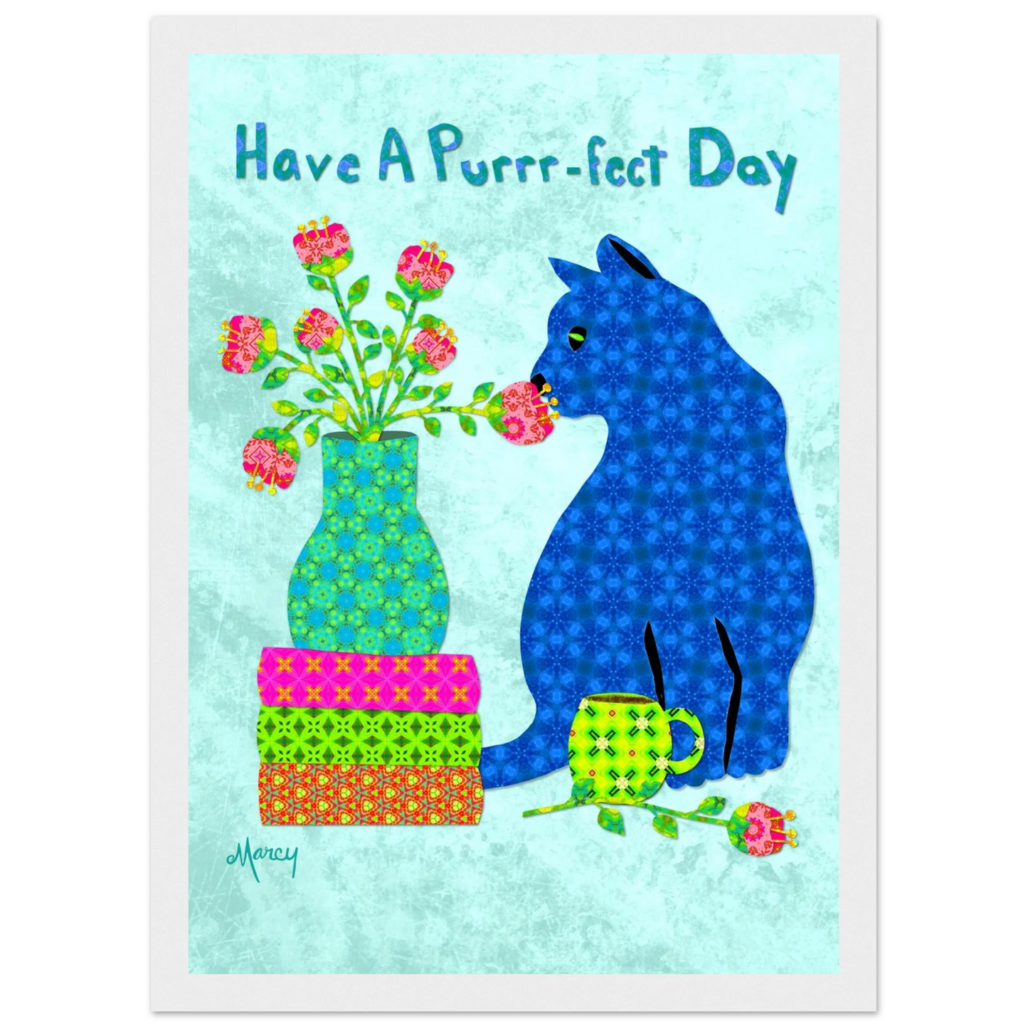 A cheerful hand-lettered quote—“Have a Purrr-fect Day”—floats above in turquoise-patterned lettering, all set against a soft light aqua background that enhances the playfulness and calm of the piece.