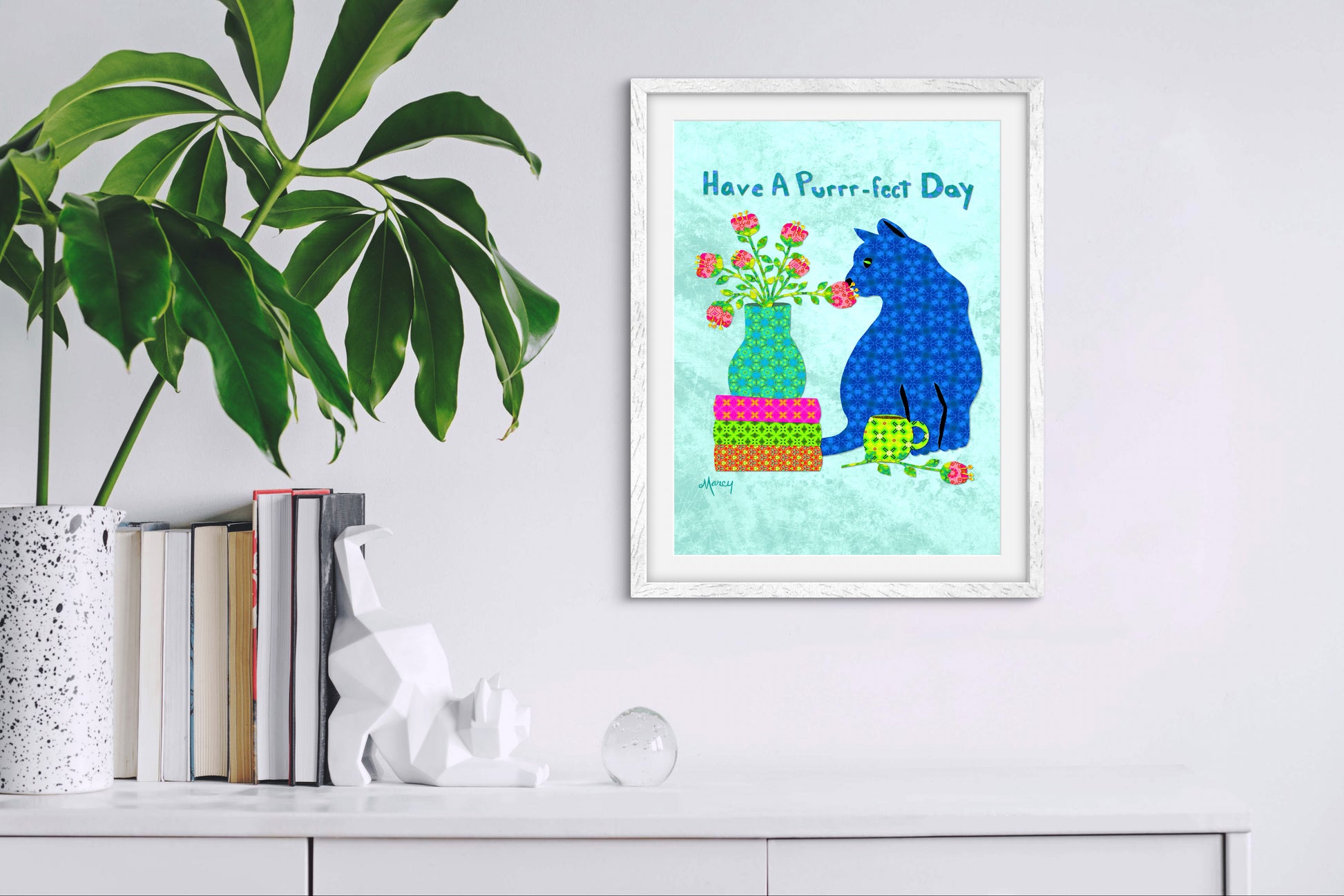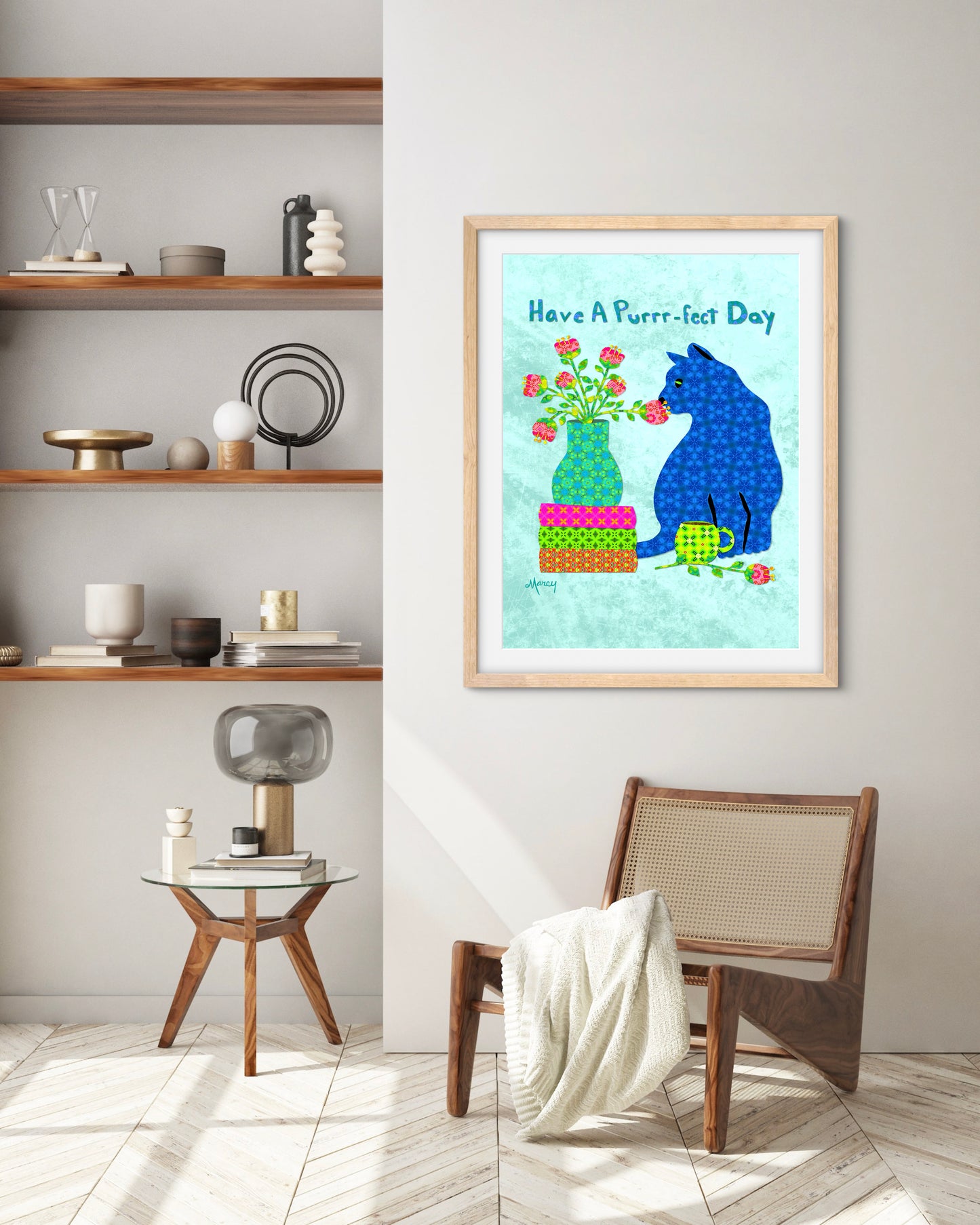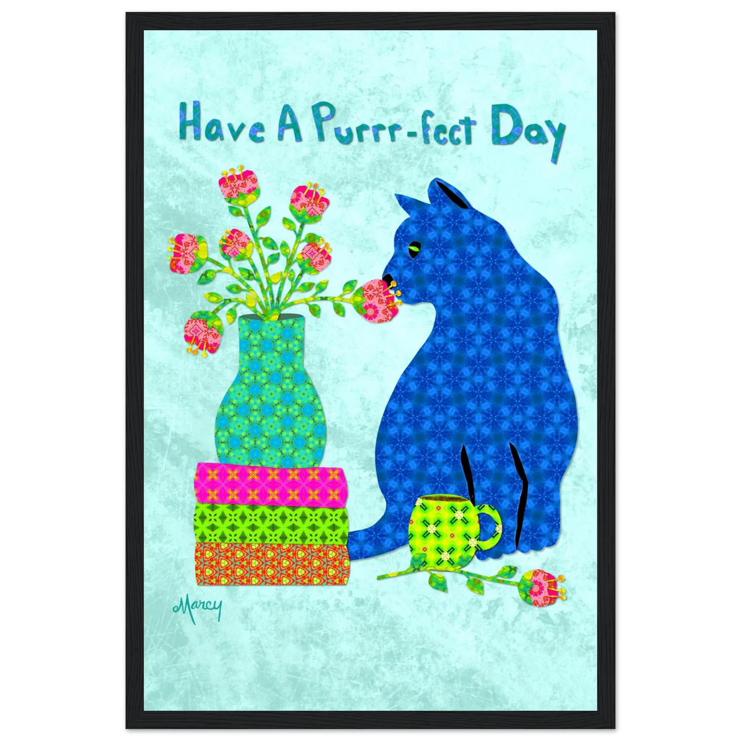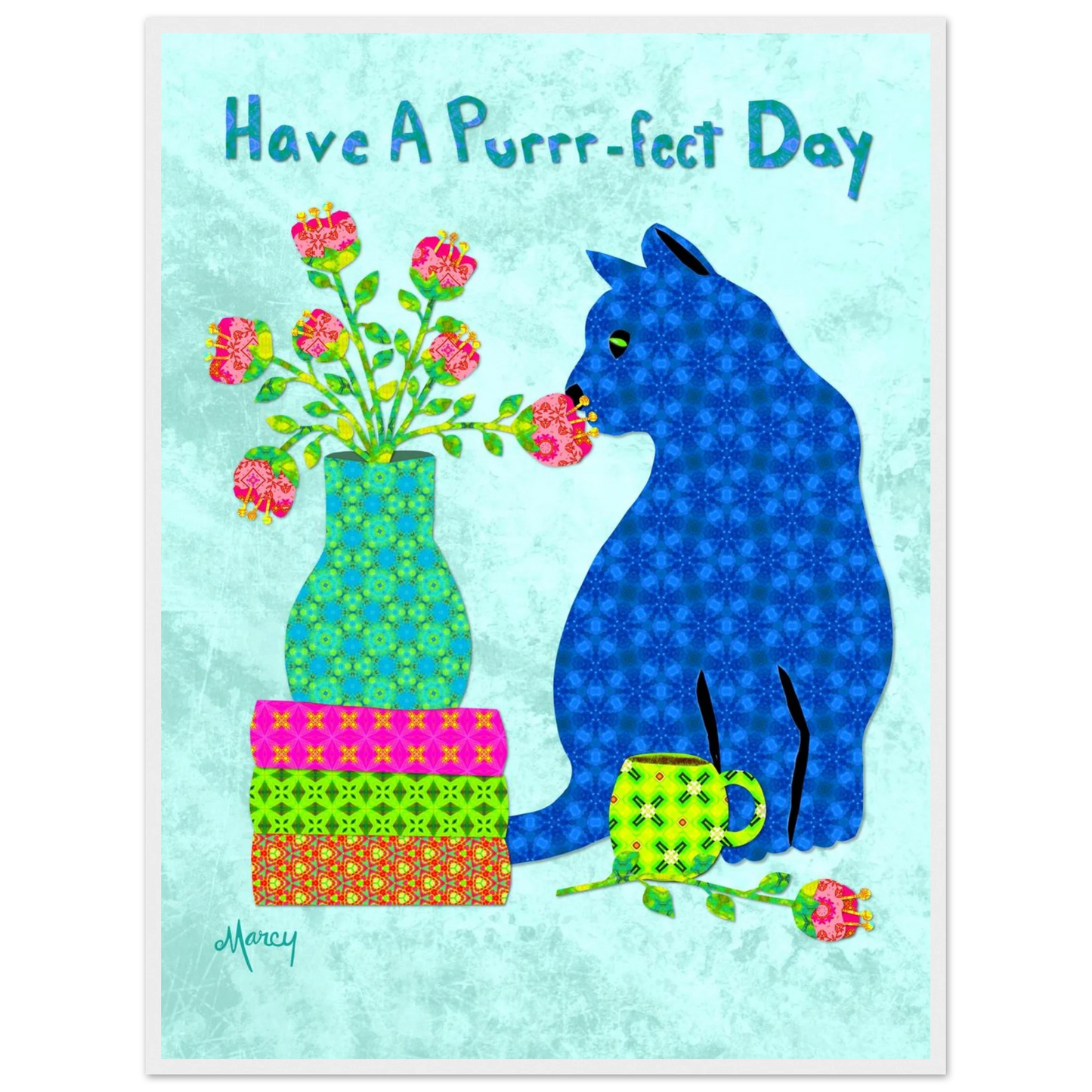 A cheerful hand-lettered quote—“Have a Purrr-fect Day”—floats above in turquoise-patterned lettering, all set against a soft light aqua background that enhances the playfulness and calm of the piece.