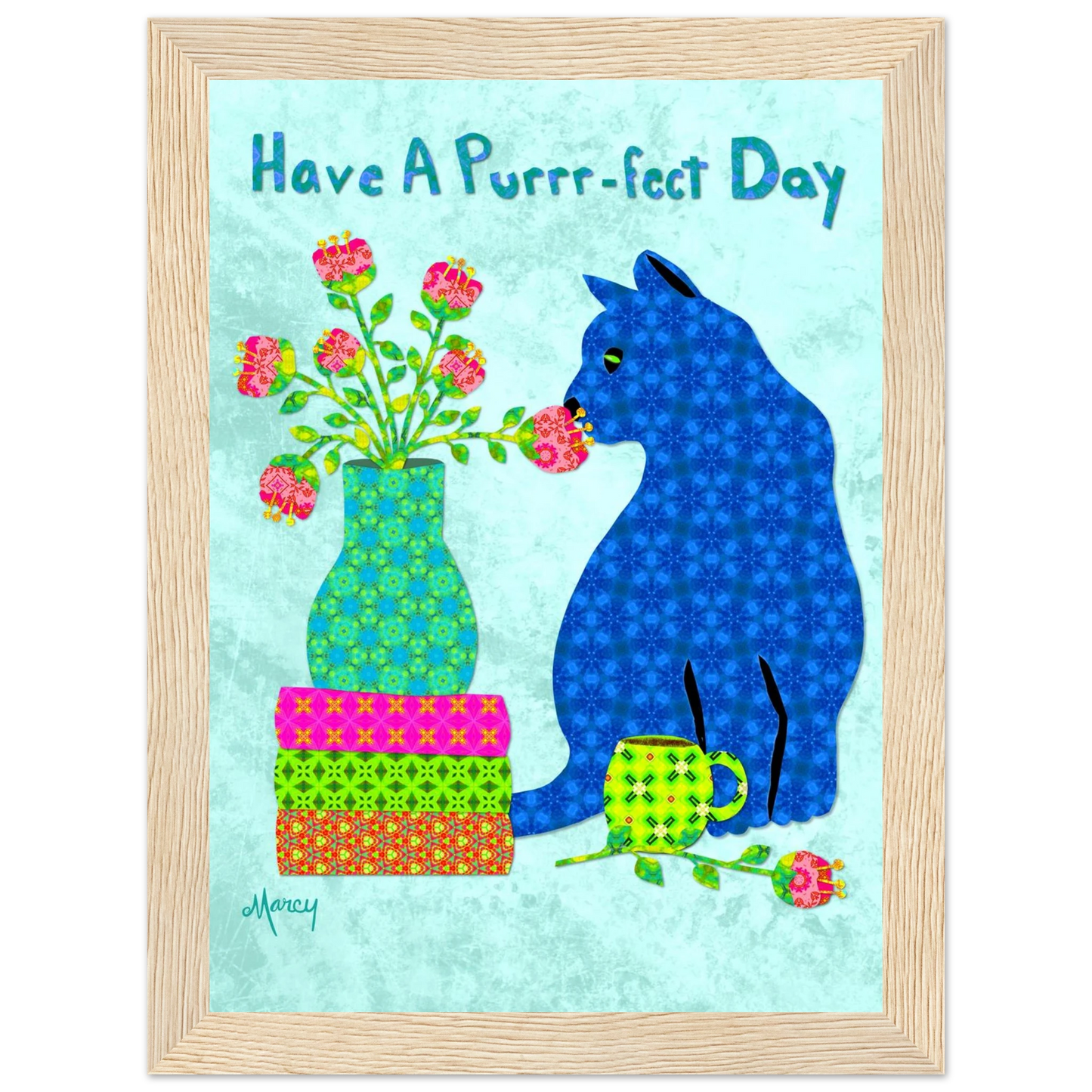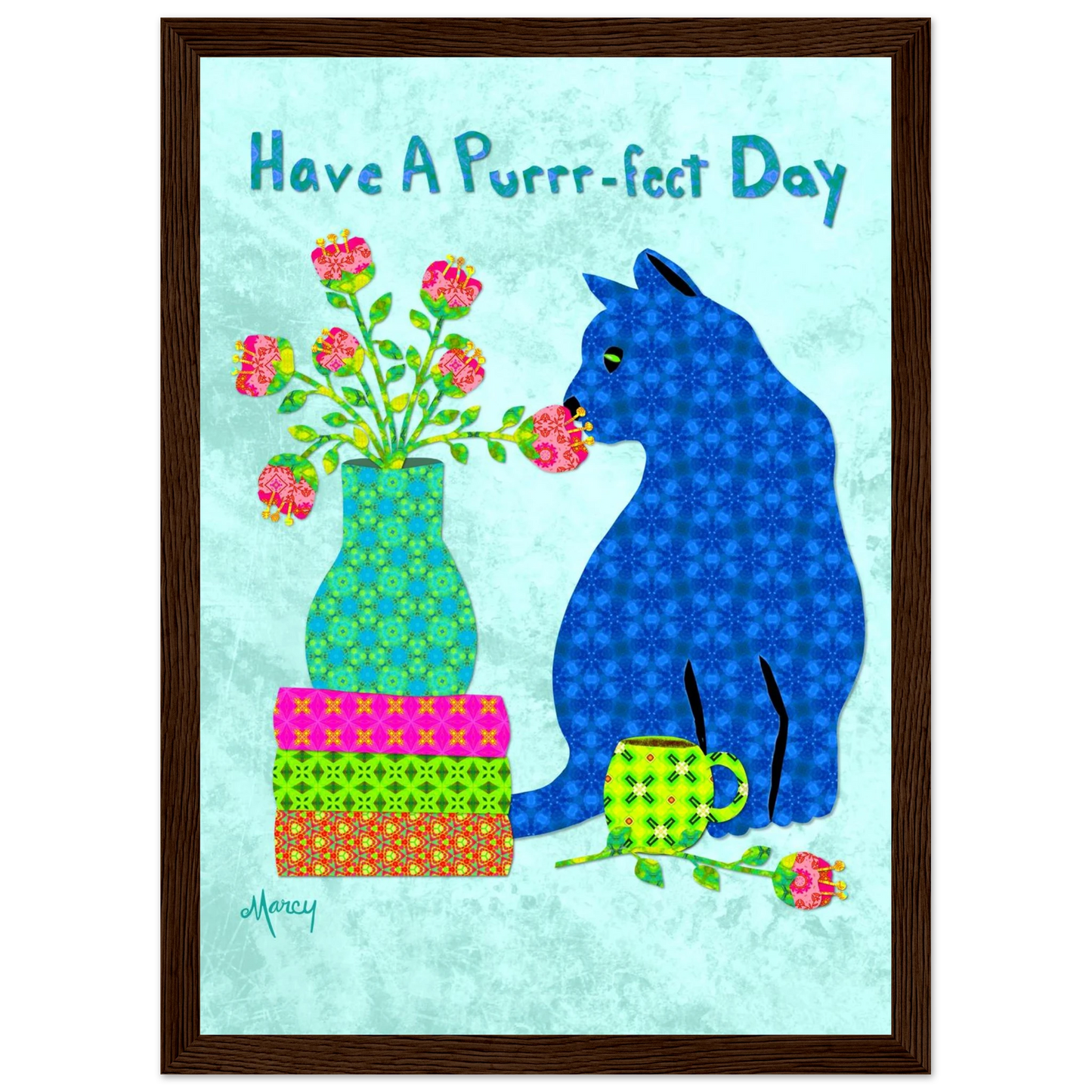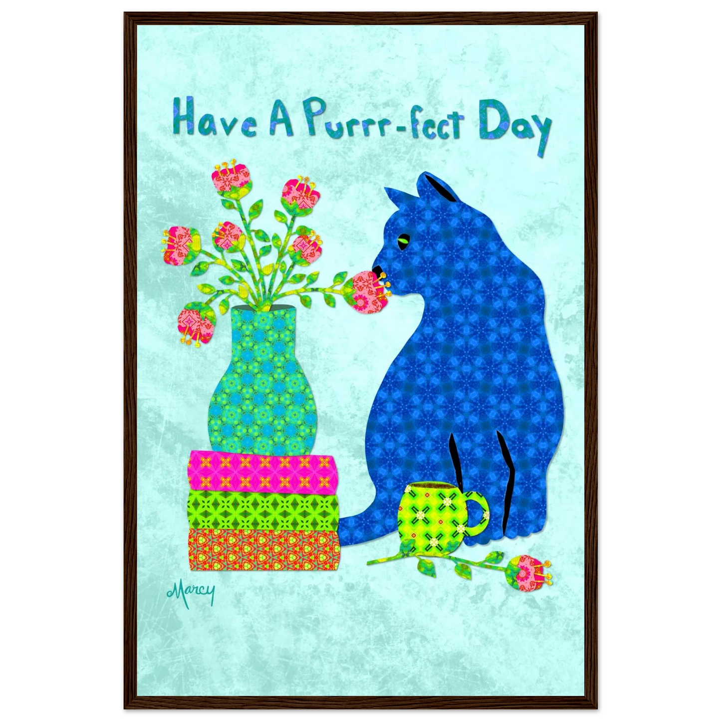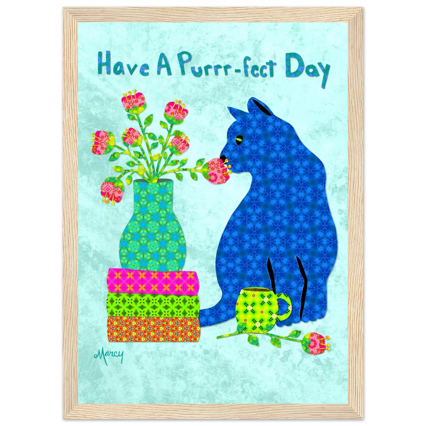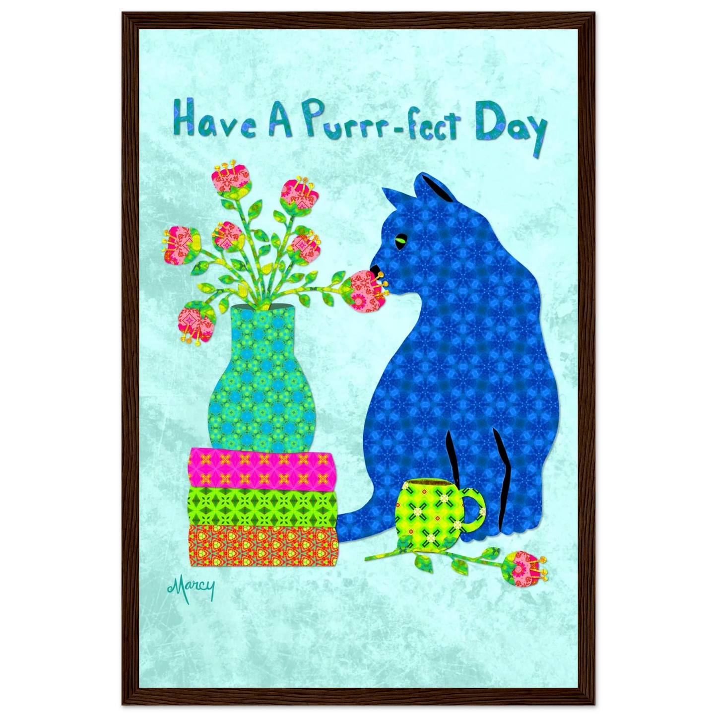 A cheerful hand-lettered quote—“Have a Purrr-fect Day”—floats above in turquoise-patterned lettering, all set against a soft light aqua background that enhances the playfulness and calm of the piece.