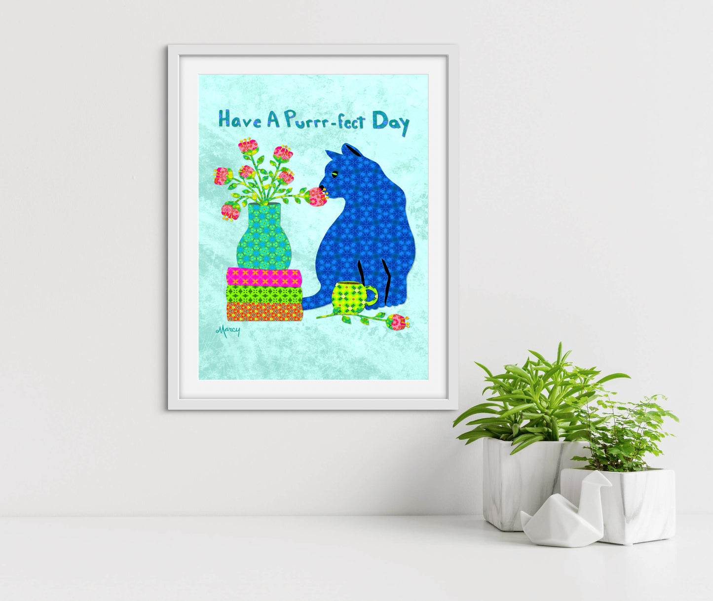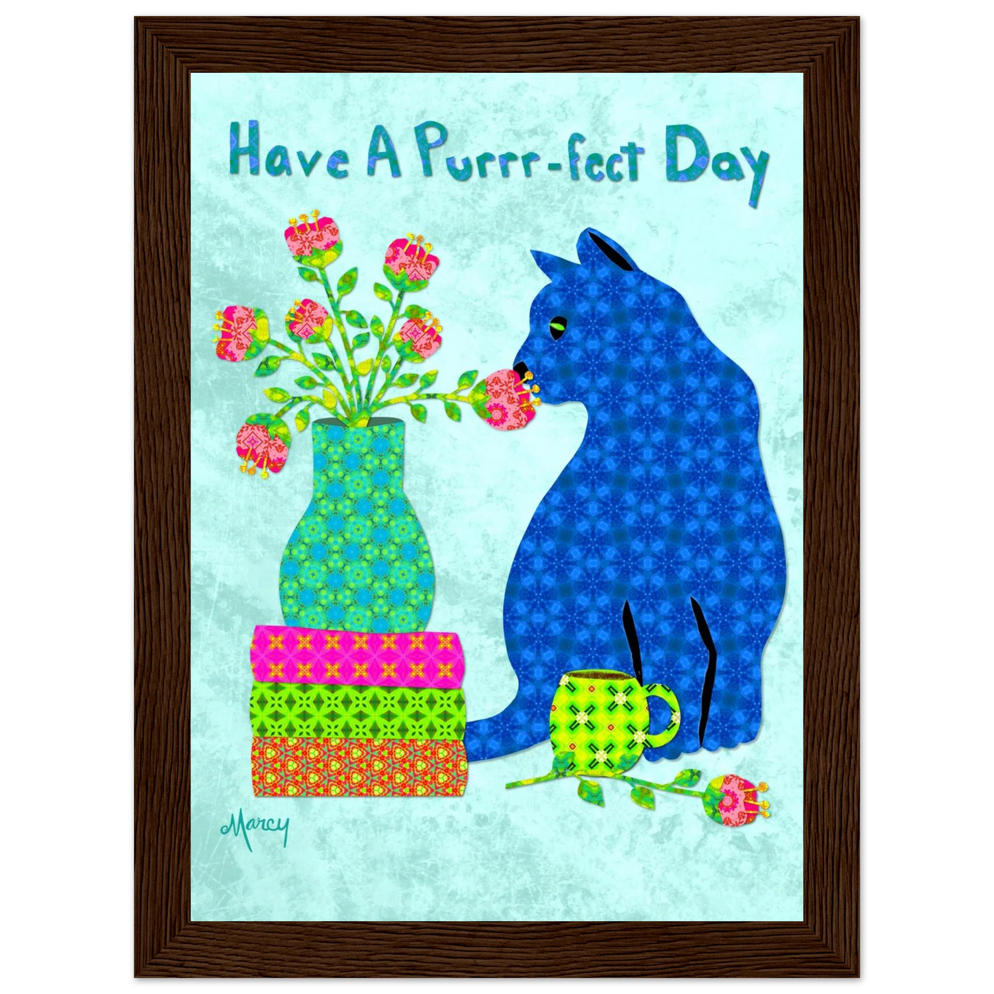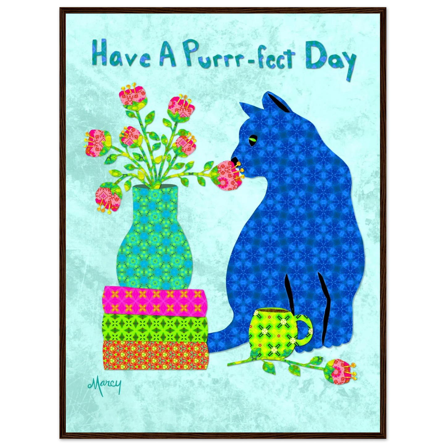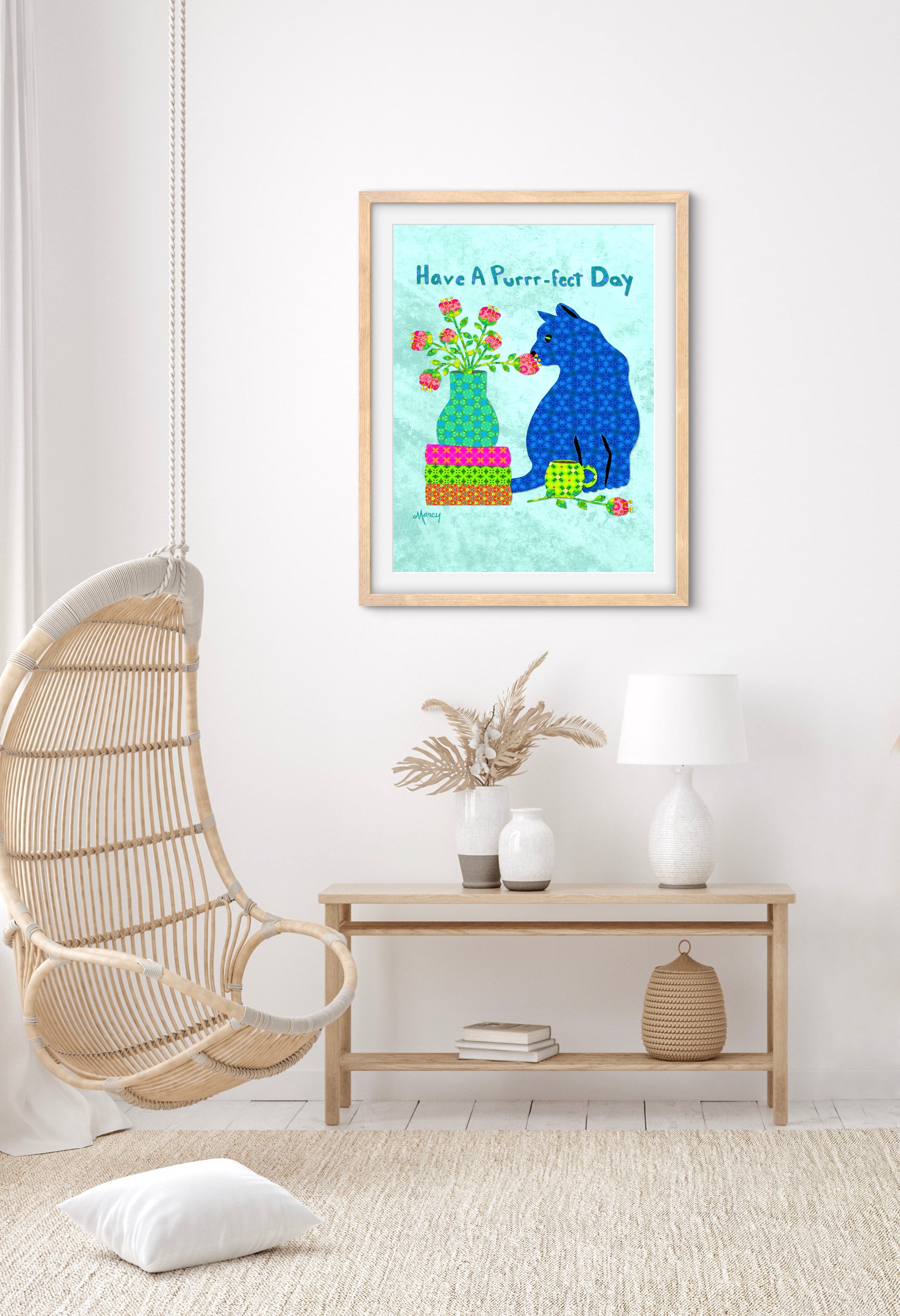 A cheerful hand-lettered quote—“Have a Purrr-fect Day”—floats above in turquoise-patterned lettering, all set against a soft light aqua background that enhances the playfulness and calm of the piece.