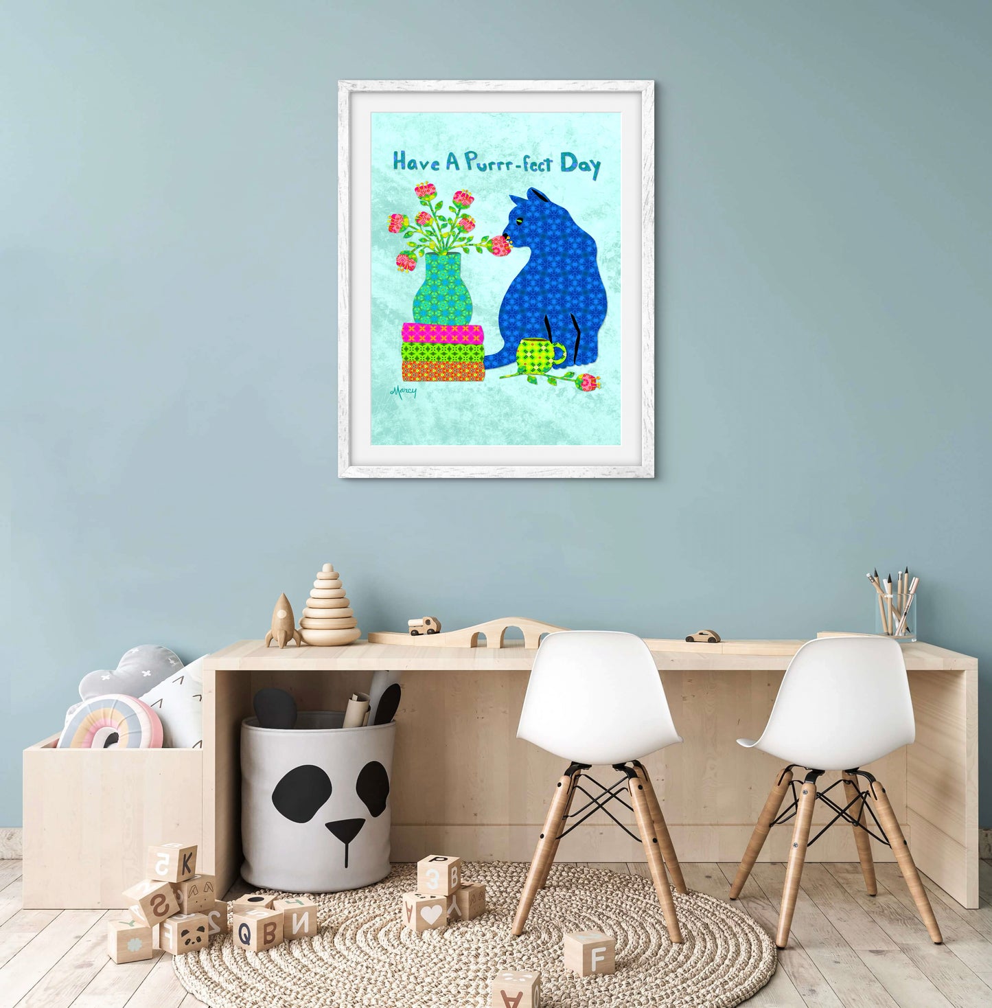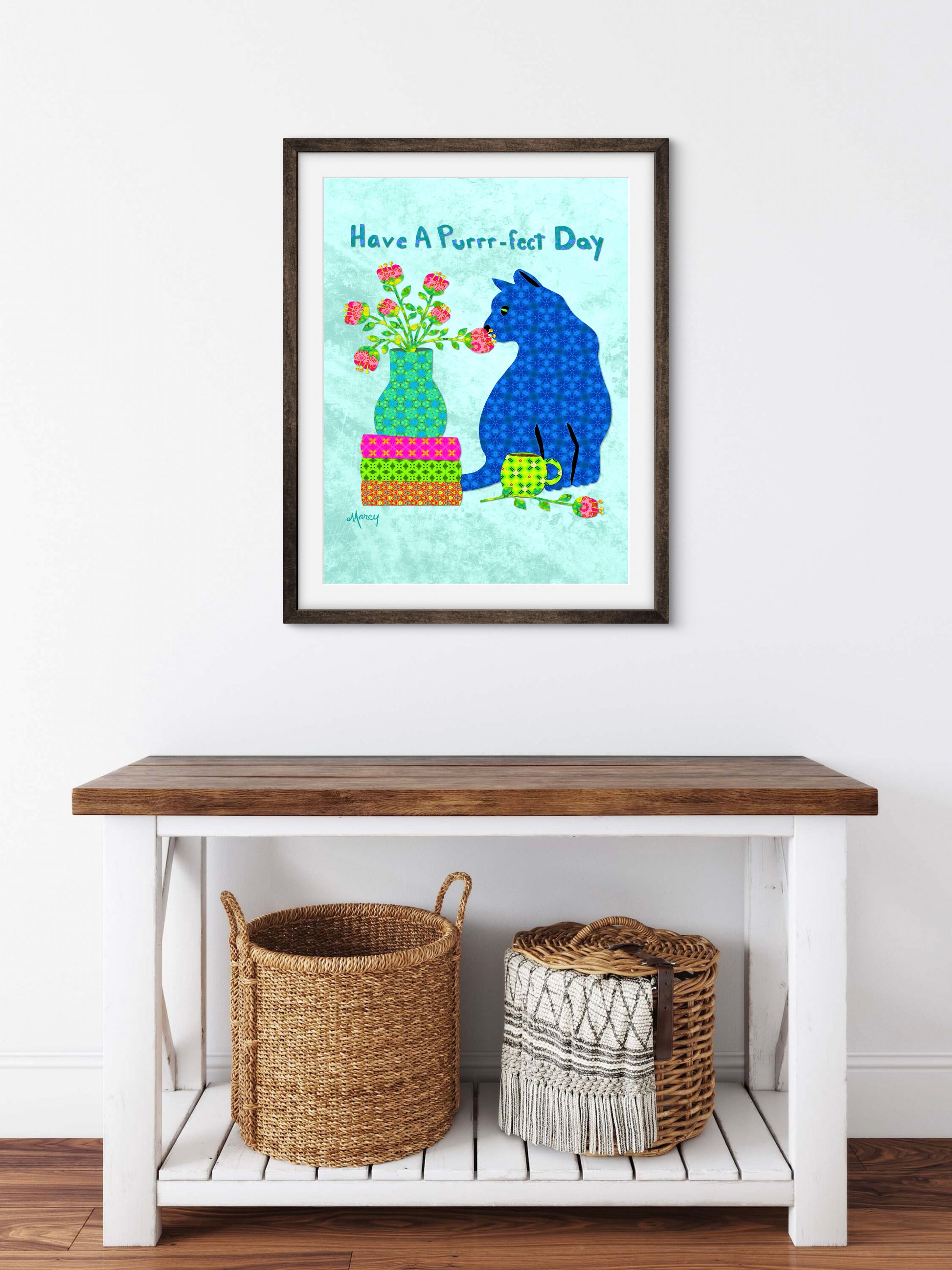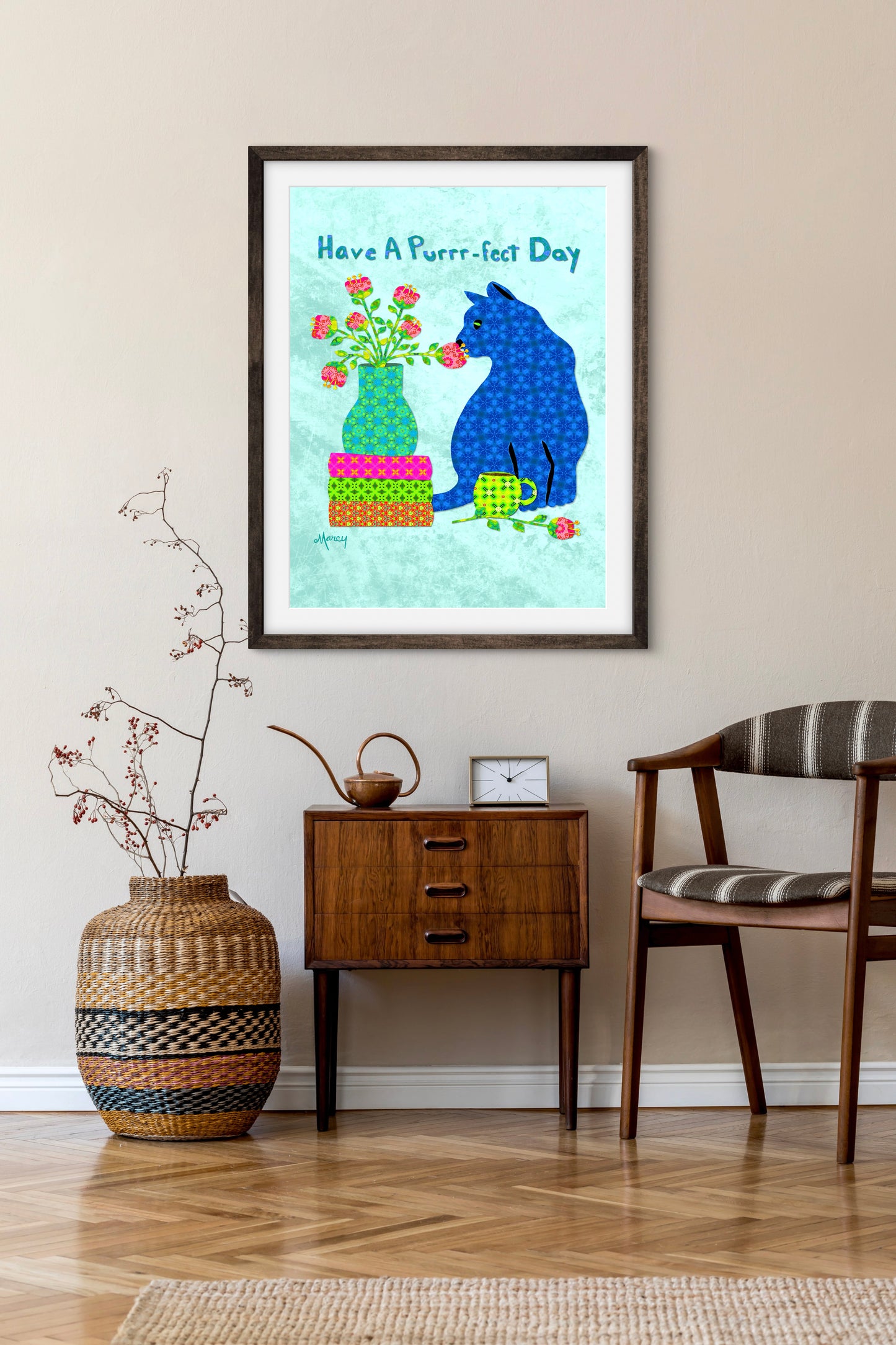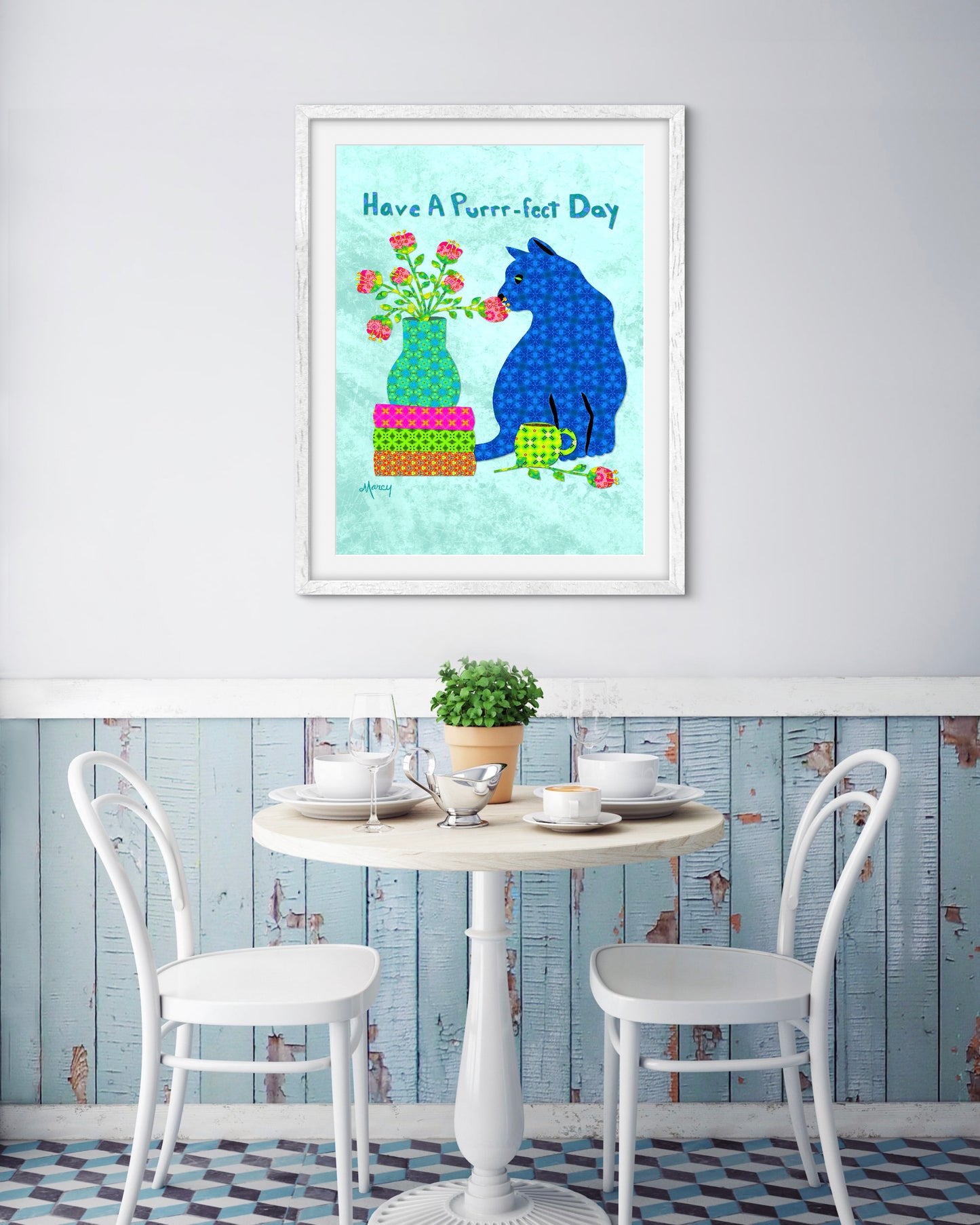 A cheerful hand-lettered quote—“Have a Purrr-fect Day”—floats above in turquoise-patterned lettering, all set against a soft light aqua background that enhances the playfulness and calm of the piece.