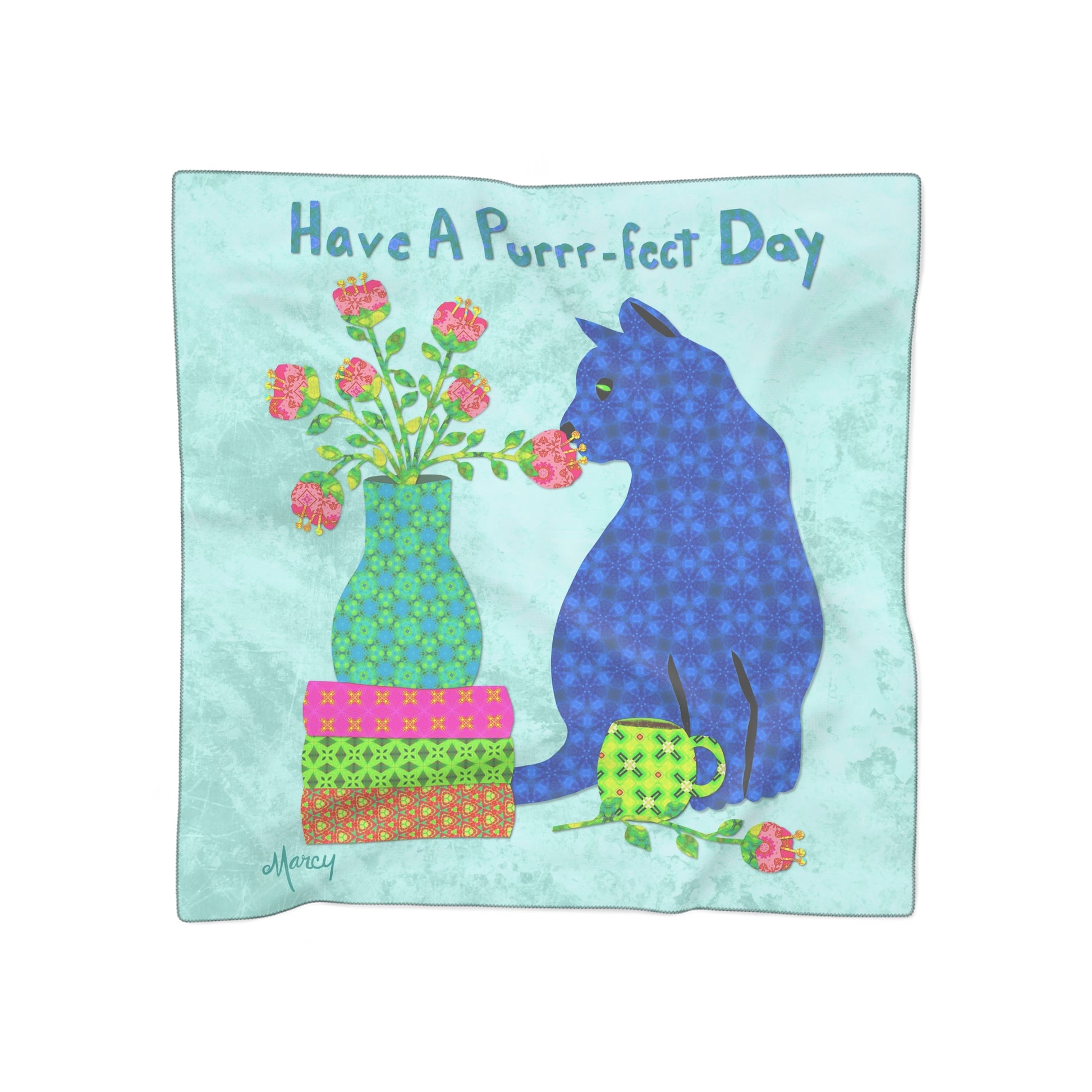 Wrap yourself in charm and color with this vibrant “Cat Collage” square poly scarf. This delightful accessory features a collage-style blue cat crafted from colorful patterned papers, pausing to smell soft pink tulips nestled in a turquoise vase. The vase rests atop three cheerful books, while a lime green patterned mug and a single tulip complete the cozy composition at the cat’s feet.