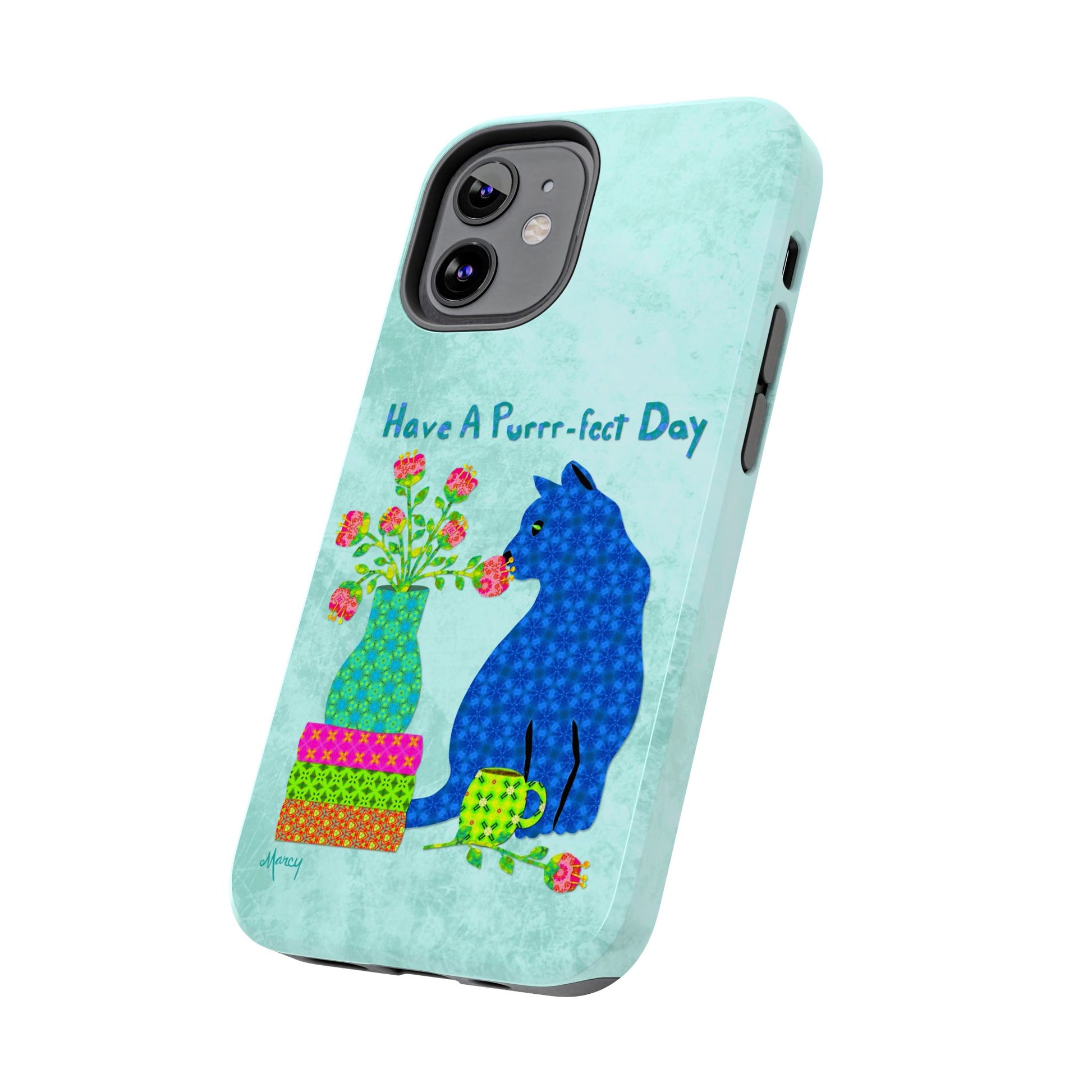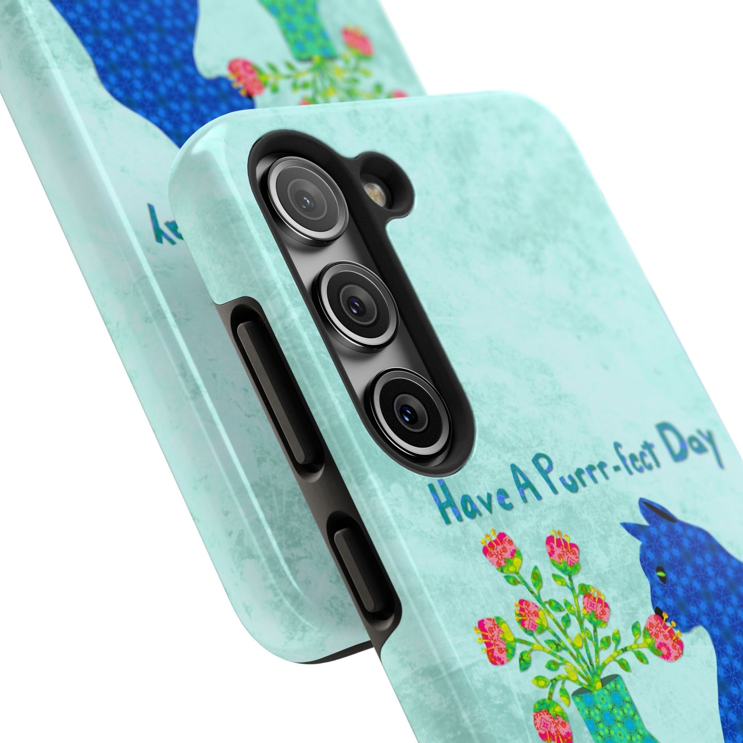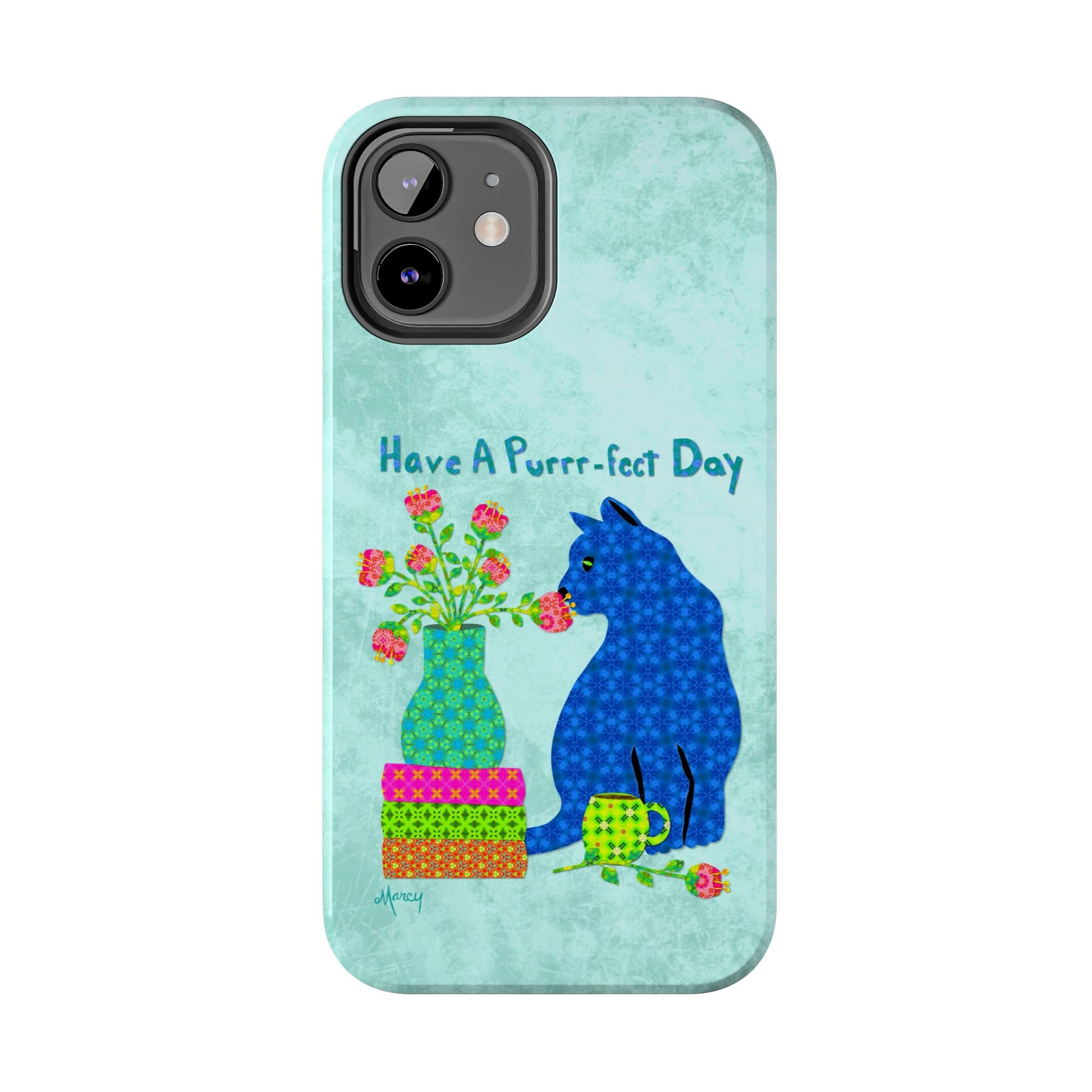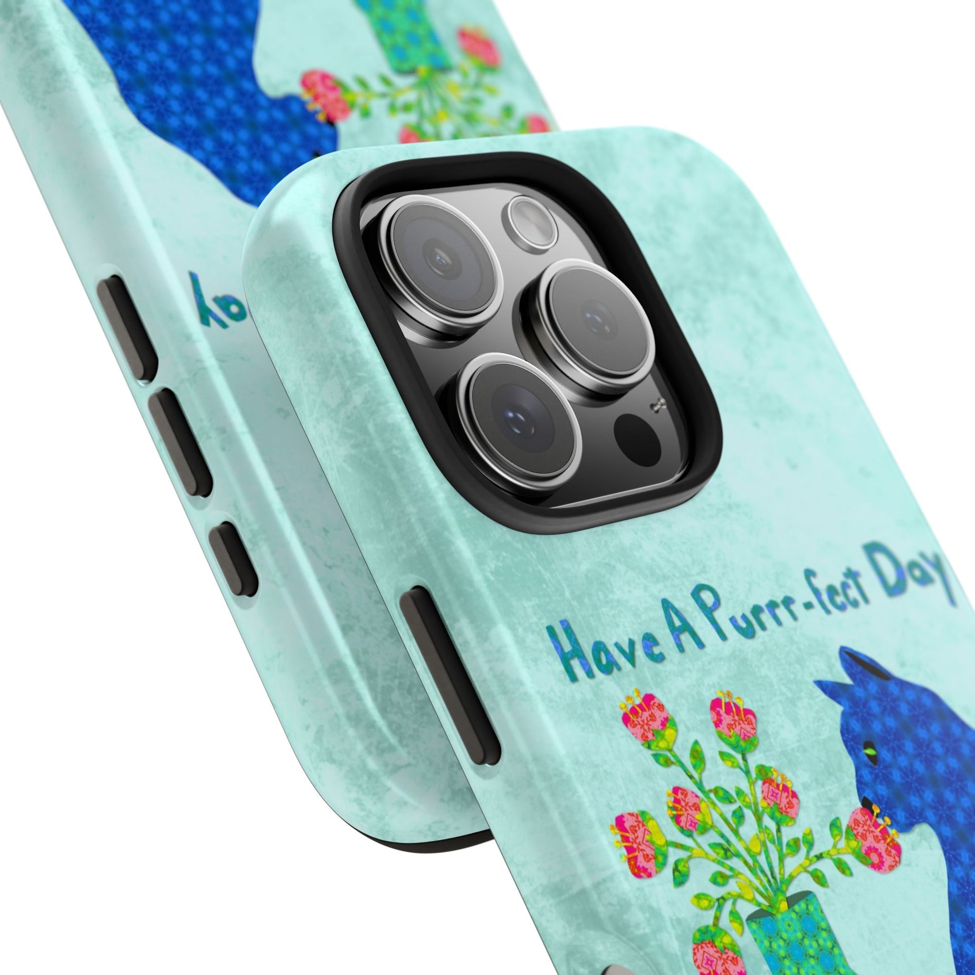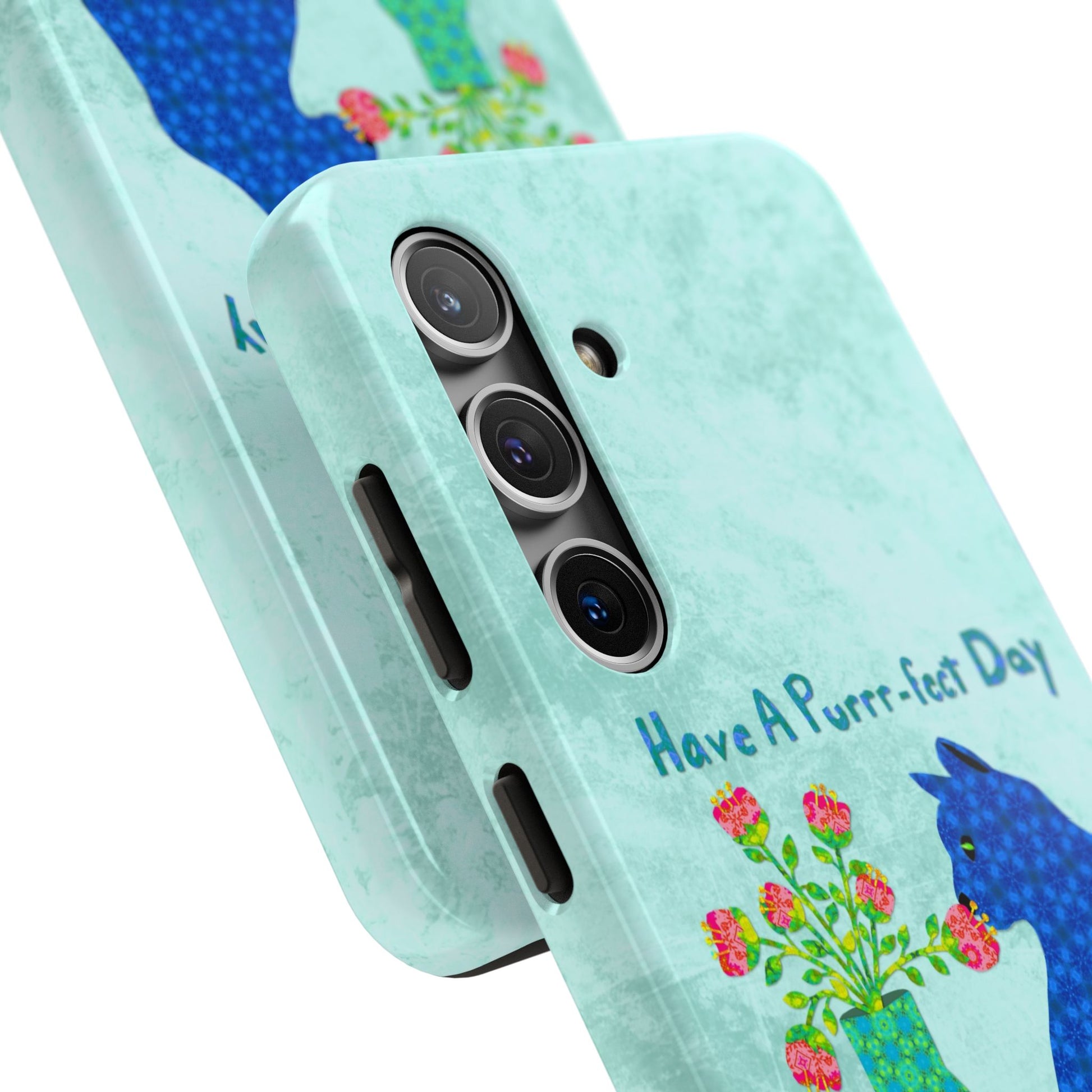 Topped with the hand-lettered phrase “Have a Purrr-fect Day” in coordinating turquoise patterns, the entire design is set against a calming light aqua background. It’s a cheerful, creative moment captured in art—now wrapped around your phone!