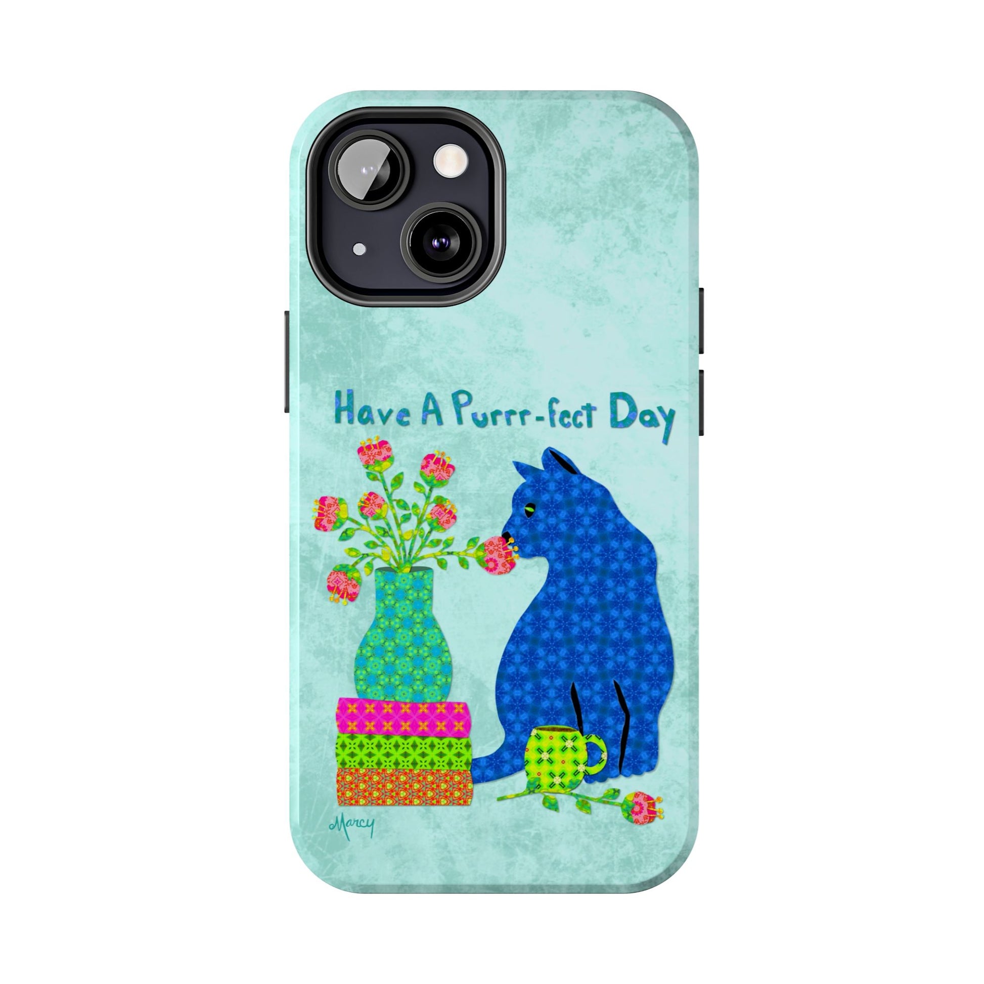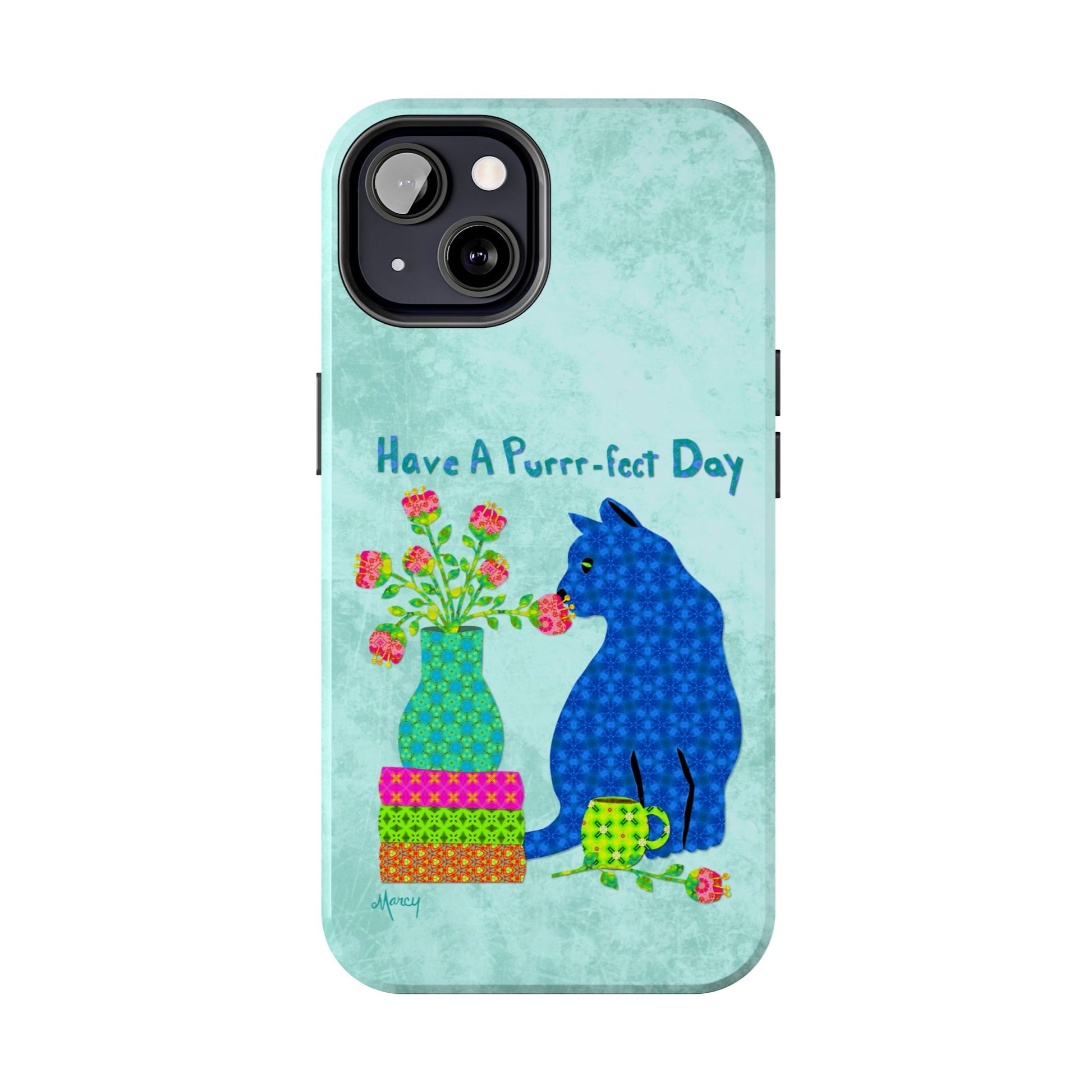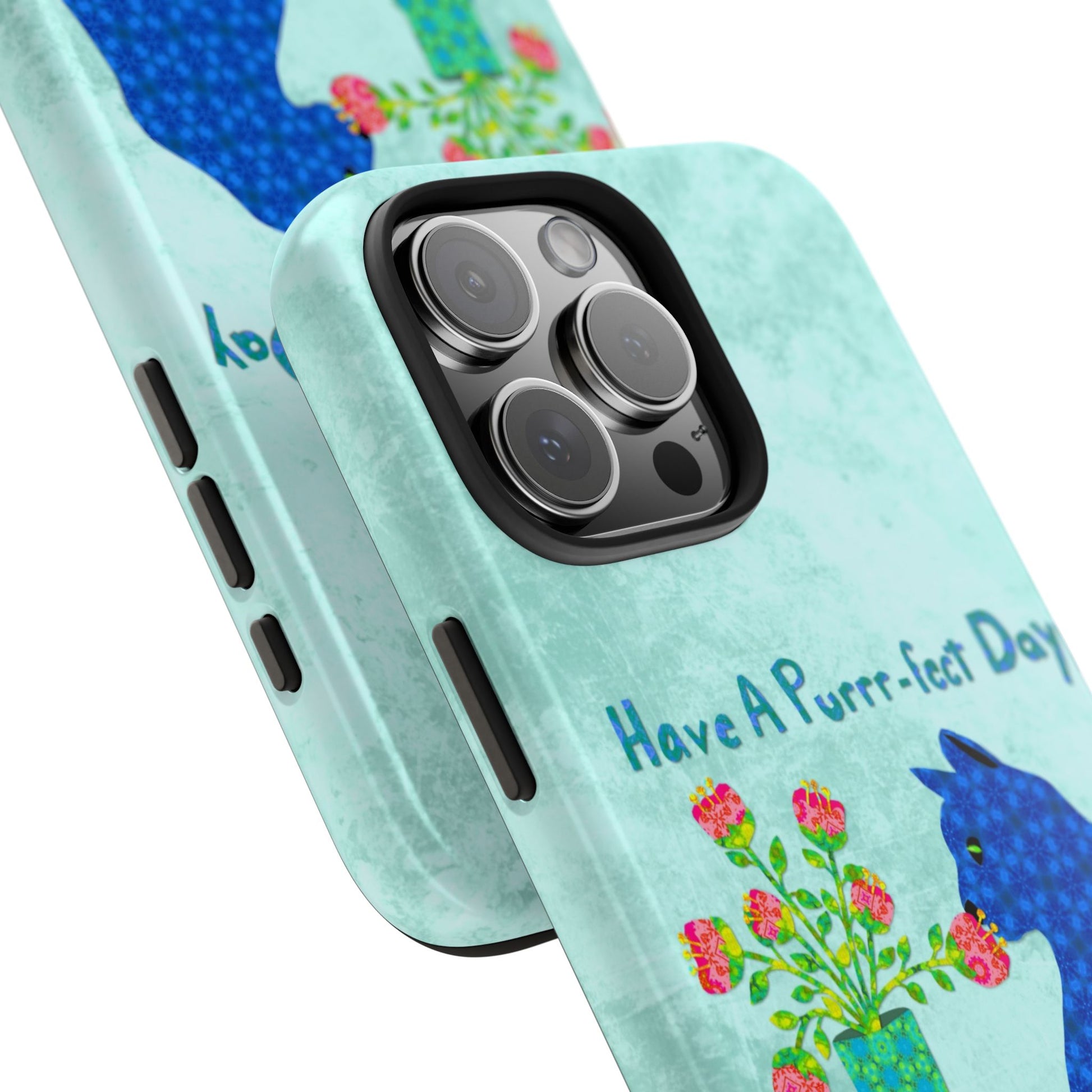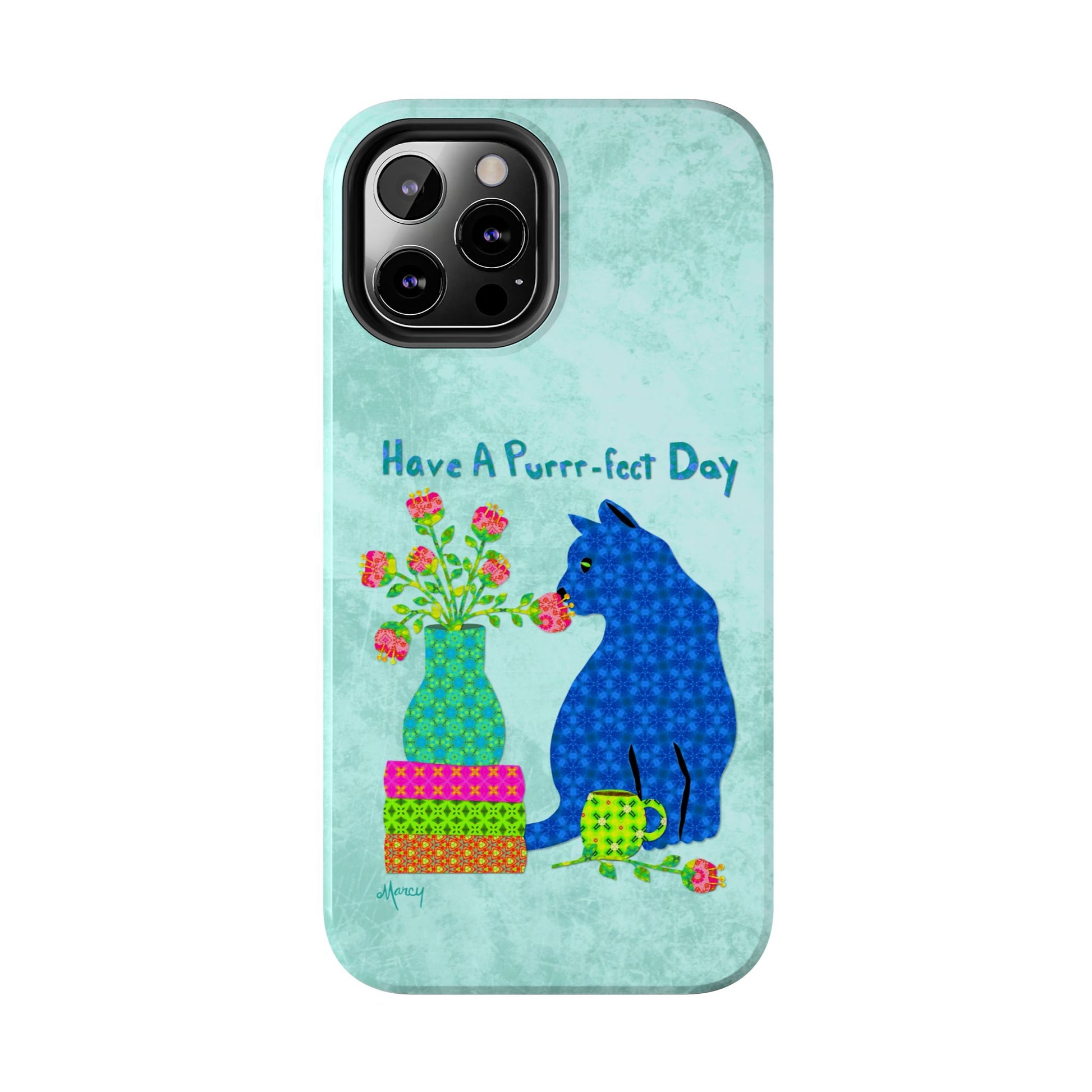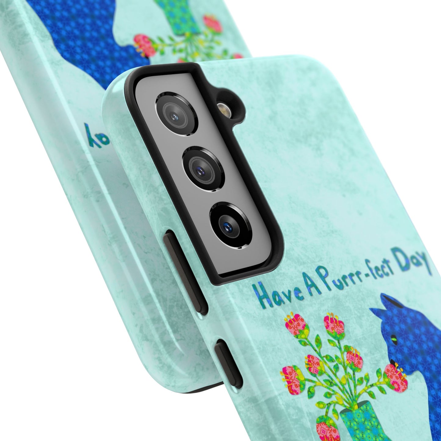 Topped with the hand-lettered phrase “Have a Purrr-fect Day” in coordinating turquoise patterns, the entire design is set against a calming light aqua background. It’s a cheerful, creative moment captured in art—now wrapped around your phone!