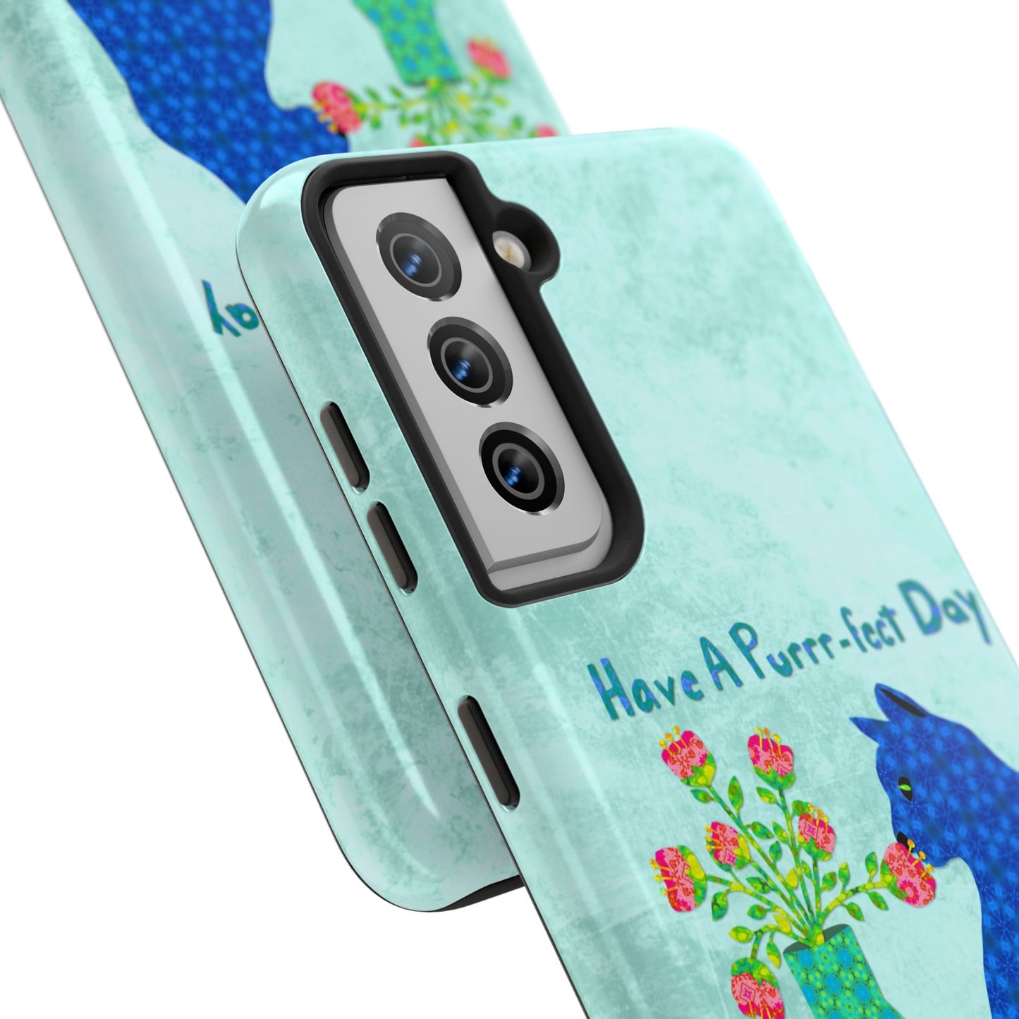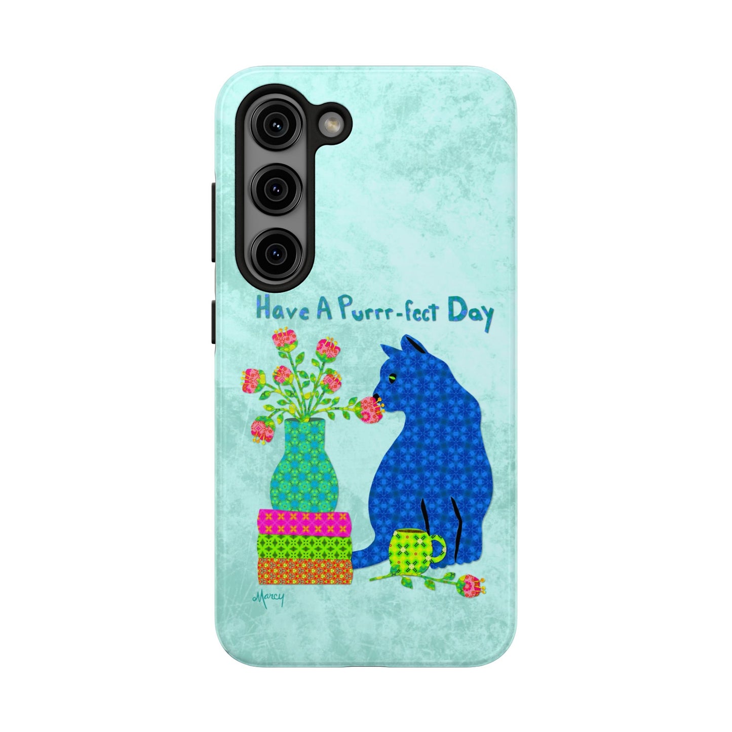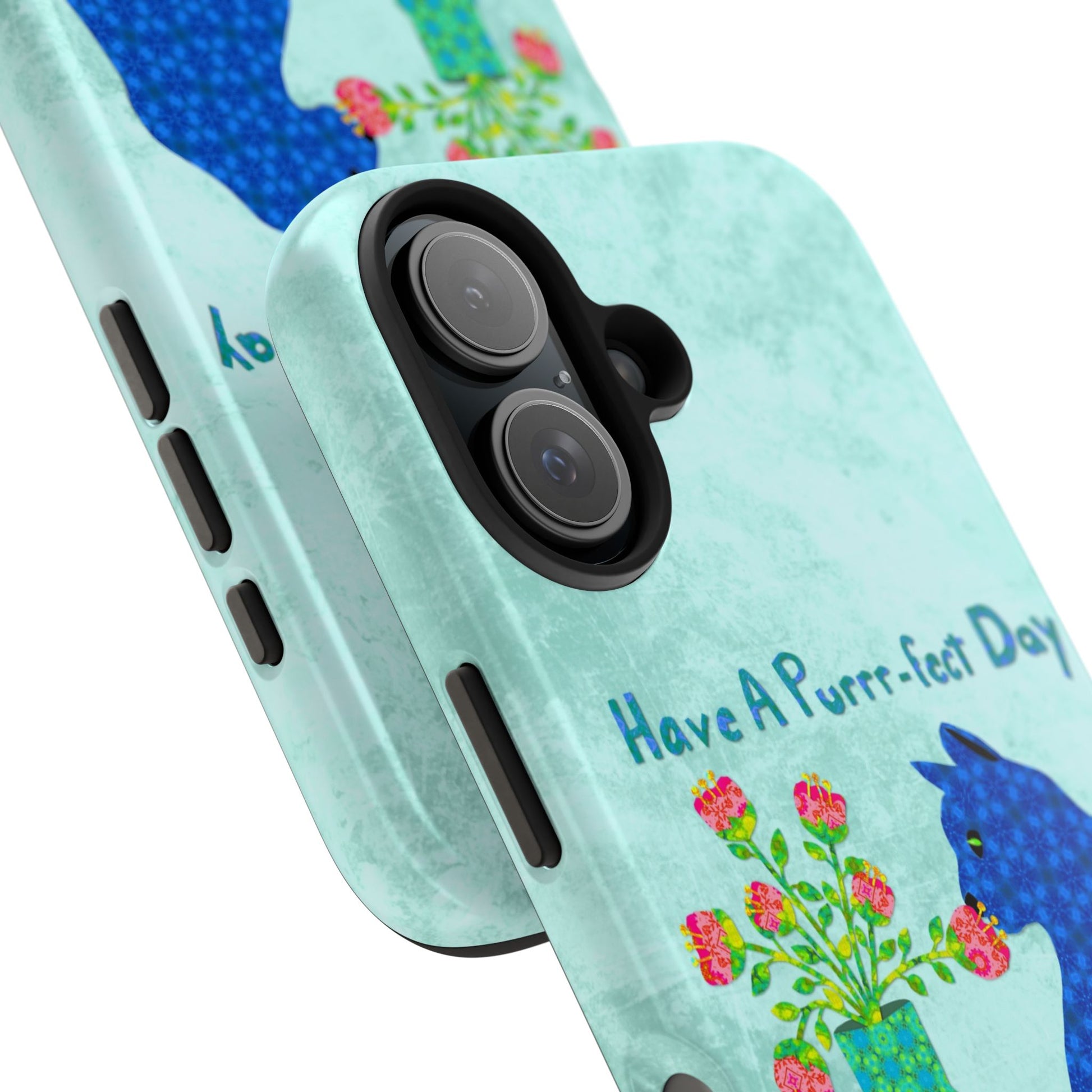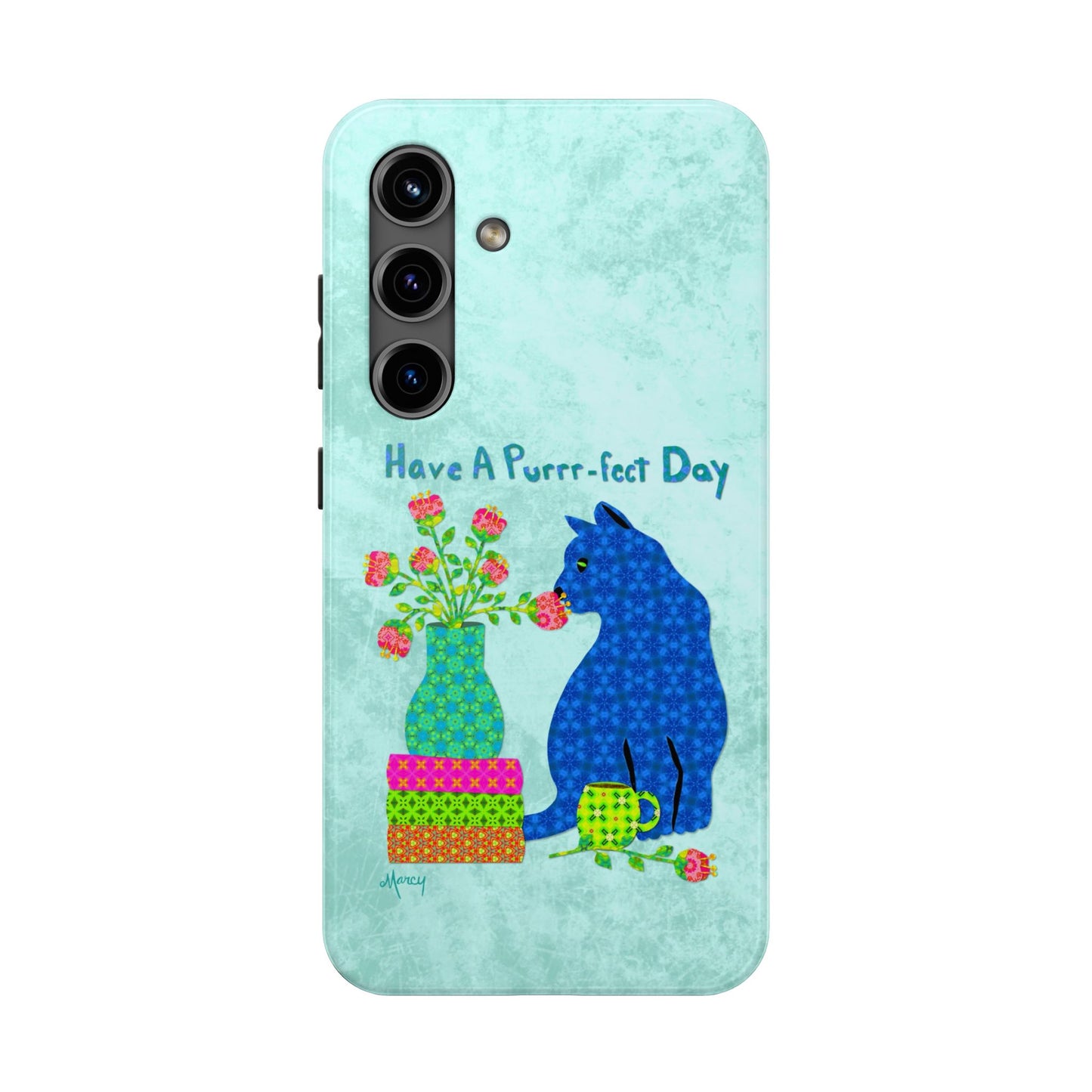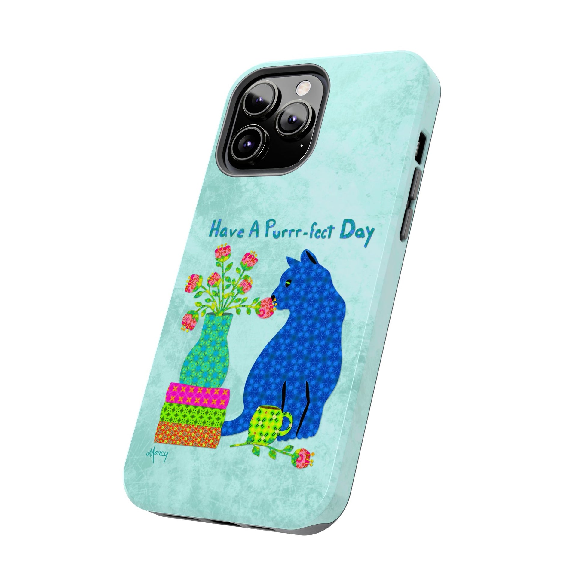 Topped with the hand-lettered phrase “Have a Purrr-fect Day” in coordinating turquoise patterns, the entire design is set against a calming light aqua background. It’s a cheerful, creative moment captured in art—now wrapped around your phone!