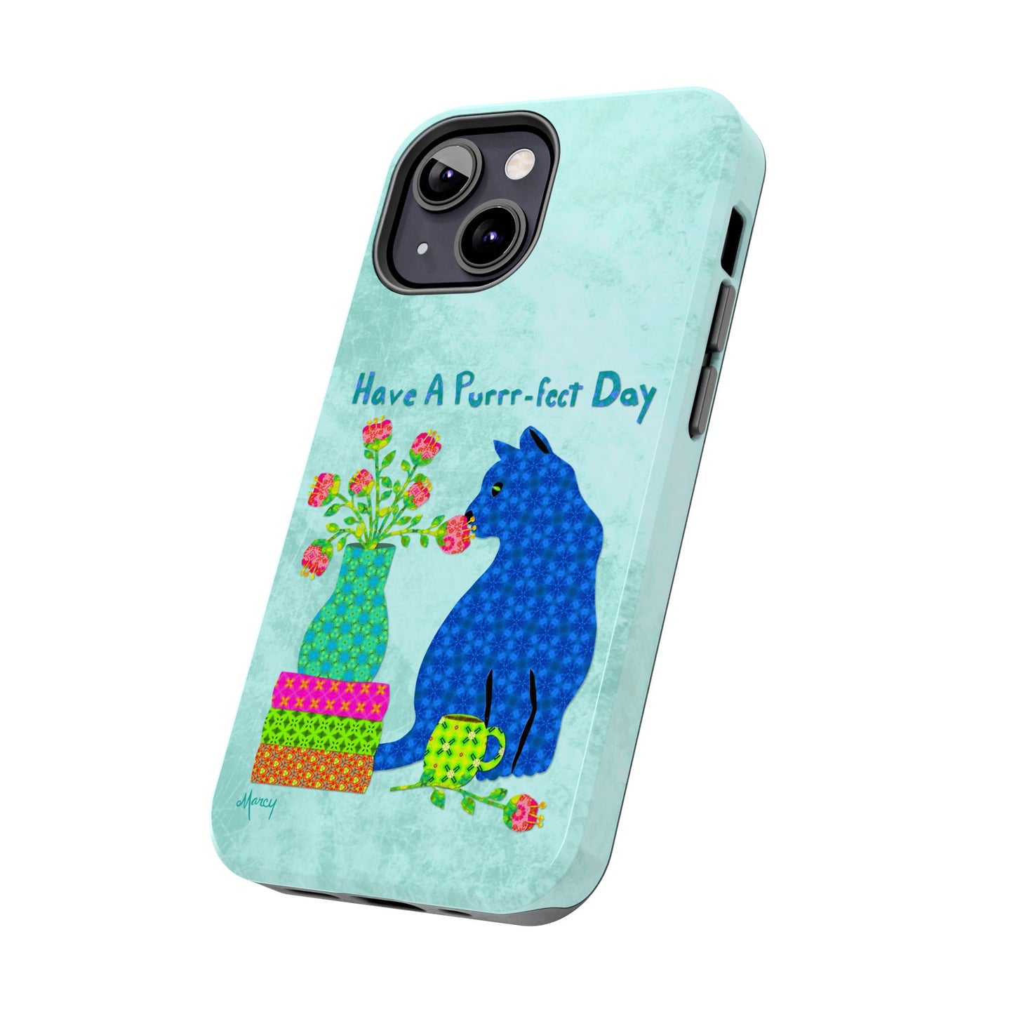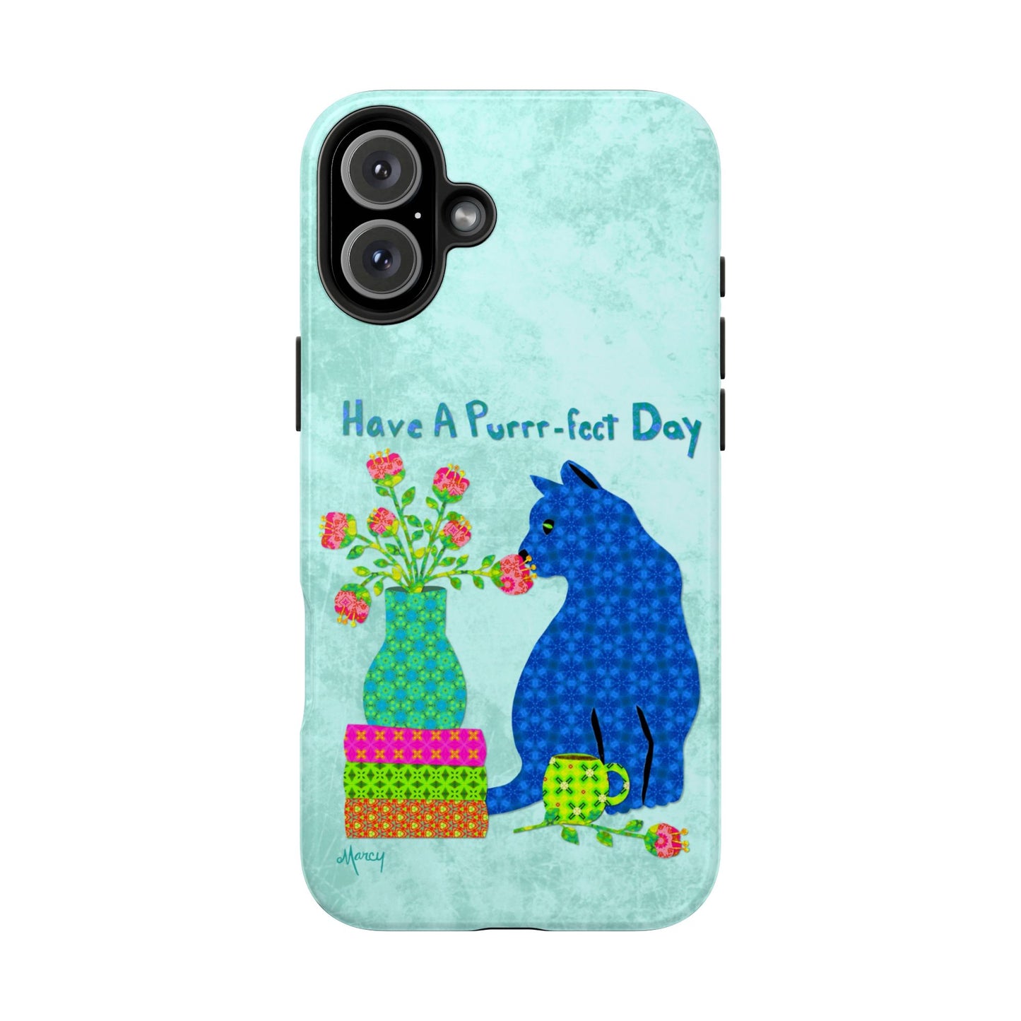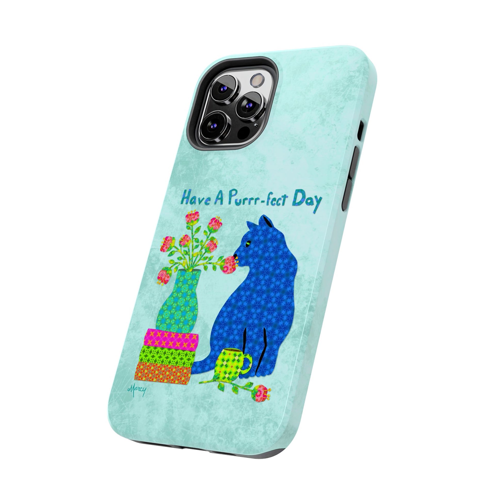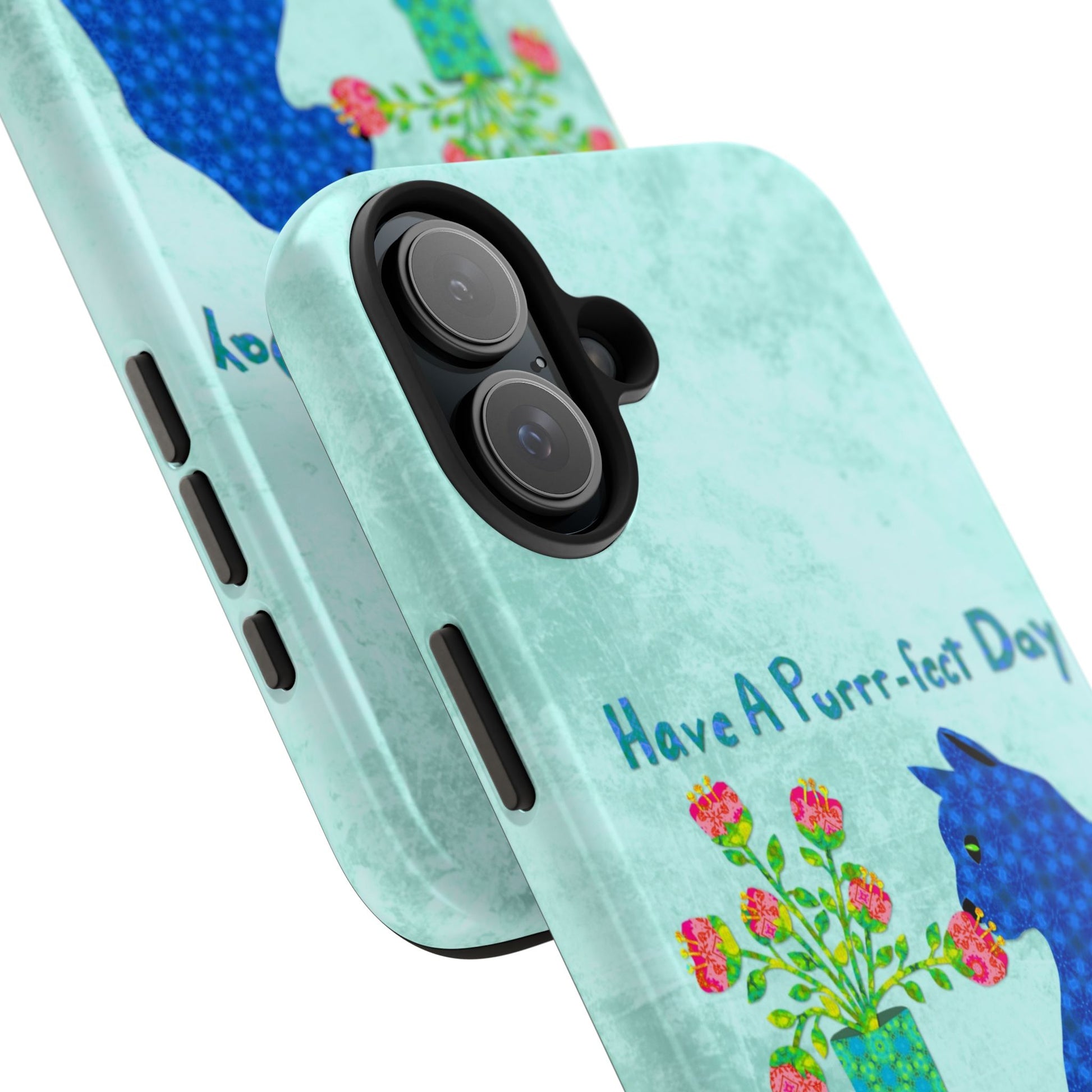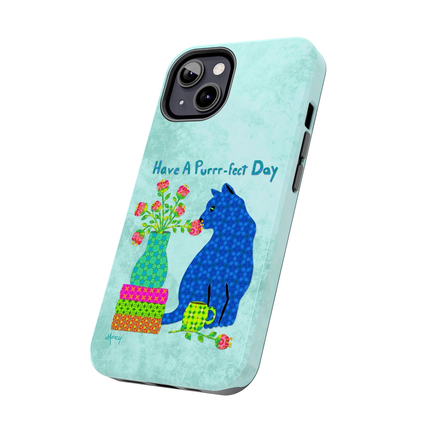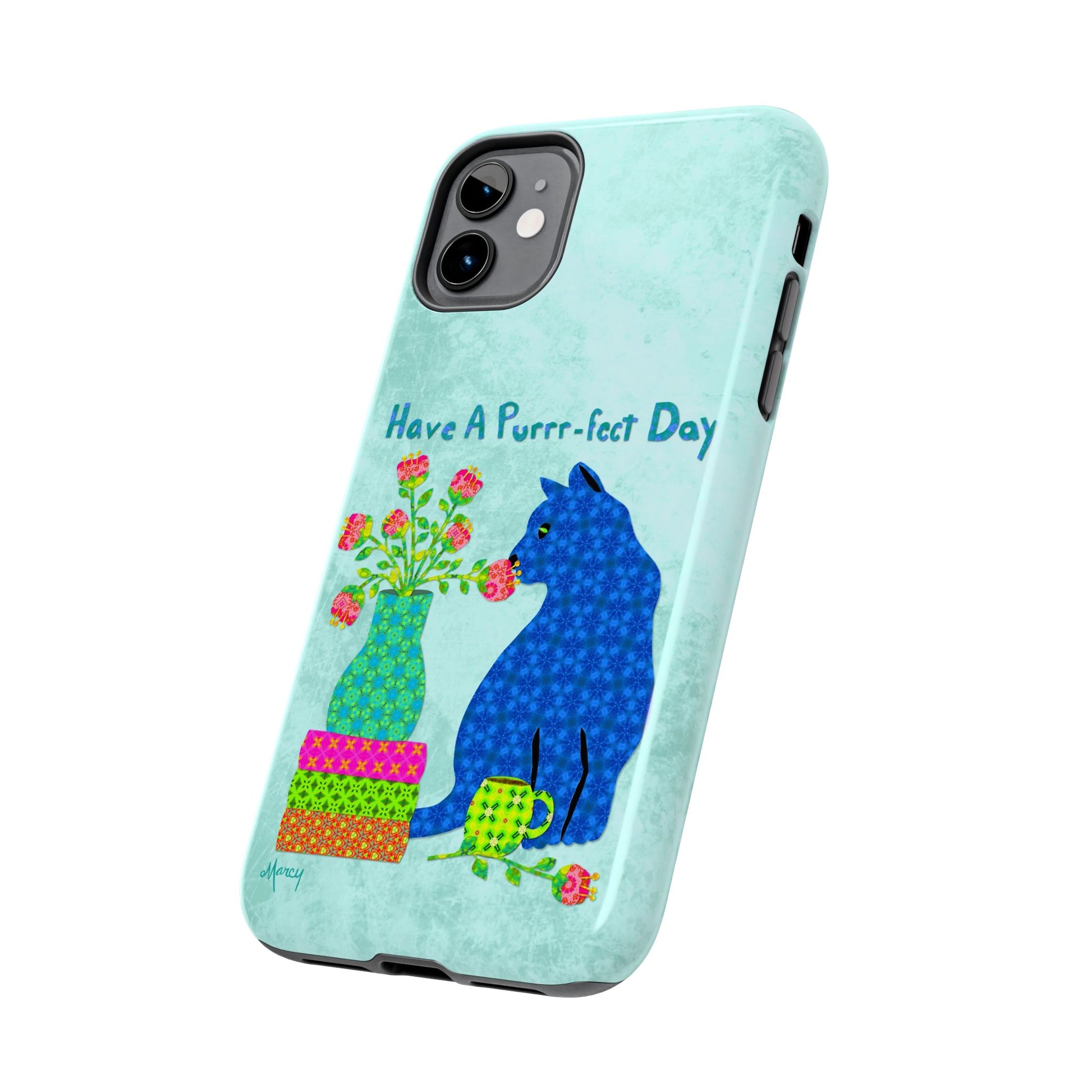 Topped with the hand-lettered phrase “Have a Purrr-fect Day” in coordinating turquoise patterns, the entire design is set against a calming light aqua background. It’s a cheerful, creative moment captured in art—now wrapped around your phone!