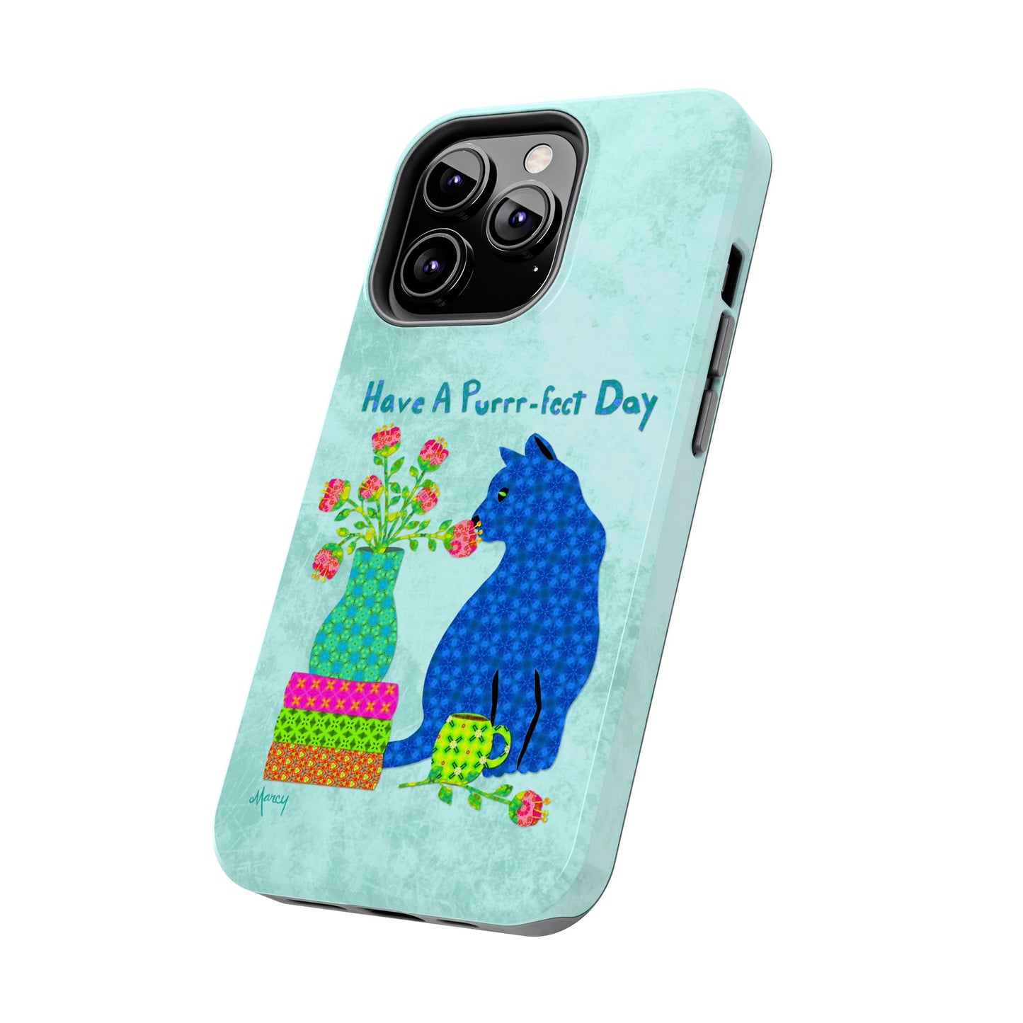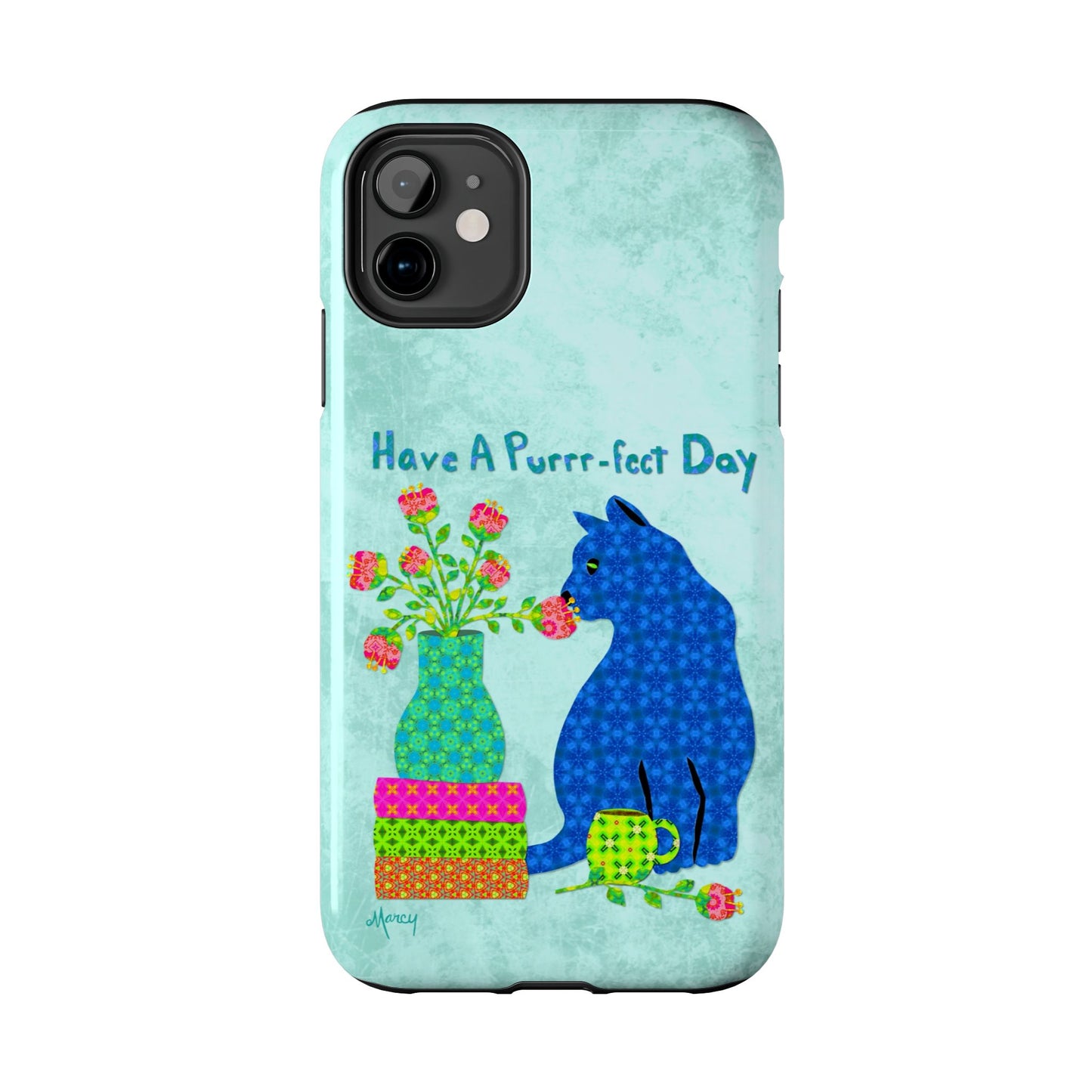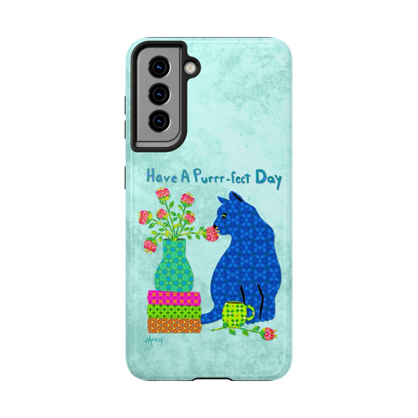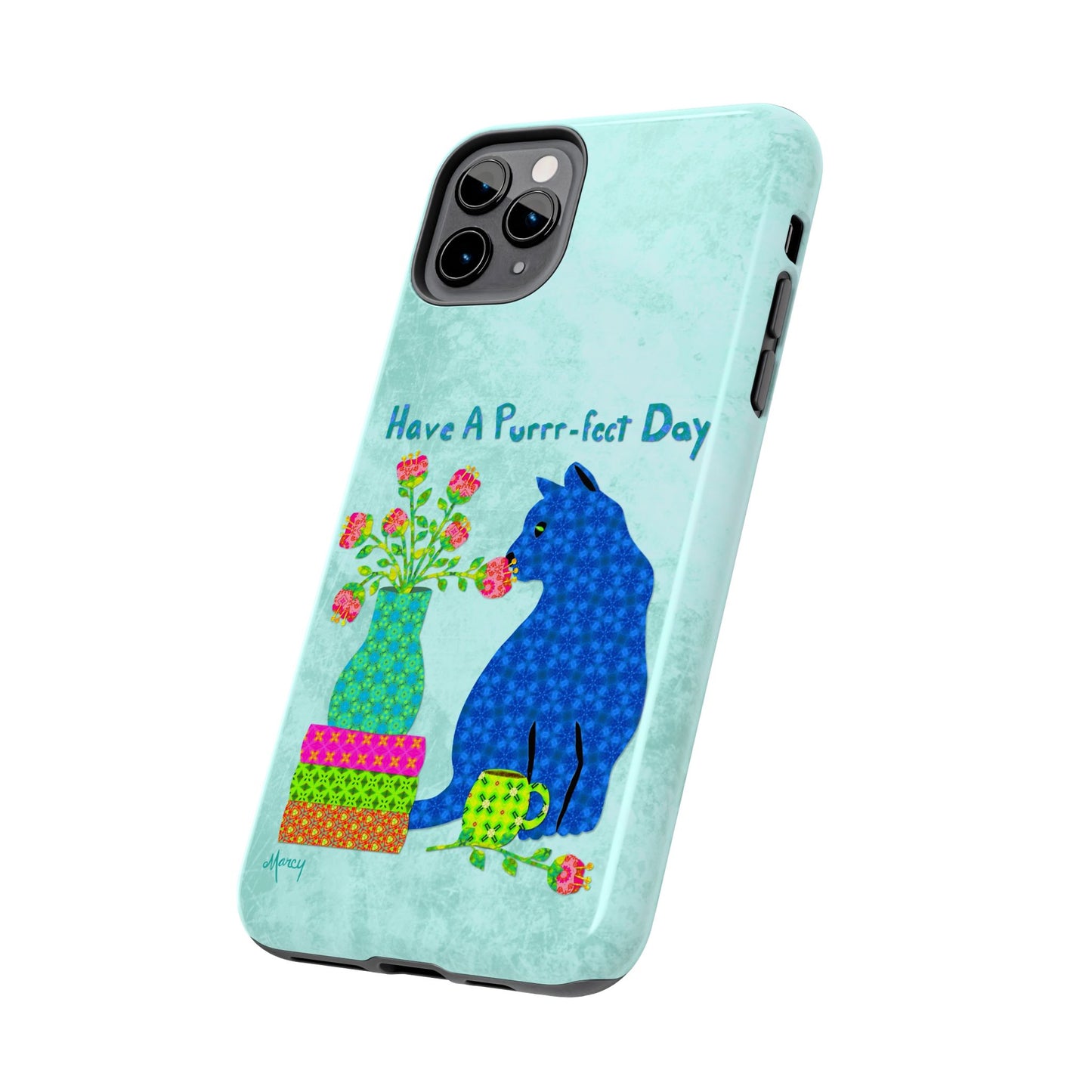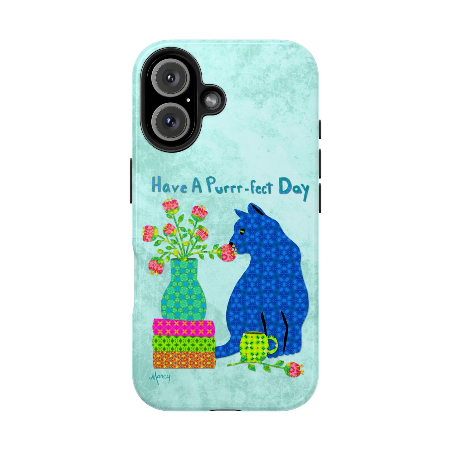 Topped with the hand-lettered phrase “Have a Purrr-fect Day” in coordinating turquoise patterns, the entire design is set against a calming light aqua background. It’s a cheerful, creative moment captured in art—now wrapped around your phone!