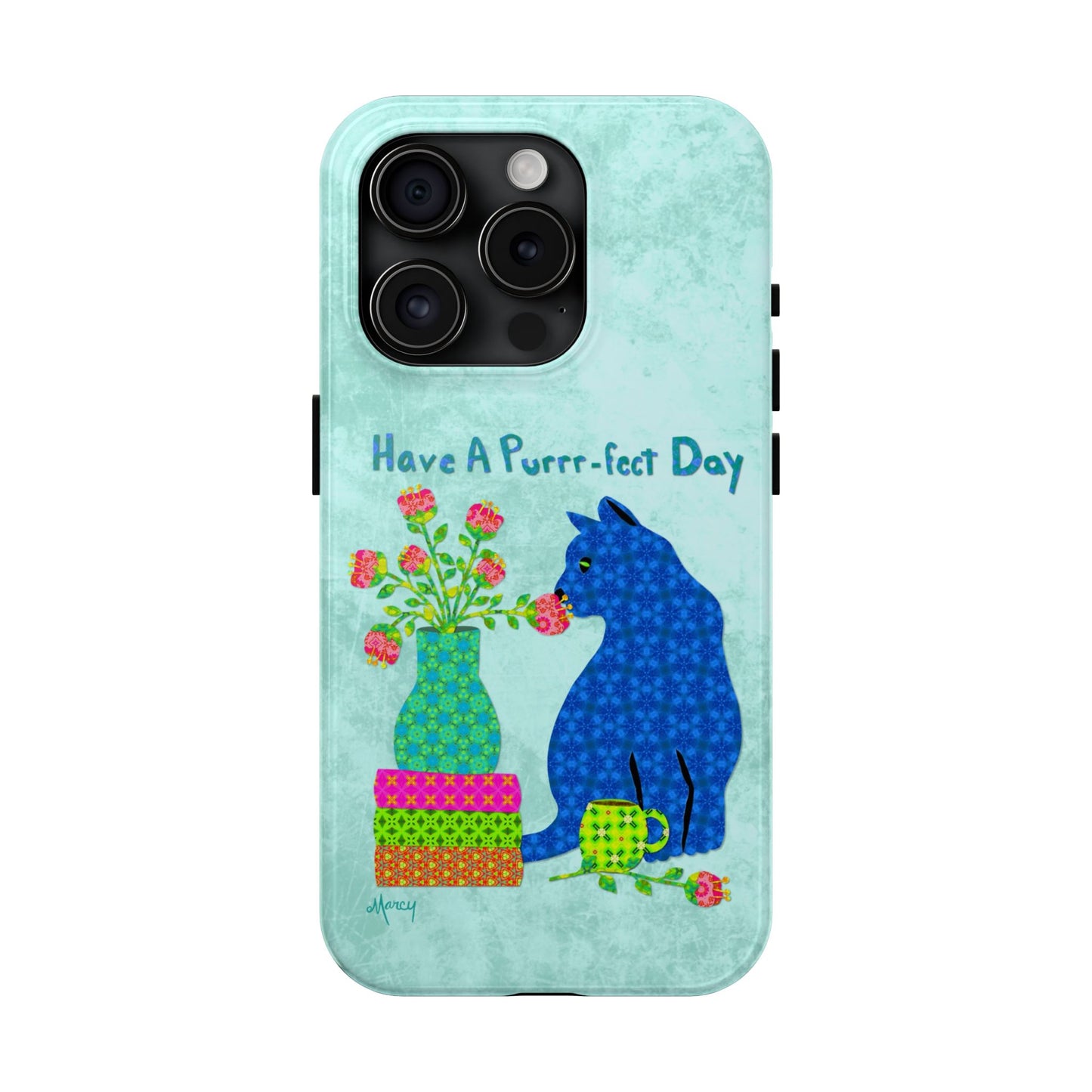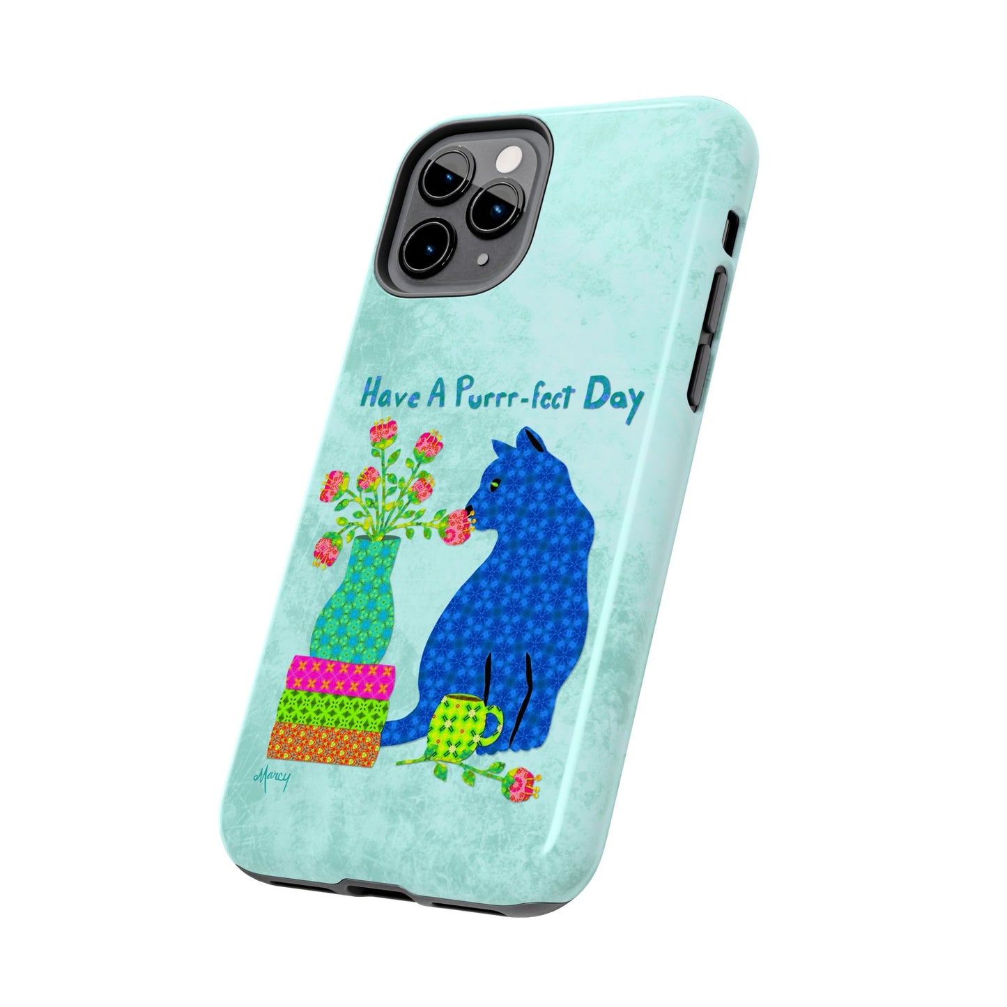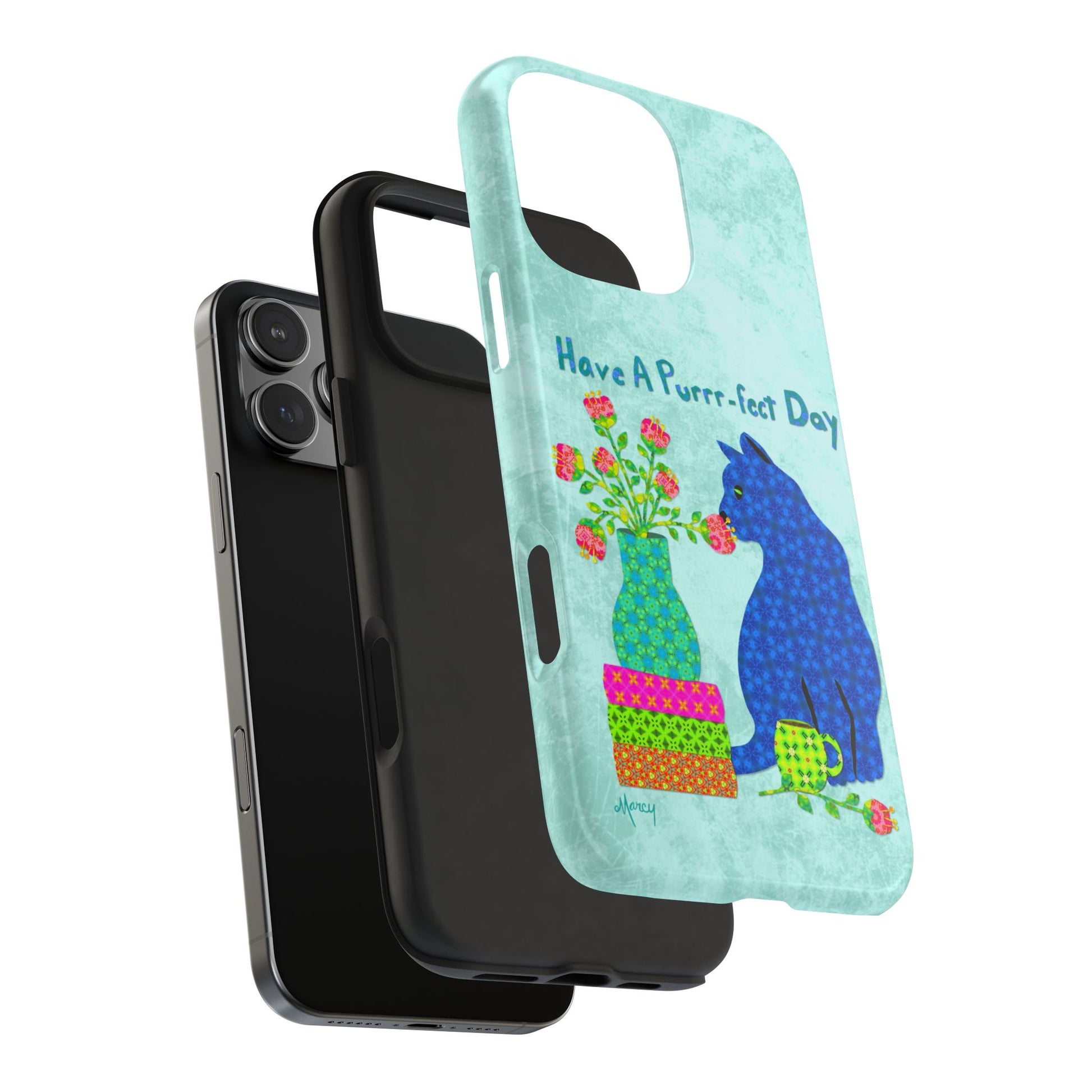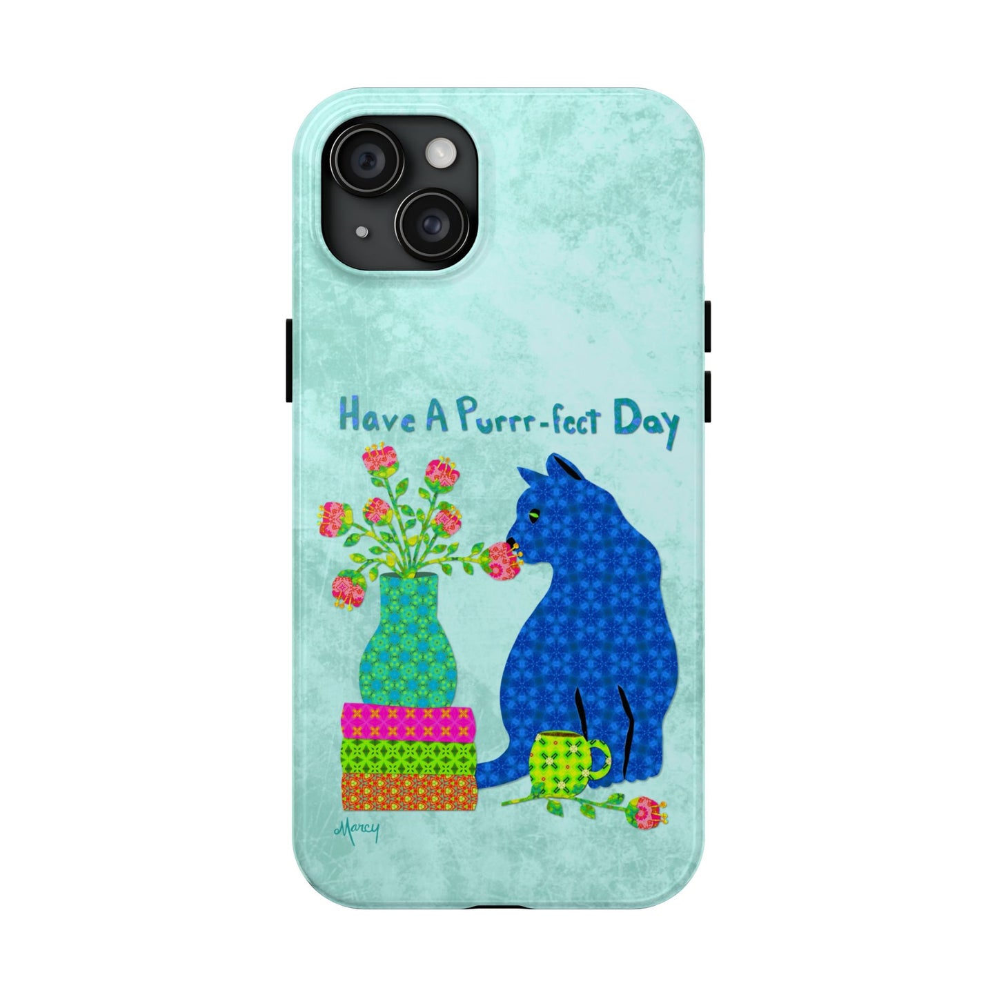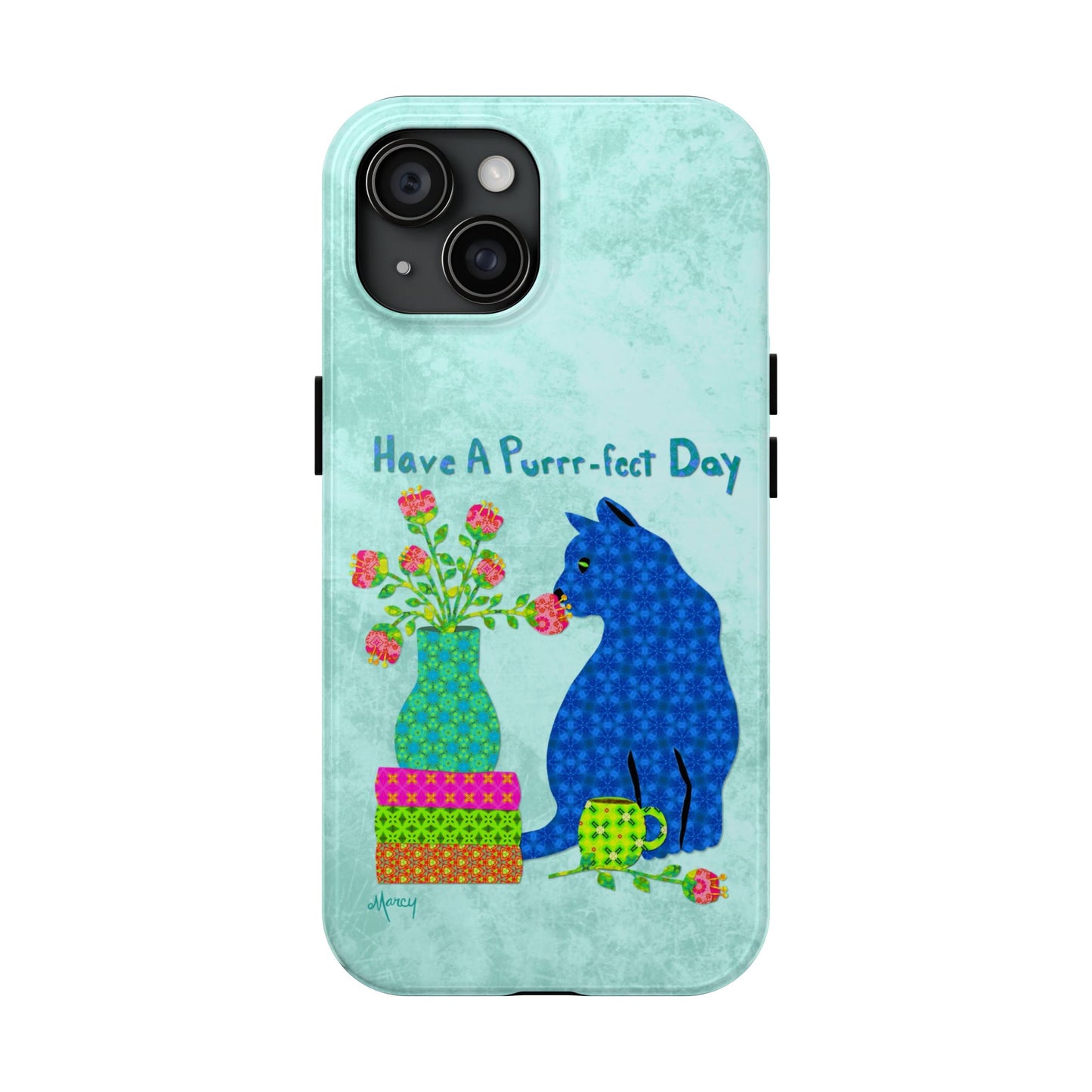 Topped with the hand-lettered phrase “Have a Purrr-fect Day” in coordinating turquoise patterns, the entire design is set against a calming light aqua background. It’s a cheerful, creative moment captured in art—now wrapped around your phone!
