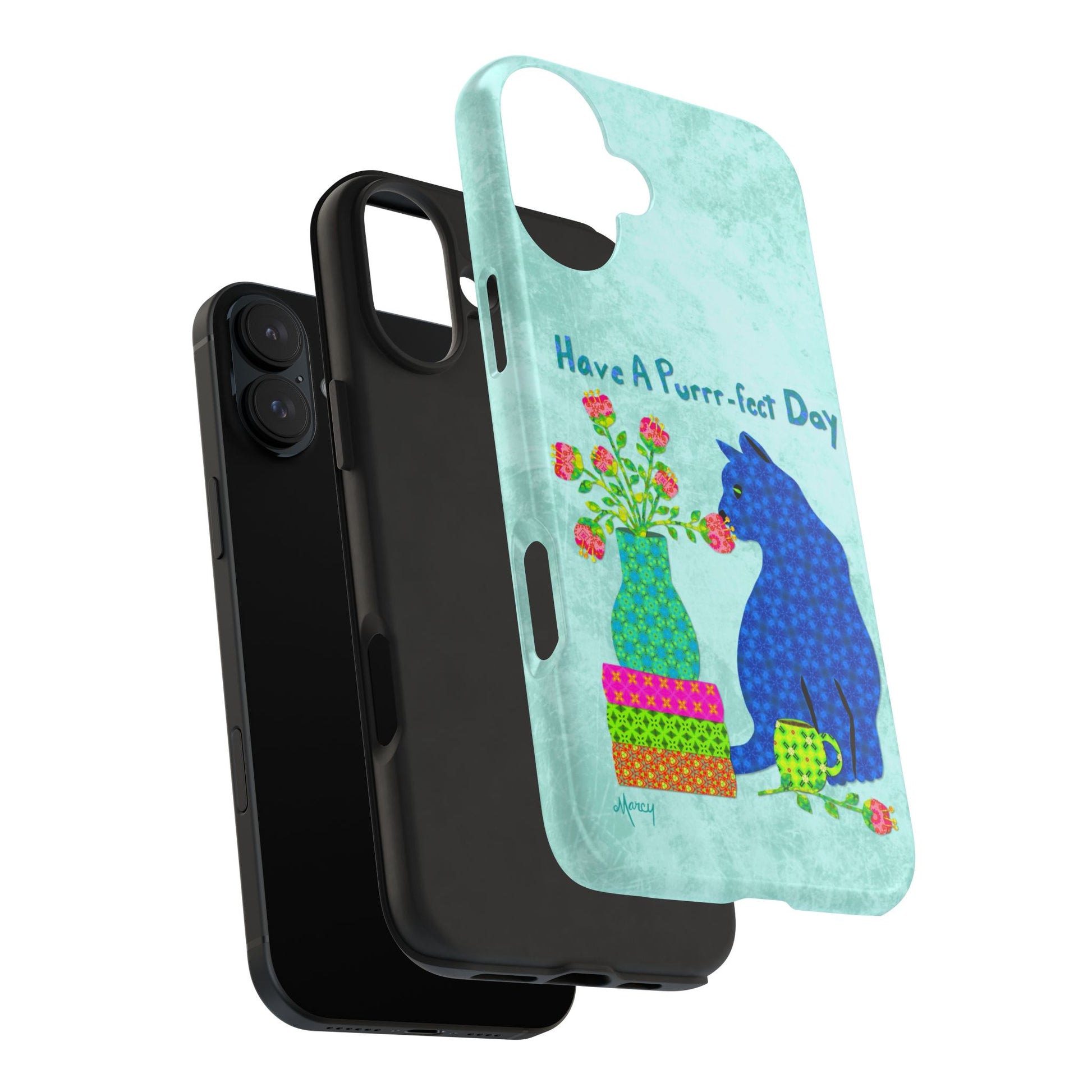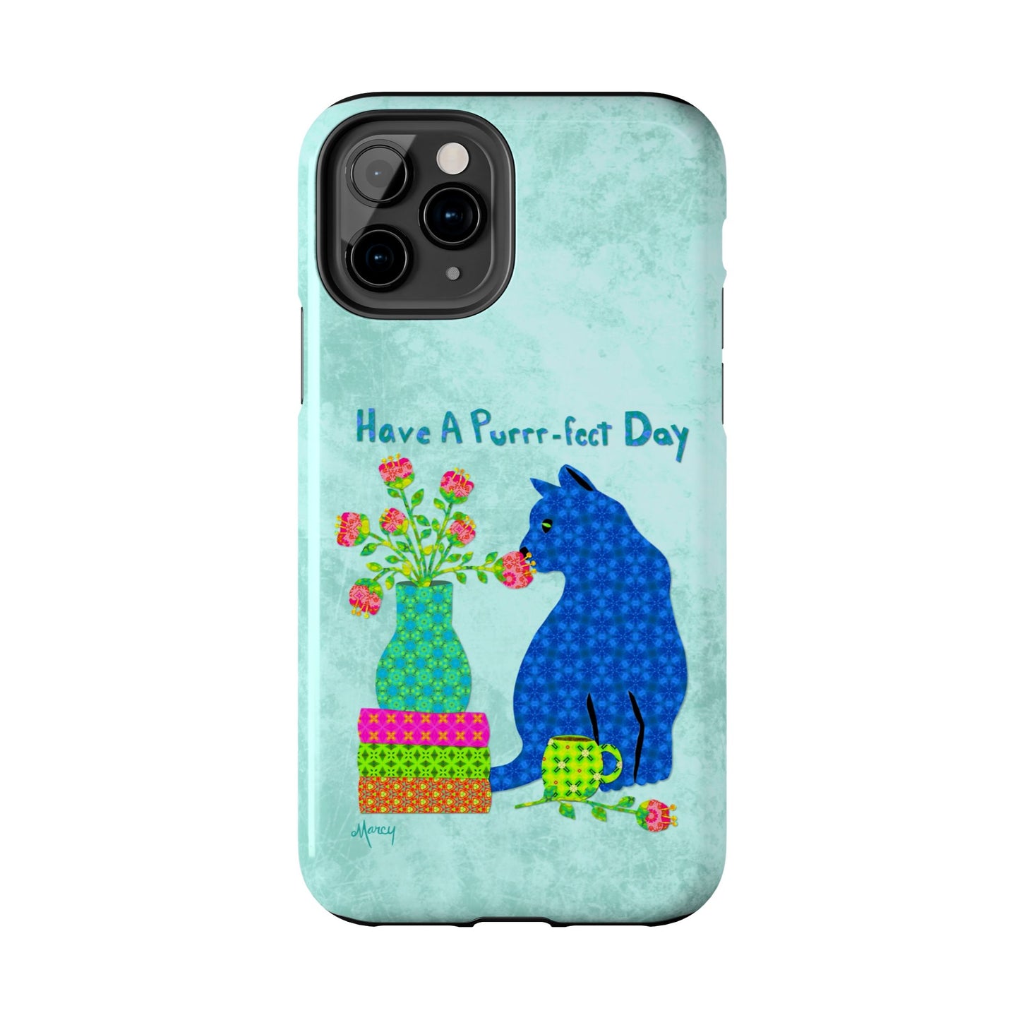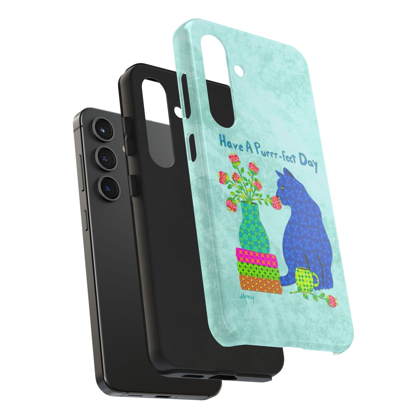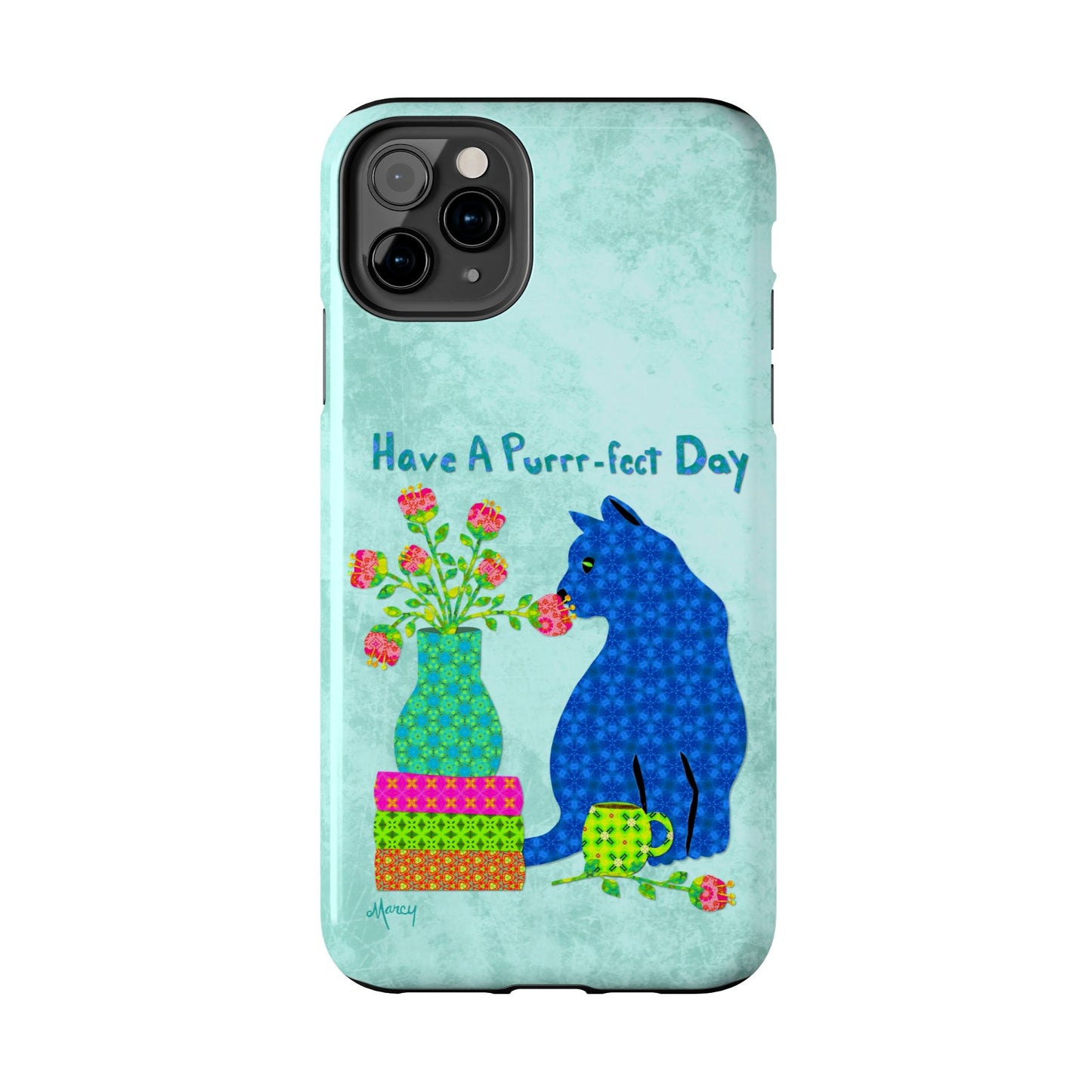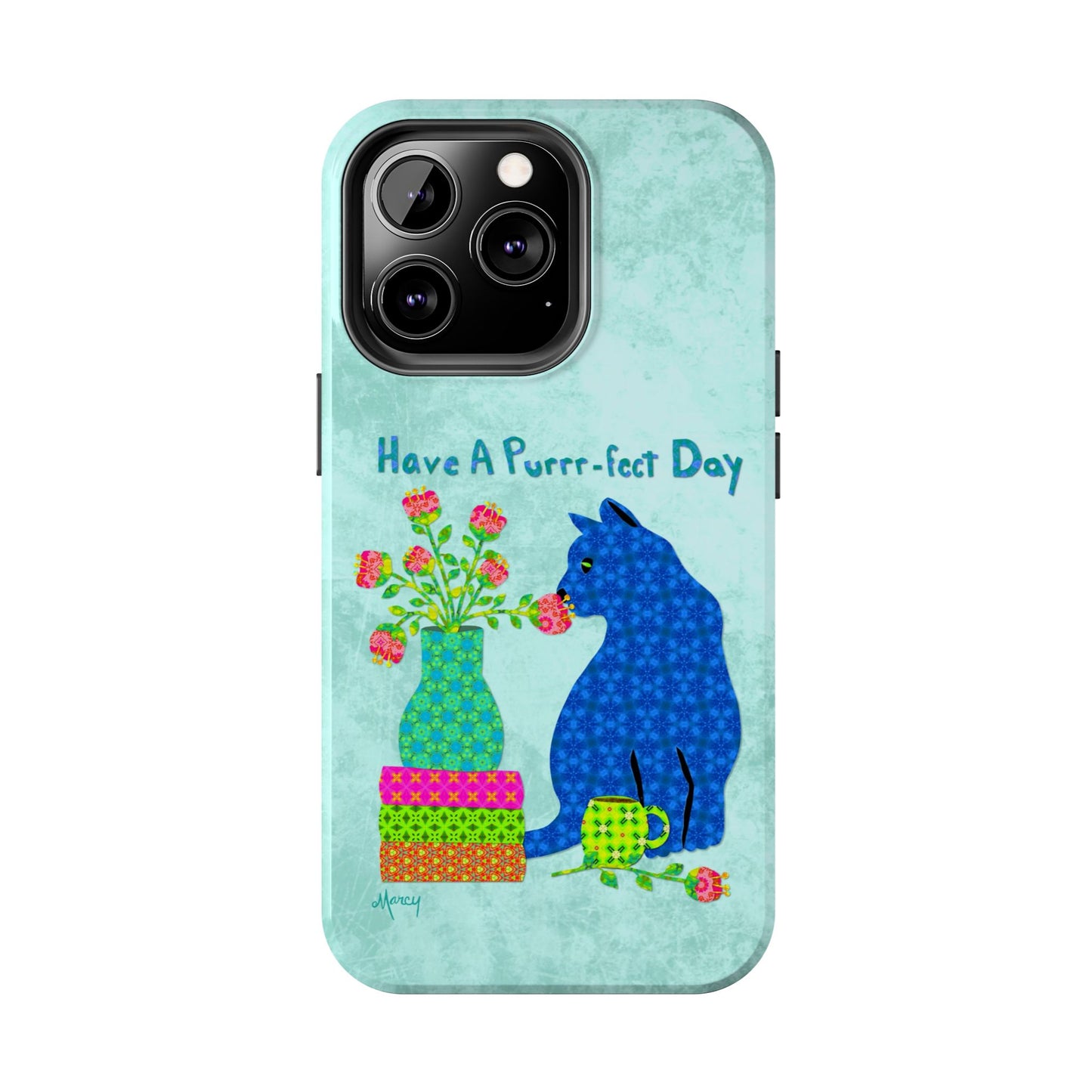 Topped with the hand-lettered phrase “Have a Purrr-fect Day” in coordinating turquoise patterns, the entire design is set against a calming light aqua background. It’s a cheerful, creative moment captured in art—now wrapped around your phone!