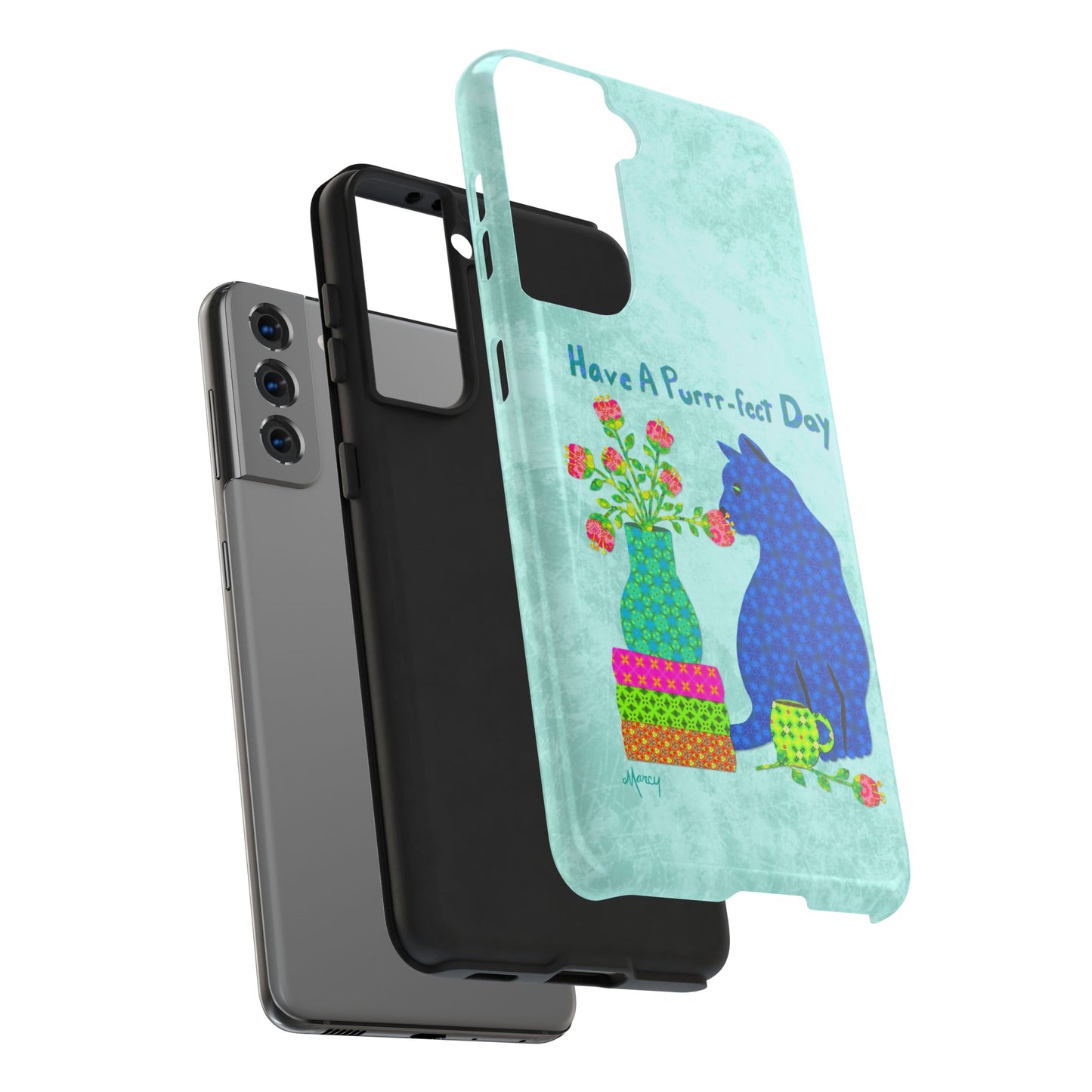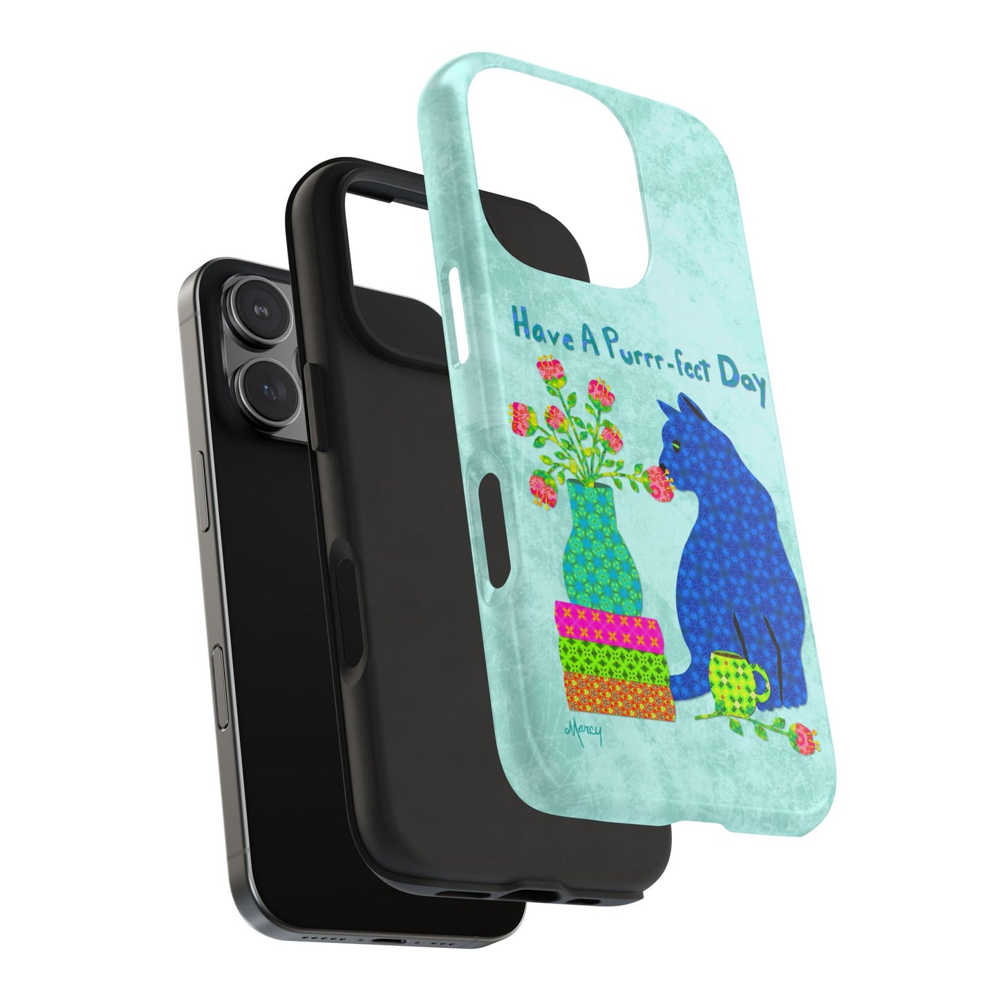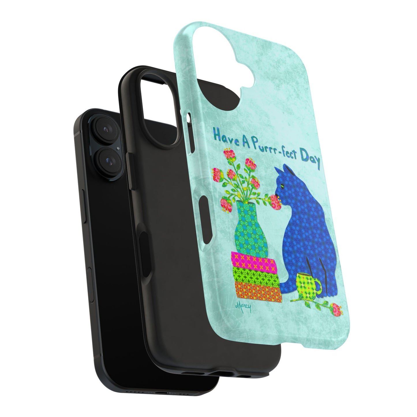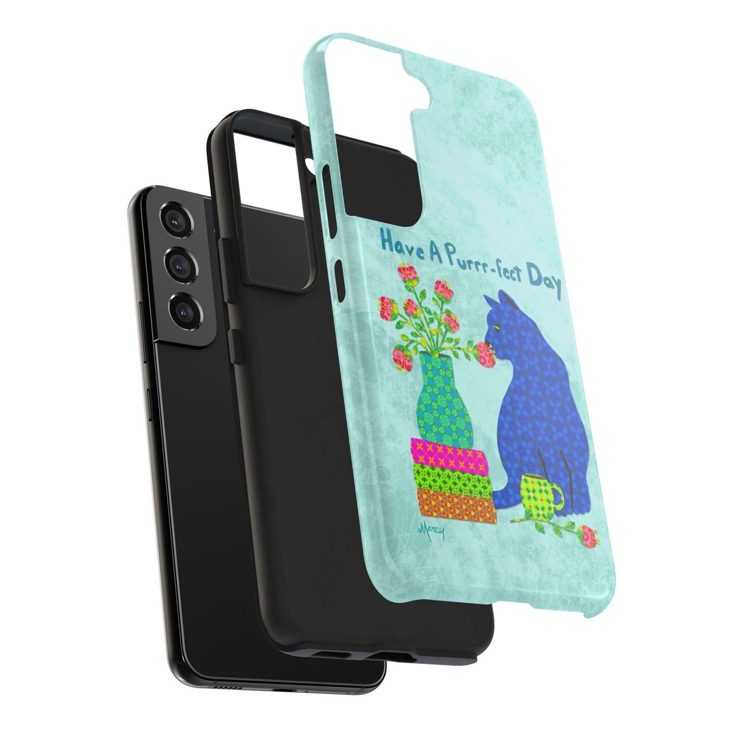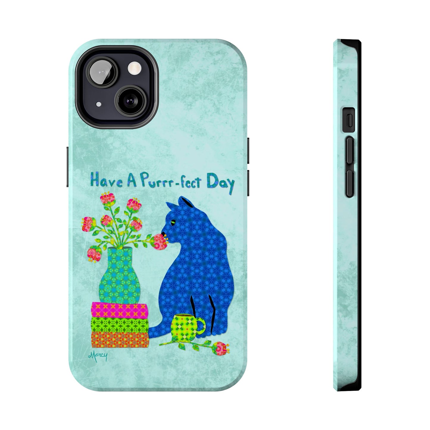 Topped with the hand-lettered phrase “Have a Purrr-fect Day” in coordinating turquoise patterns, the entire design is set against a calming light aqua background. It’s a cheerful, creative moment captured in art—now wrapped around your phone!