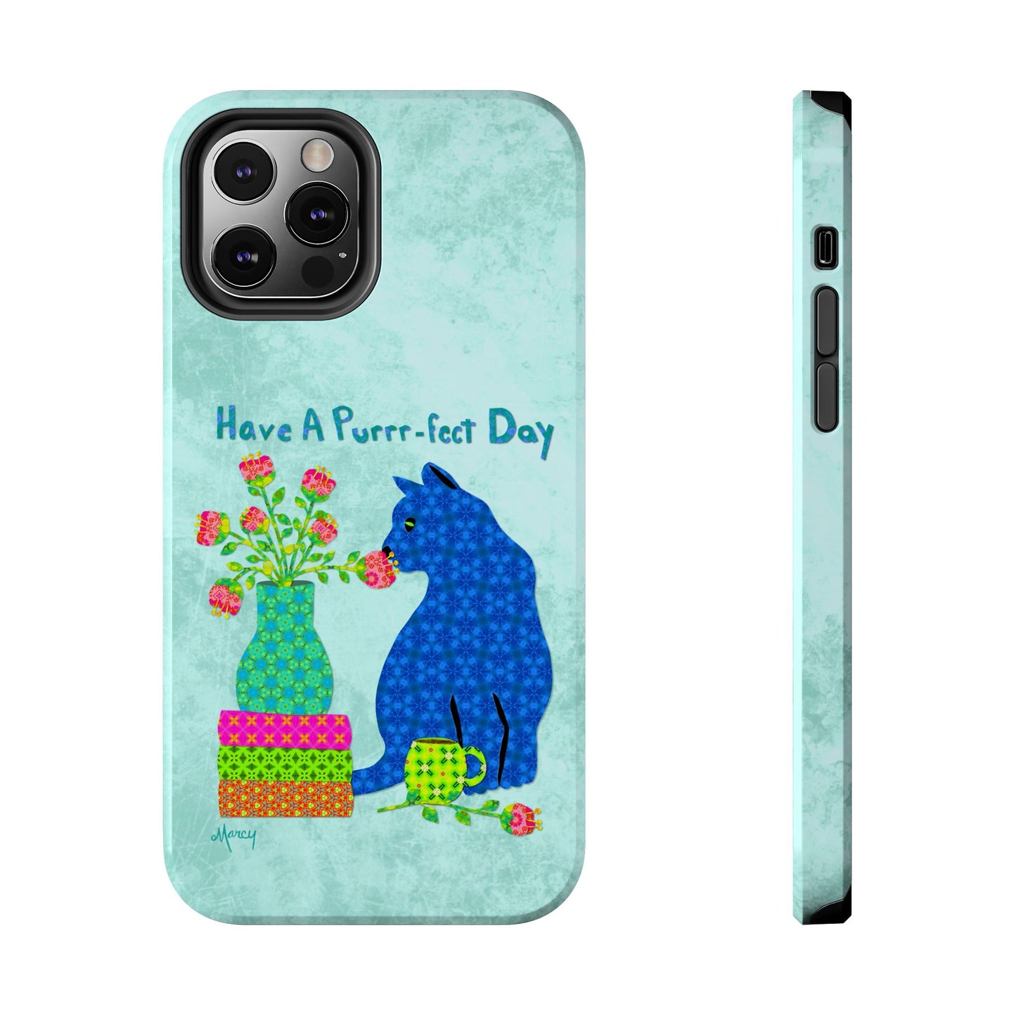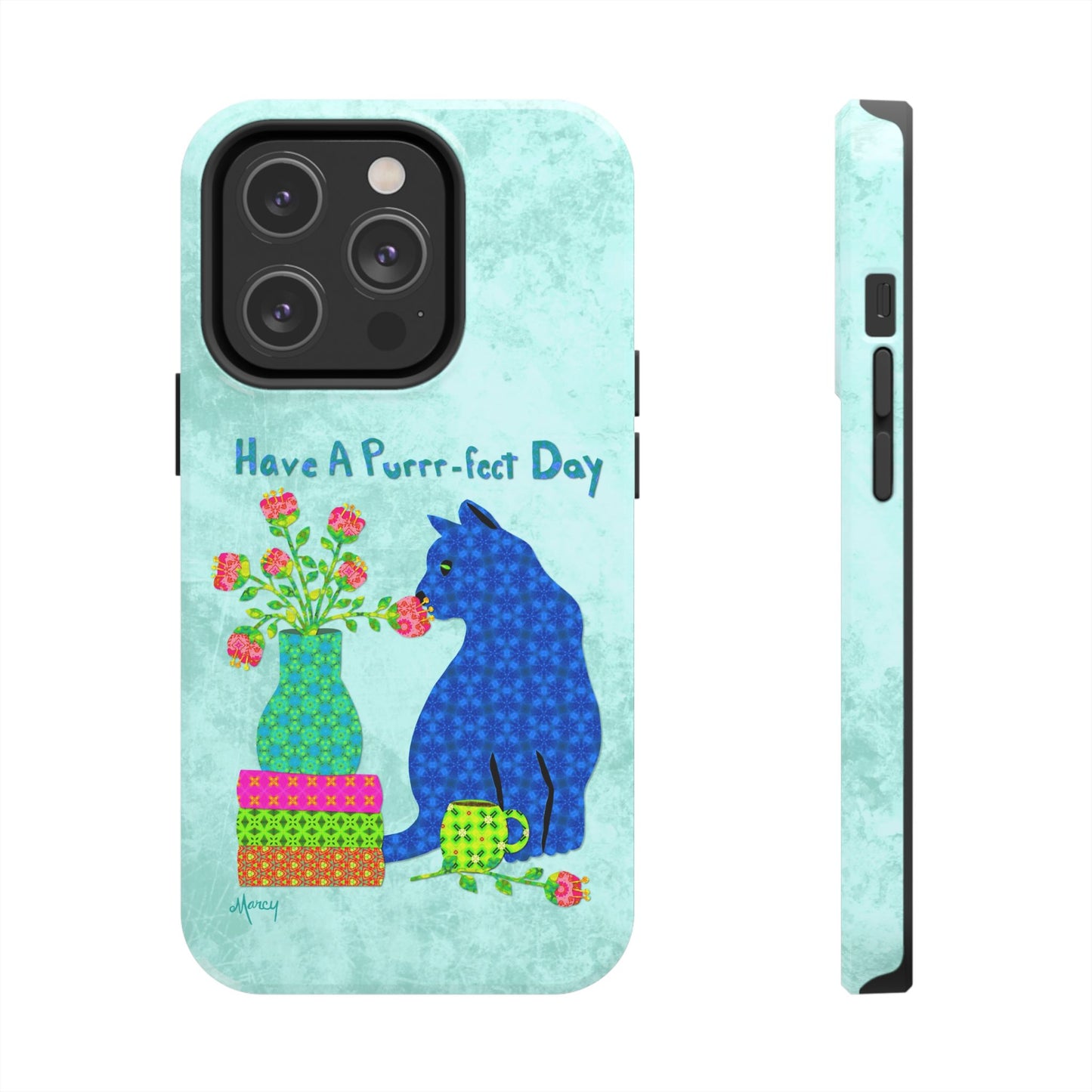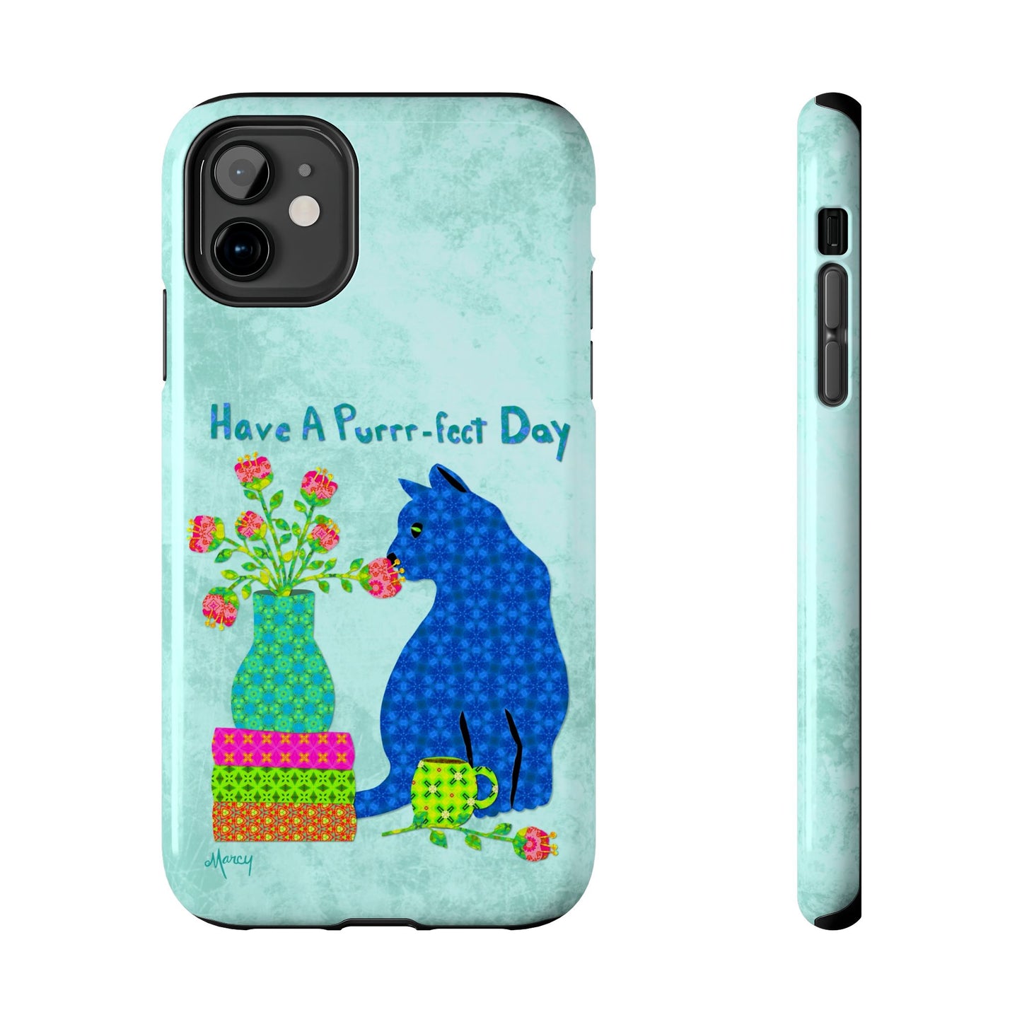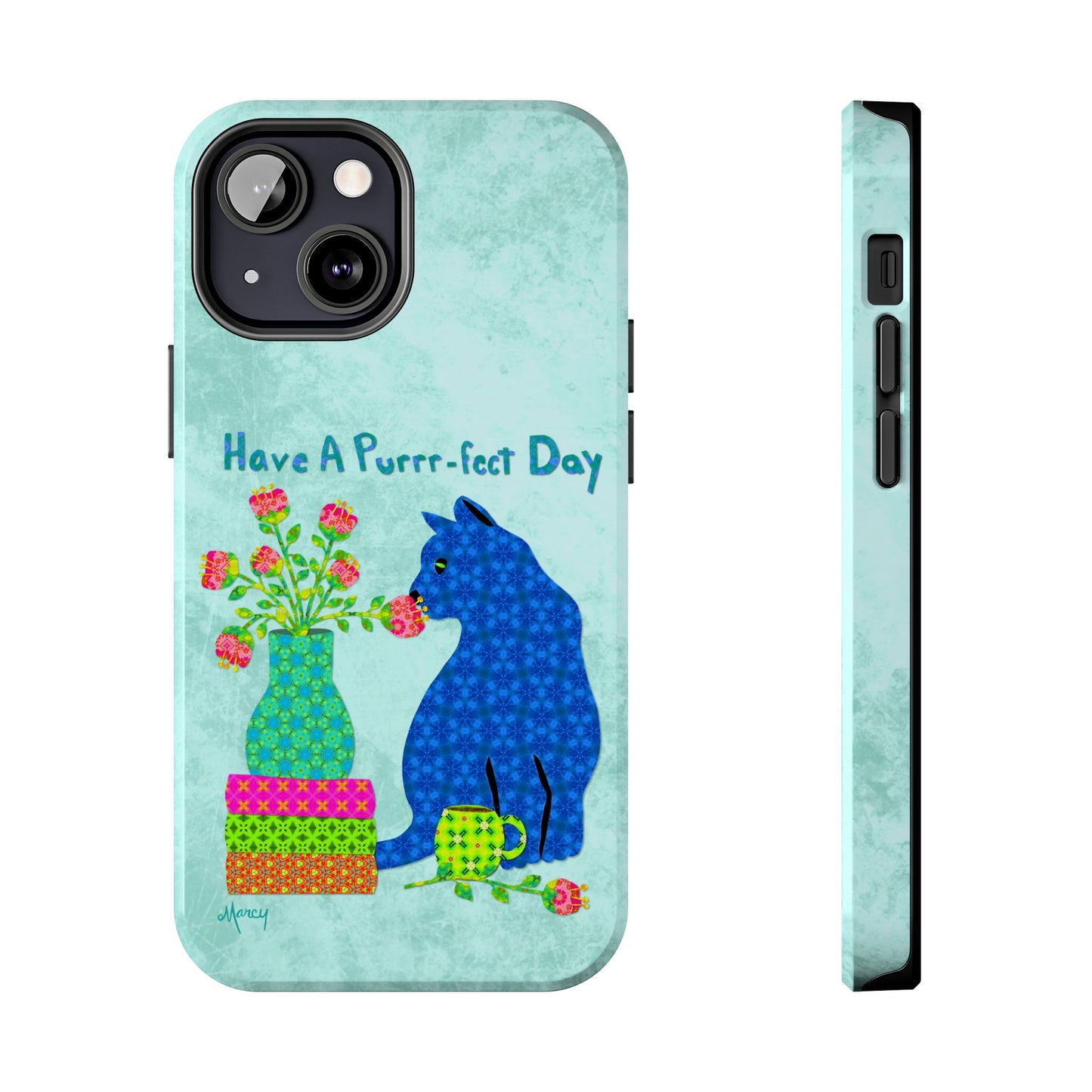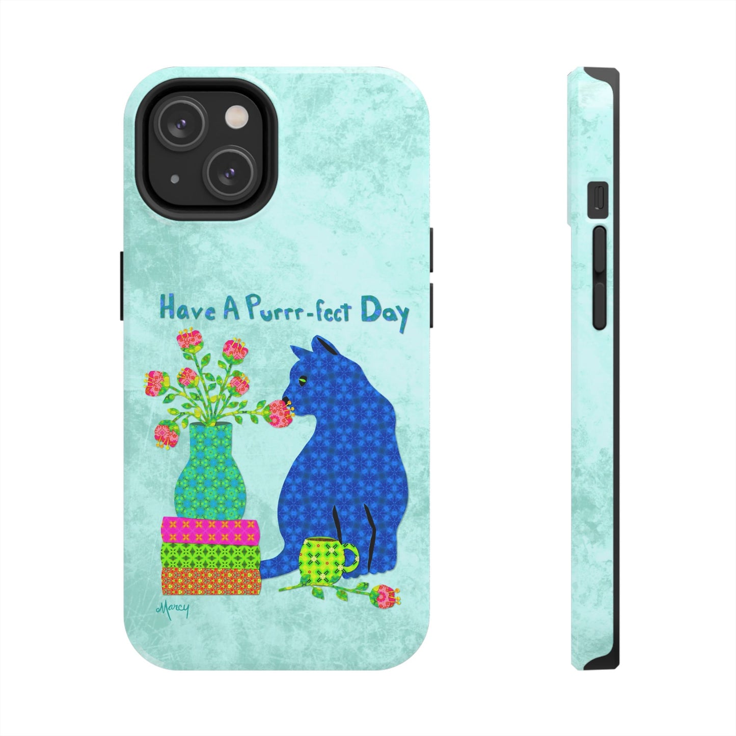 Topped with the hand-lettered phrase “Have a Purrr-fect Day” in coordinating turquoise patterns, the entire design is set against a calming light aqua background. It’s a cheerful, creative moment captured in art—now wrapped around your phone!