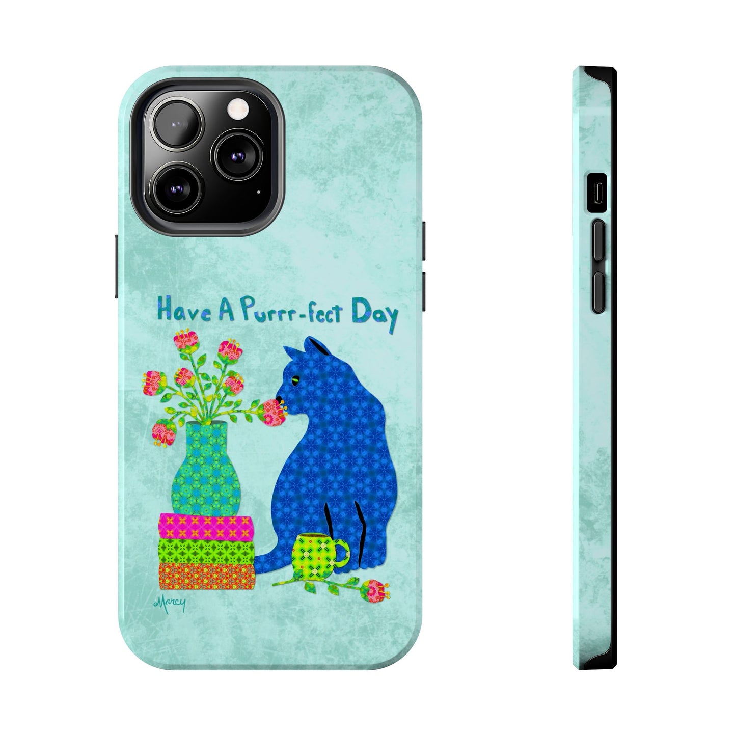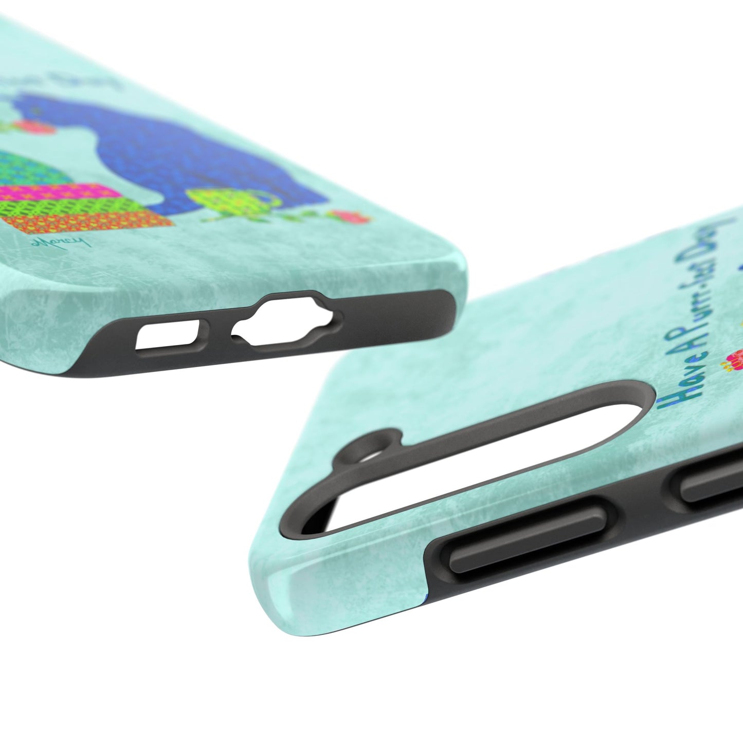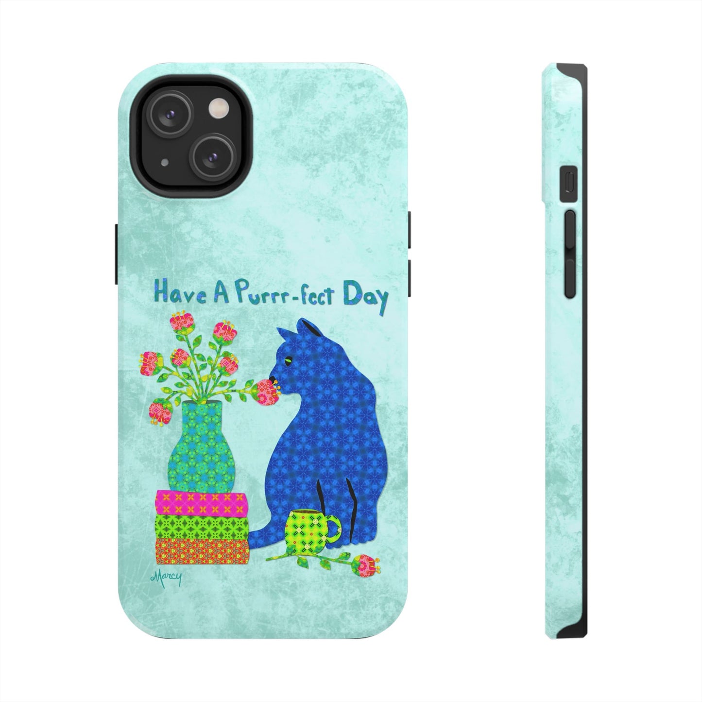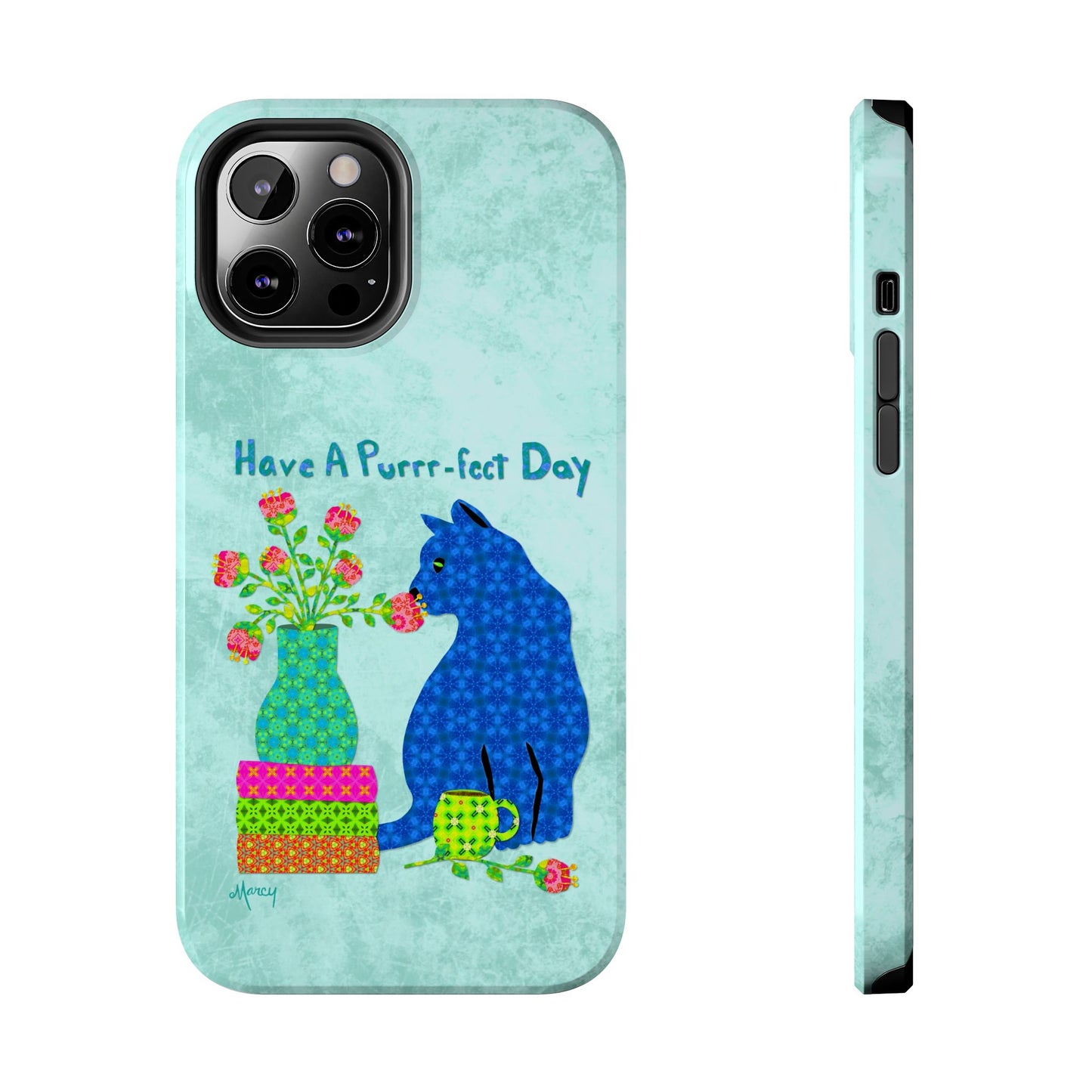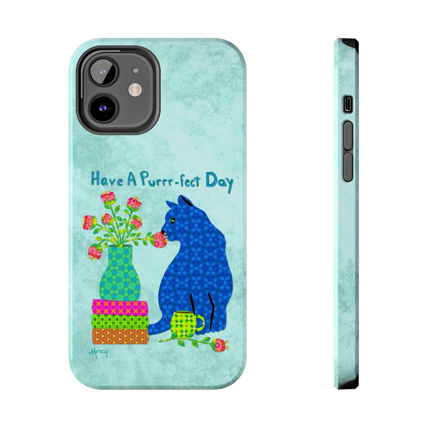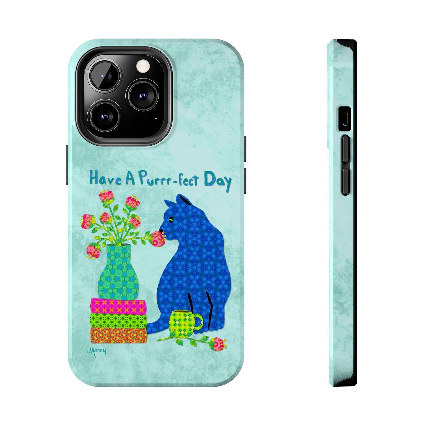 Topped with the hand-lettered phrase “Have a Purrr-fect Day” in coordinating turquoise patterns, the entire design is set against a calming light aqua background. It’s a cheerful, creative moment captured in art—now wrapped around your phone!