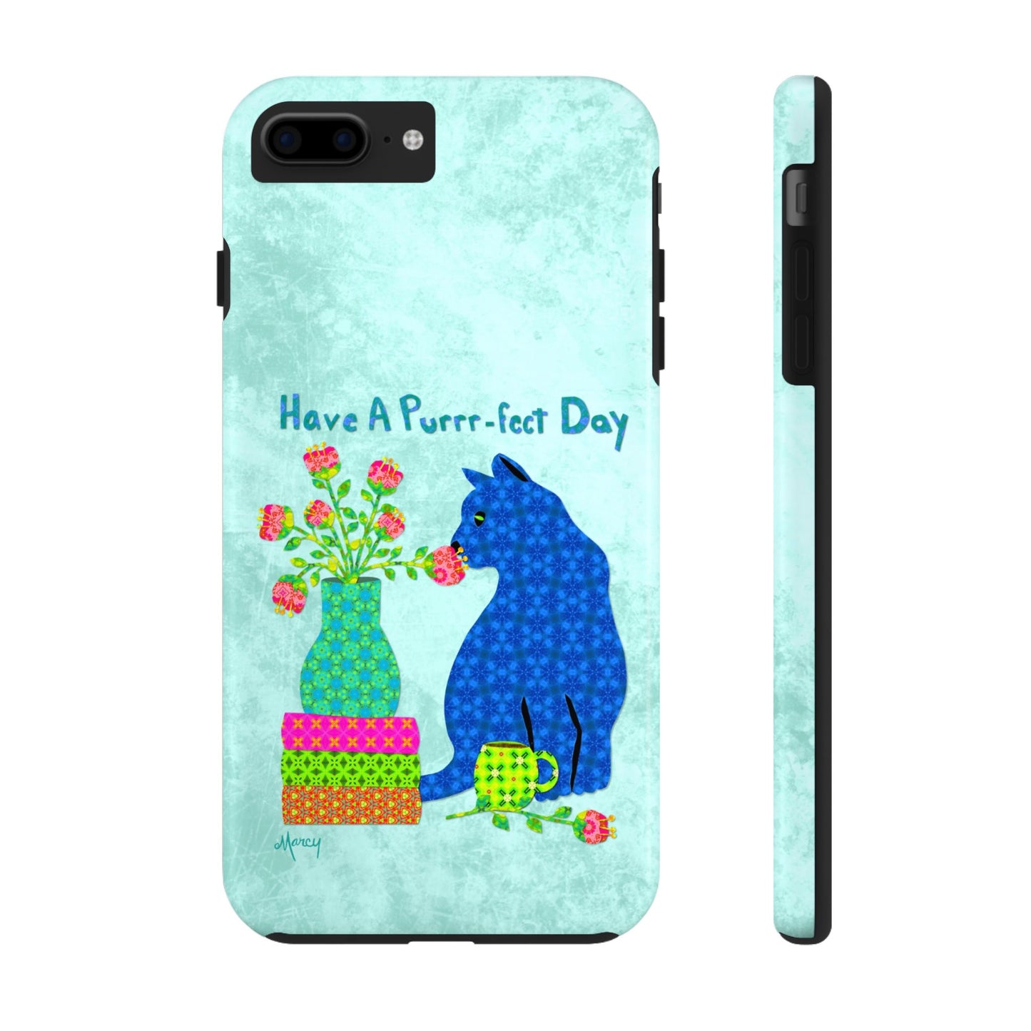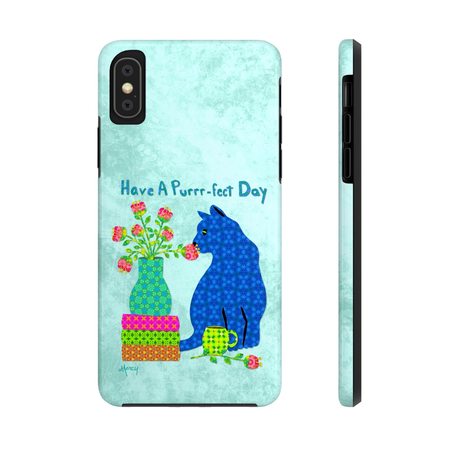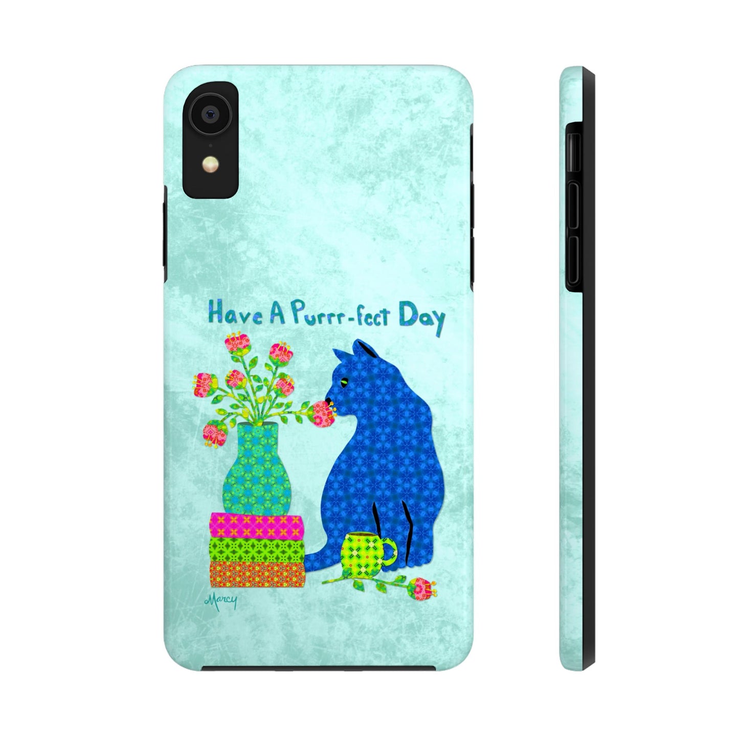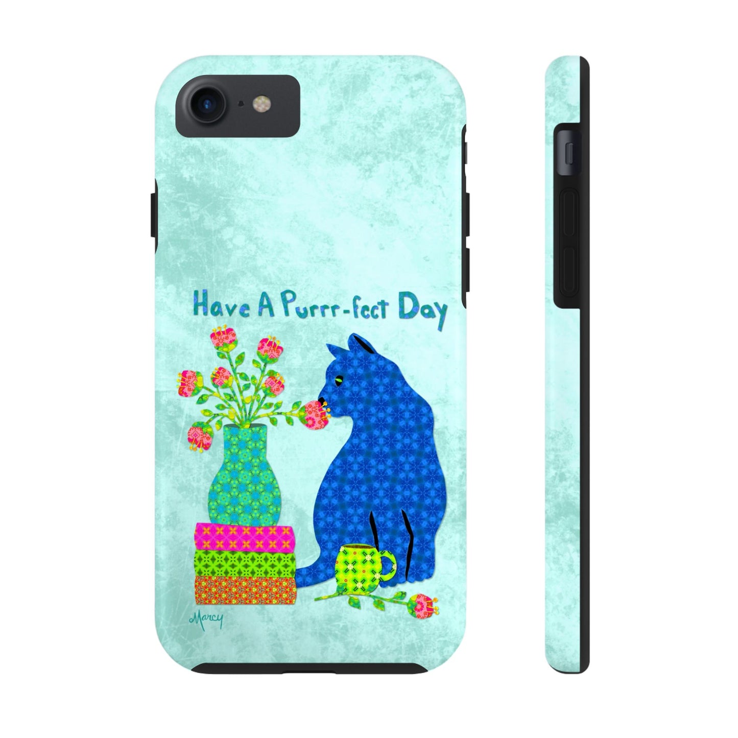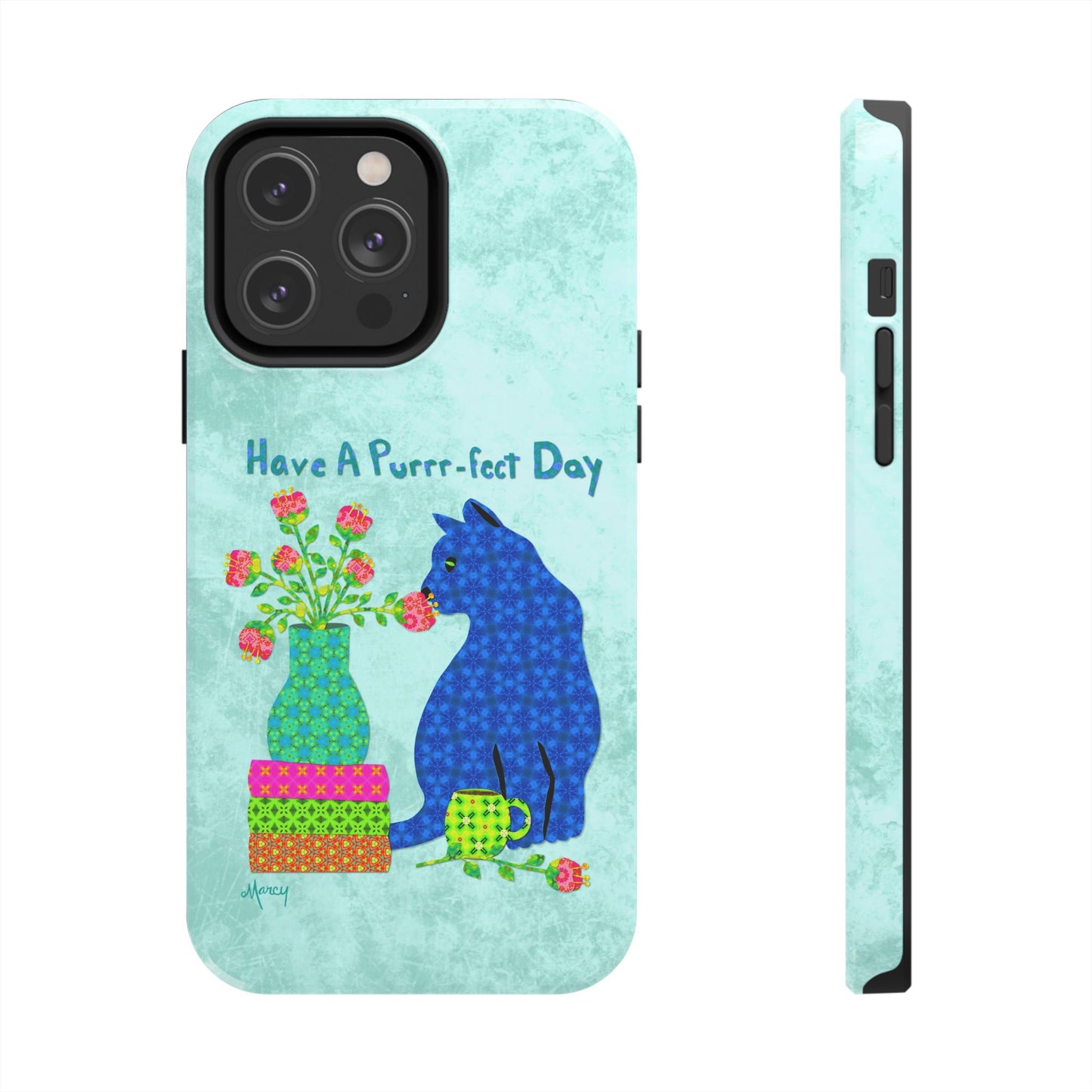 Topped with the hand-lettered phrase “Have a Purrr-fect Day” in coordinating turquoise patterns, the entire design is set against a calming light aqua background. It’s a cheerful, creative moment captured in art—now wrapped around your phone!