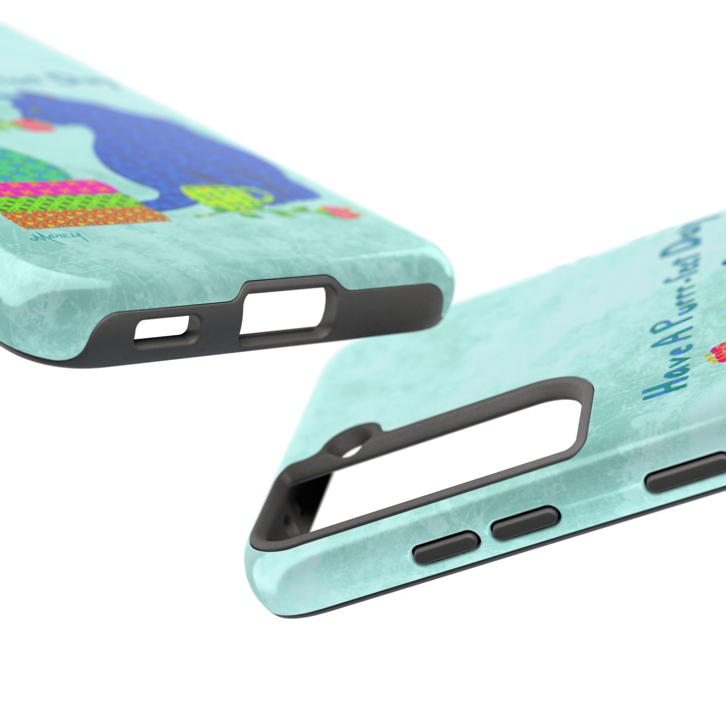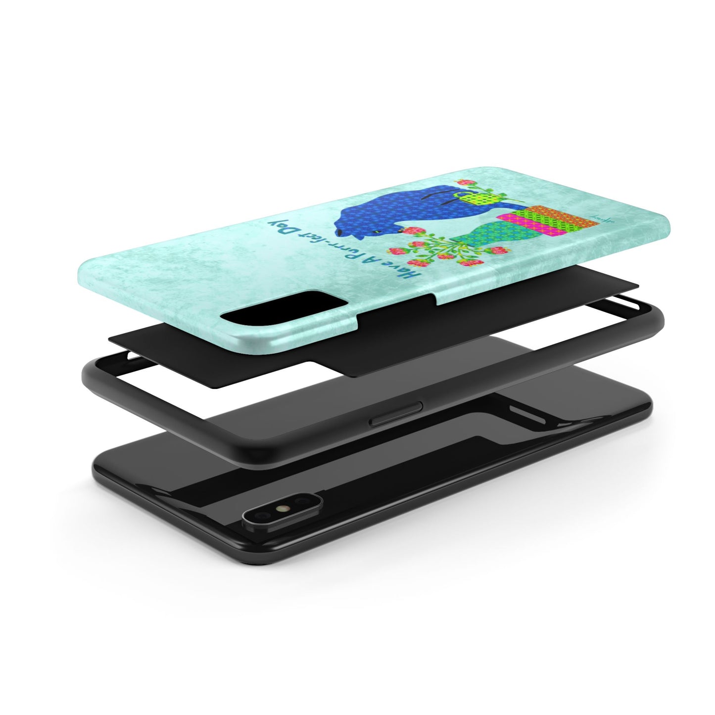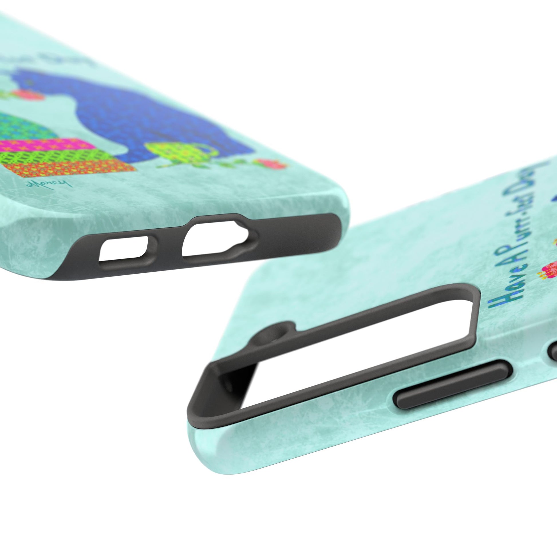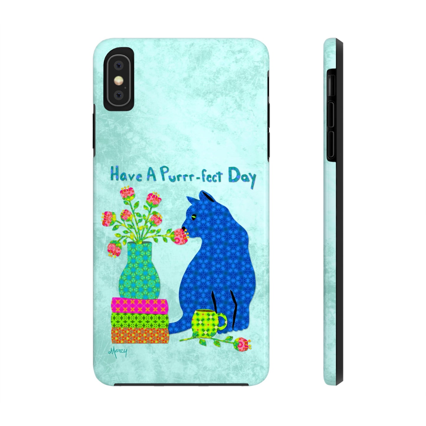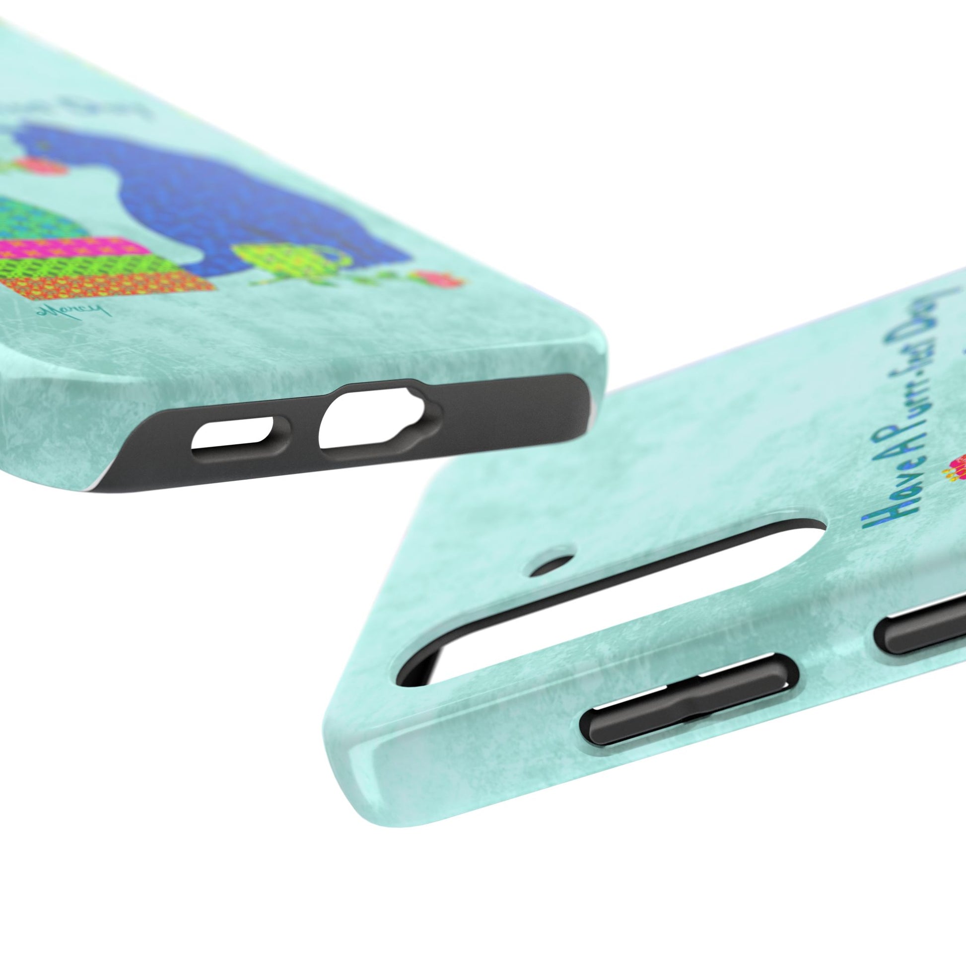 Topped with the hand-lettered phrase “Have a Purrr-fect Day” in coordinating turquoise patterns, the entire design is set against a calming light aqua background. It’s a cheerful, creative moment captured in art—now wrapped around your phone!