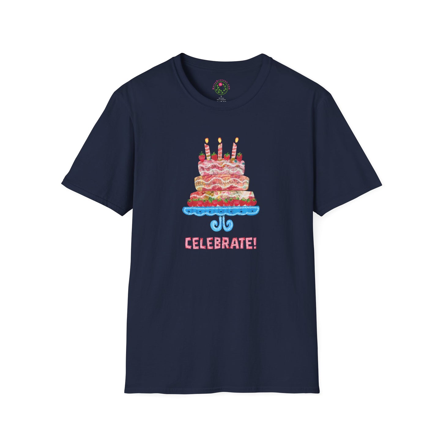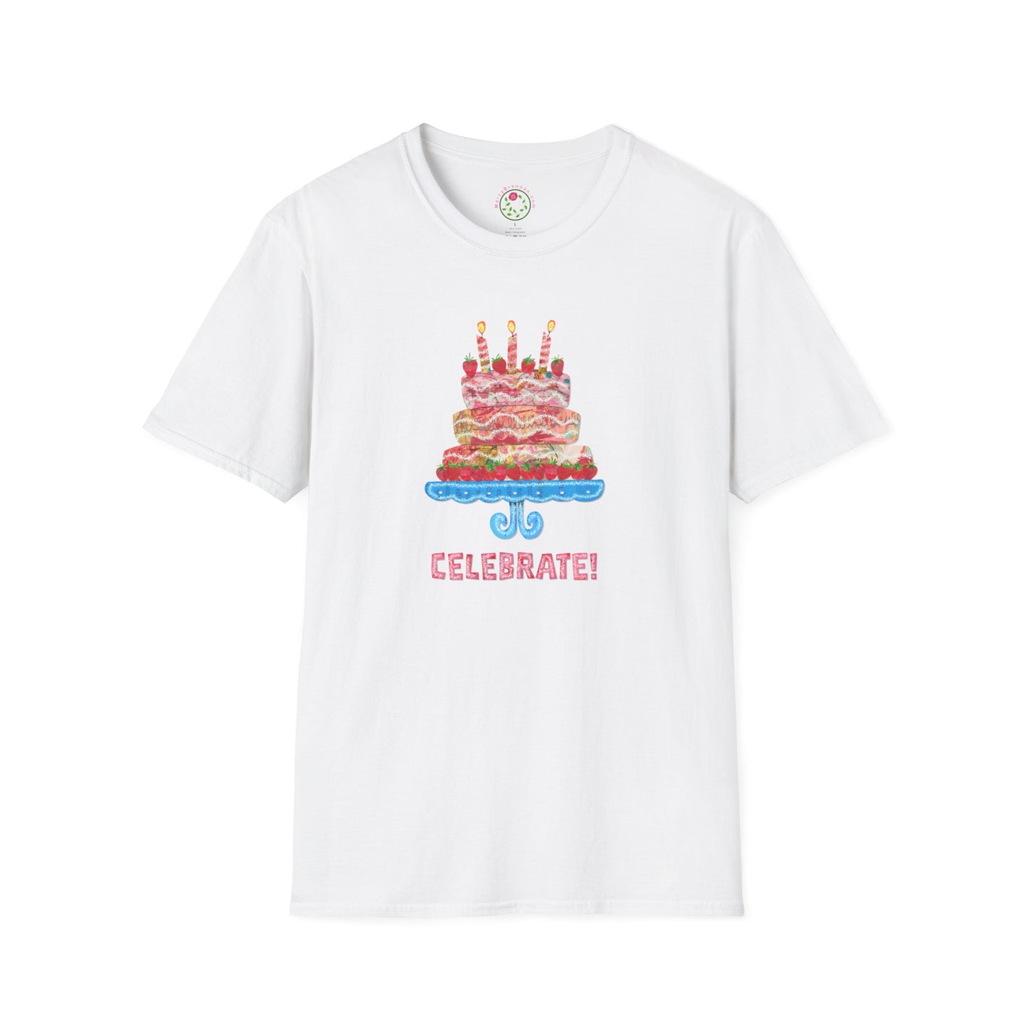 Celebrate in comfort and style with this vibrant “Celebrate!” softstyle t-shirt! Featuring a playful, three-layer collage cake topped with strawberries and three festive candles, this design brings joy to any outfit. The cake sits on a turquoise stand and sparkles with wavy glitter stripes, while hand-cut collage papers in red, pink, and pale yellow add warmth and texture. The cheerful message Celebrate! shines in bold red and pink lettering with silver glitter accents, making this tee perfect for birthdays, parties, or simply adding a little happy to your everyday look.