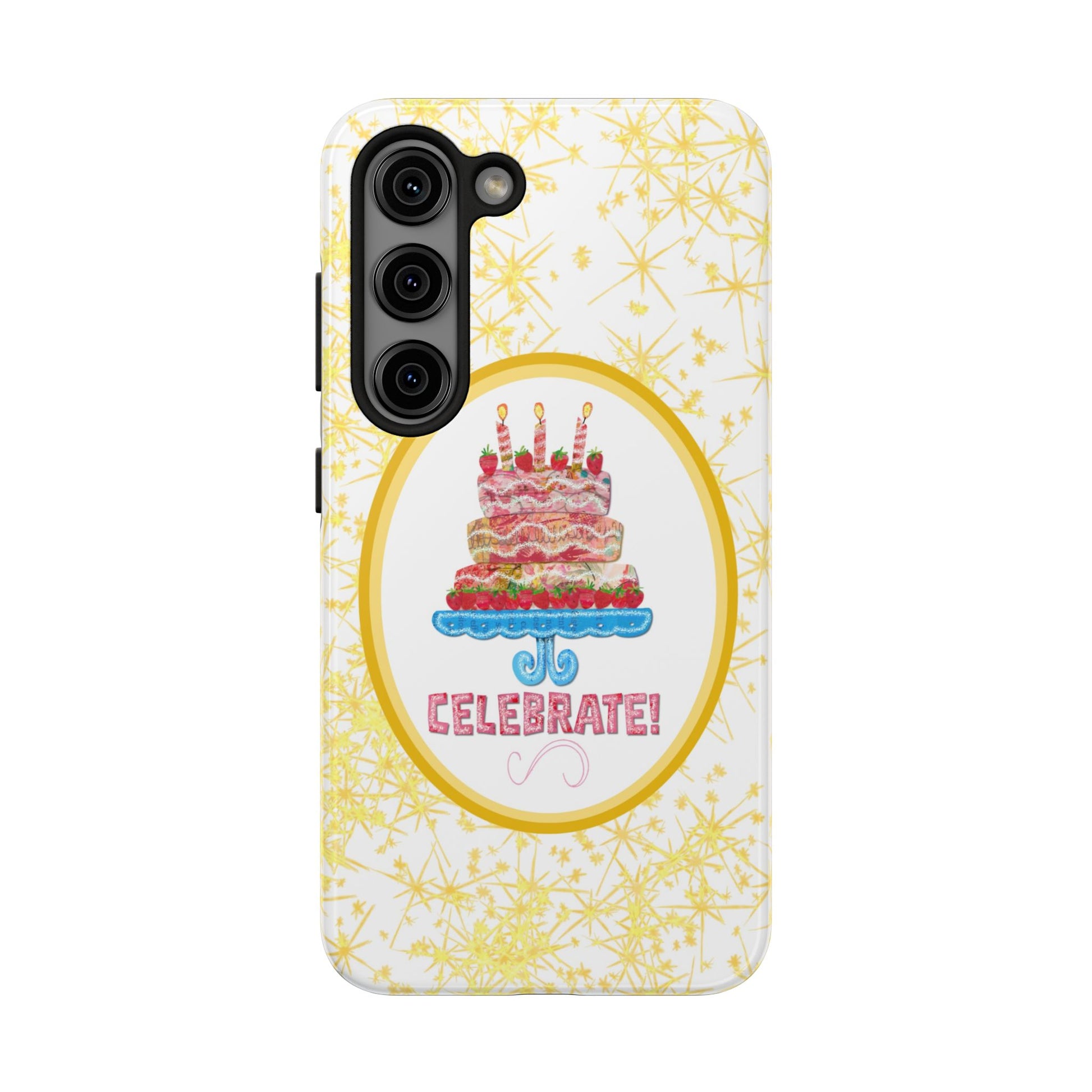 The "Celebrate!" tough phone case features a playful, three-layer cake design, decorated with vibrant collage papers in red, pink, and pale yellow. The cake sits on a turquoise cake stand and is adorned with wavy glitter stripes and fresh strawberries on both the top and bottom layers. Three candles light up the celebration, and the word "Celebrate!" is written in a bold, glittery red and pink font, accented with silver glitter. This festive, fun case brings a sense of joy and party spirit to your phone.