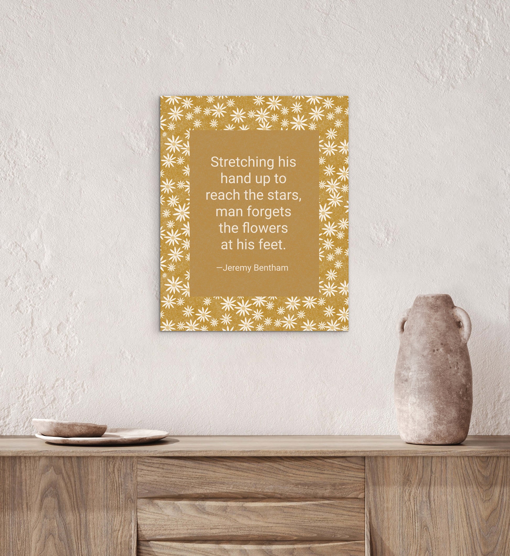 This premium matte paper poster features a sweet ditzy pattern of soft cream chickweed blossoms with antique-gold centers scattered across a warm antique gold background. Textured inking and layered overlays create a quiet, nostalgic woodland fabric feel—celebrating the humble beauty of small wild flowers often found underfoot. The natural wood frame and matte finish enhance the artwork’s cozy, heirloom quality, making it a gentle accent for nature-inspired interiors.