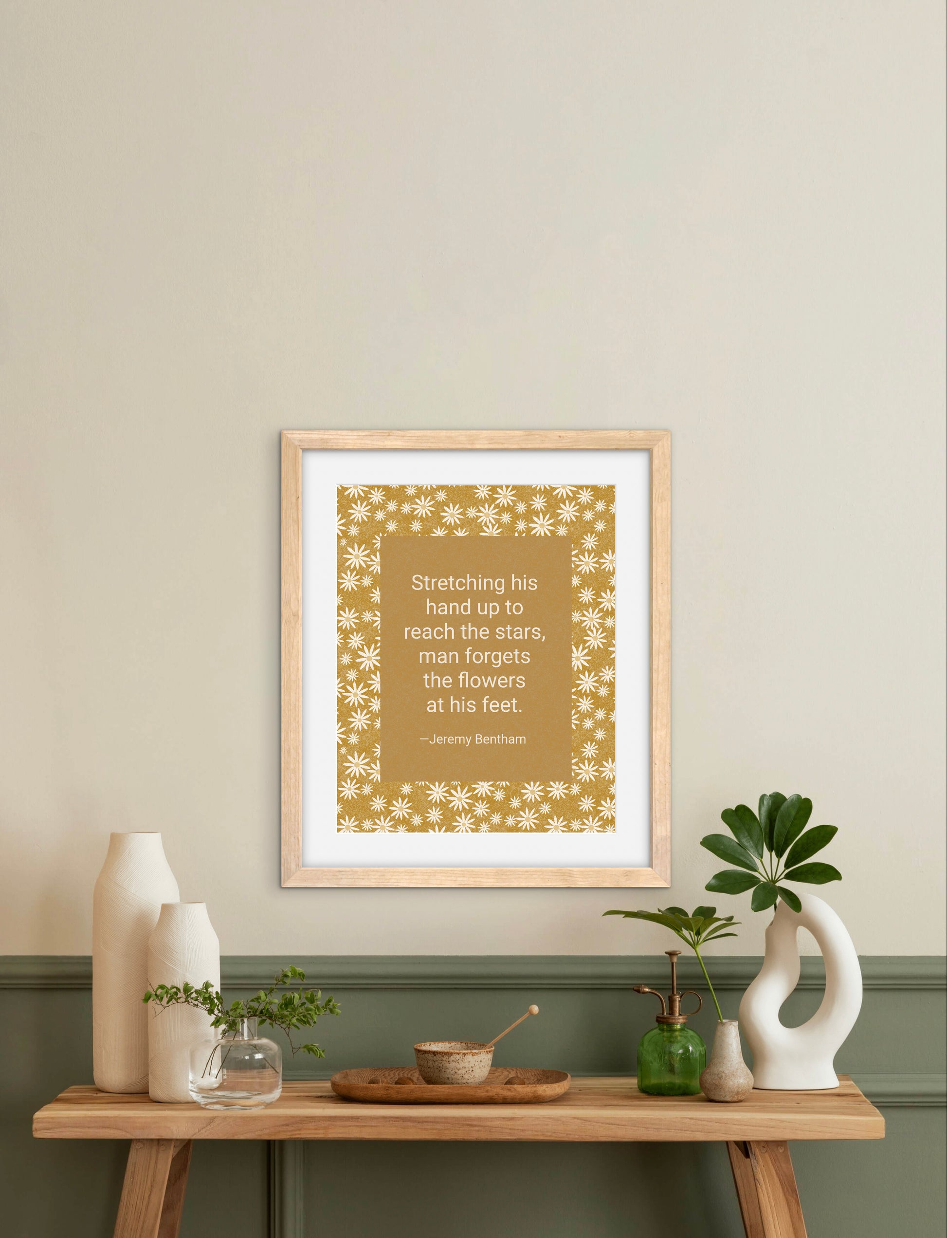 This wood framed premium matte print features a sweet ditzy pattern of soft cream chickweed blossoms with antique-gold centers scattered across a warm antique gold background. Textured inking and layered overlays create a quiet, nostalgic woodland fabric feel—celebrating the humble beauty of small wild flowers often found underfoot. The natural wood frame and matte finish enhance the artwork’s cozy, heirloom quality, making it a gentle accent for nature-inspired interiors.