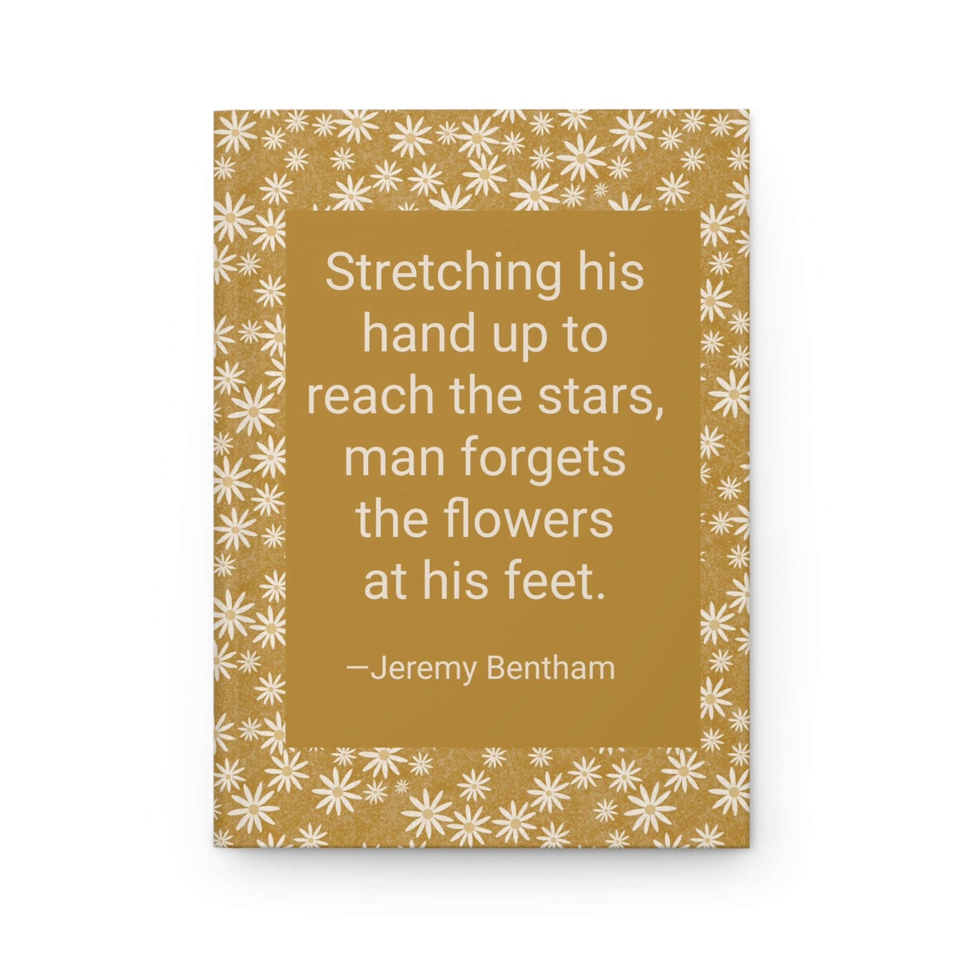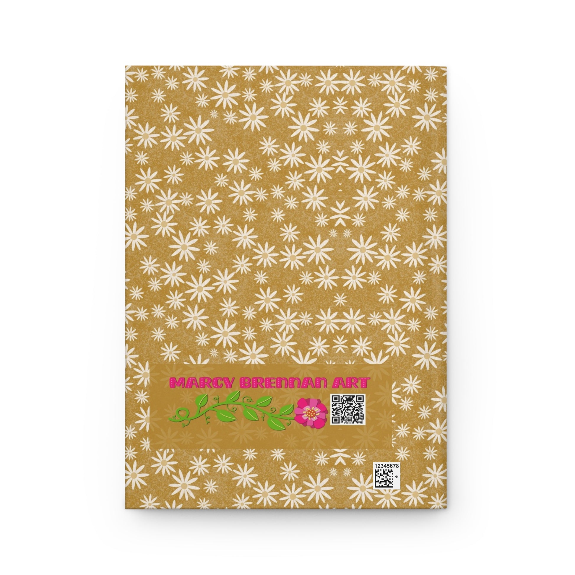 hardcover journal features a sweet ditzy pattern of soft cream chickweed blossoms with antique-gold centers, scattered across a warm antique gold background. Subtle inking textures and layered overlays give the design a quiet, nostalgic woodland fabric feel—perfect for journaling, sketching, or thoughtful reflection.