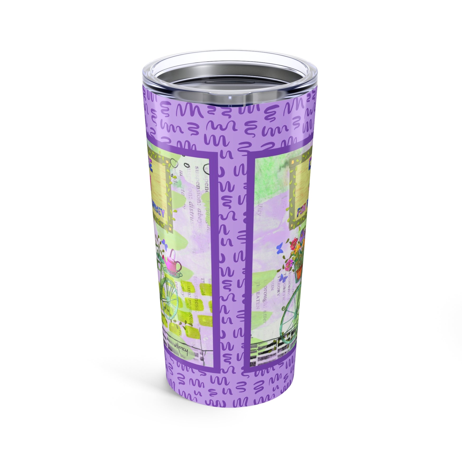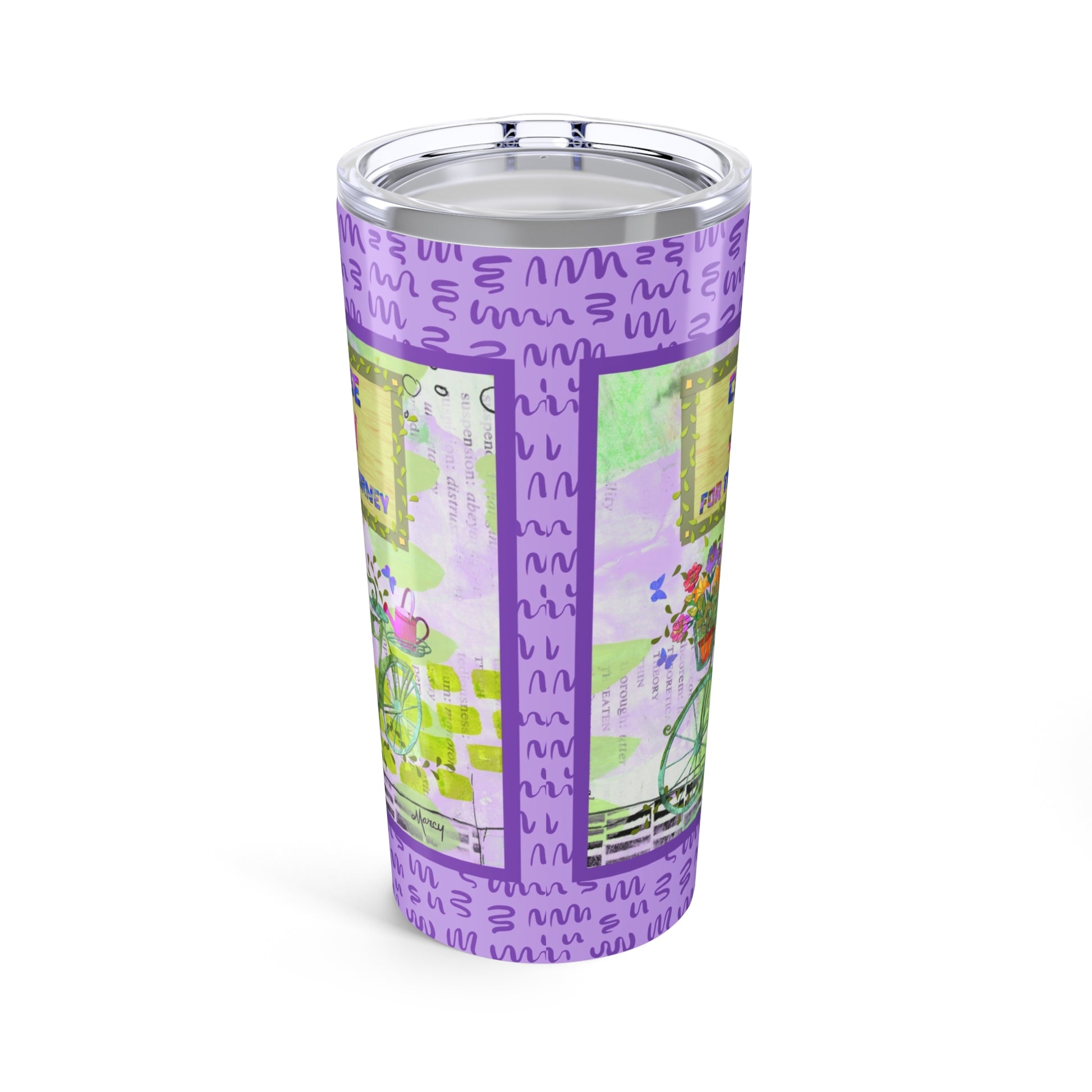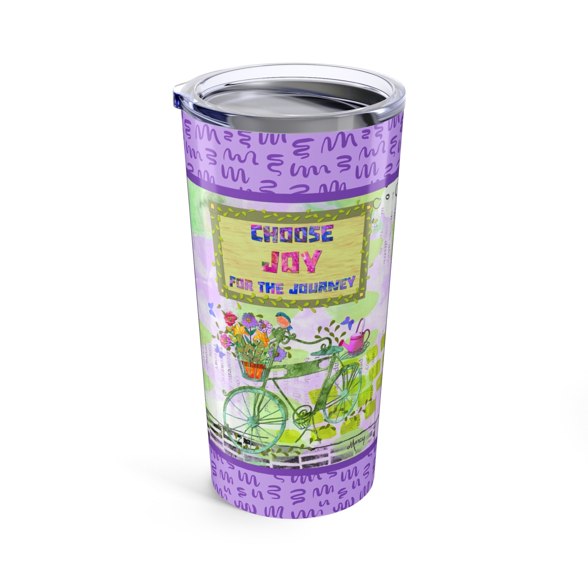 Sip in style and positivity with this 20 oz stainless steel travel mug featuring the cheerful “Choose Joy for the Journey”design. Wrapped in a whimsical digital collage, the artwork showcases a fancy green bicycle with a basket full of vibrant flowers and a pink watering can riding along in the back. A cute red robin perches sweetly on the handlebars, adding a touch of charm and delight. Above the bike, a hand-lettered, wonky wooden sign encourages you to “Choose Joy for the Journey,” nestled in lush greenery that weaves through the scene. The entire design is set against an abstract blend of green and lavender tones, with cobblestones under the bike and a playful purple scribble-textured background. Double-walled to keep your drinks hot or cold, this travel mug is perfect for brightening your commute, your day, and your mindset.