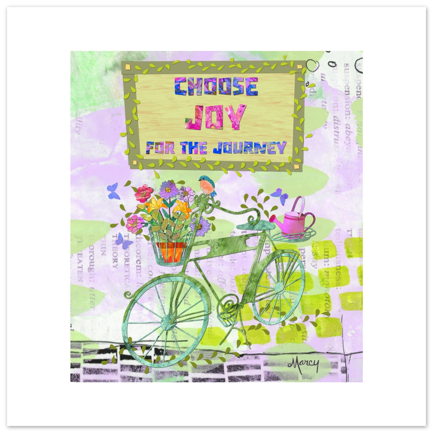 Bring a burst of cheer and charm to your space with the “Choose Joy for the Journey” premium matte paper poster. This vibrant digital collage features a whimsical green bicycle adorned with a front basket full of colorful flowers and a pink watering can resting in the rear basket. A sweet red robin perches playfully on the handlebars, adding a touch of nature’s delight. Above the bike, a wonky wooden sign with hand-lettered text reads “Choose Joy for the Journey,”reminding you to embrace every step of life with positivity. Greenery winds through the design, accenting the flowers, watering can, and cobblestone path beneath the bike. The entire piece is set against a dreamy green and lavender abstract backdrop, layered with textured lavender and purple scribbles for extra depth and playfulness. Printed on premium matte paper and beautifully framed in wood, this art piece is perfect for brightening up your home, office, or creative space.