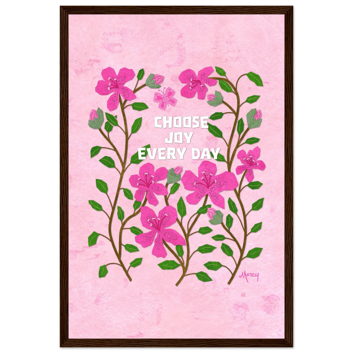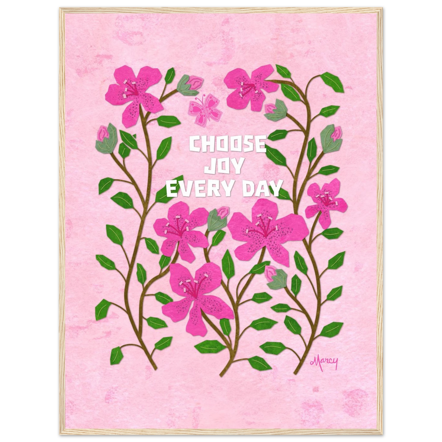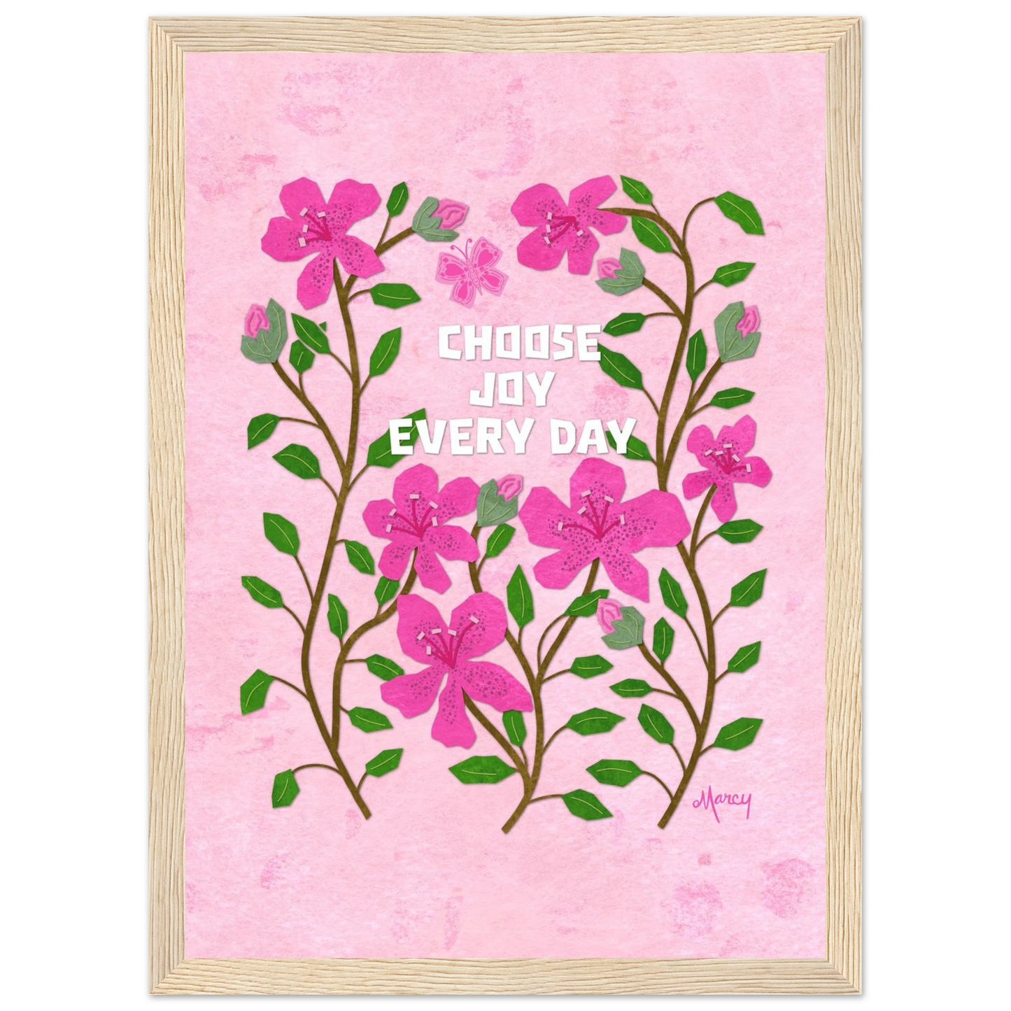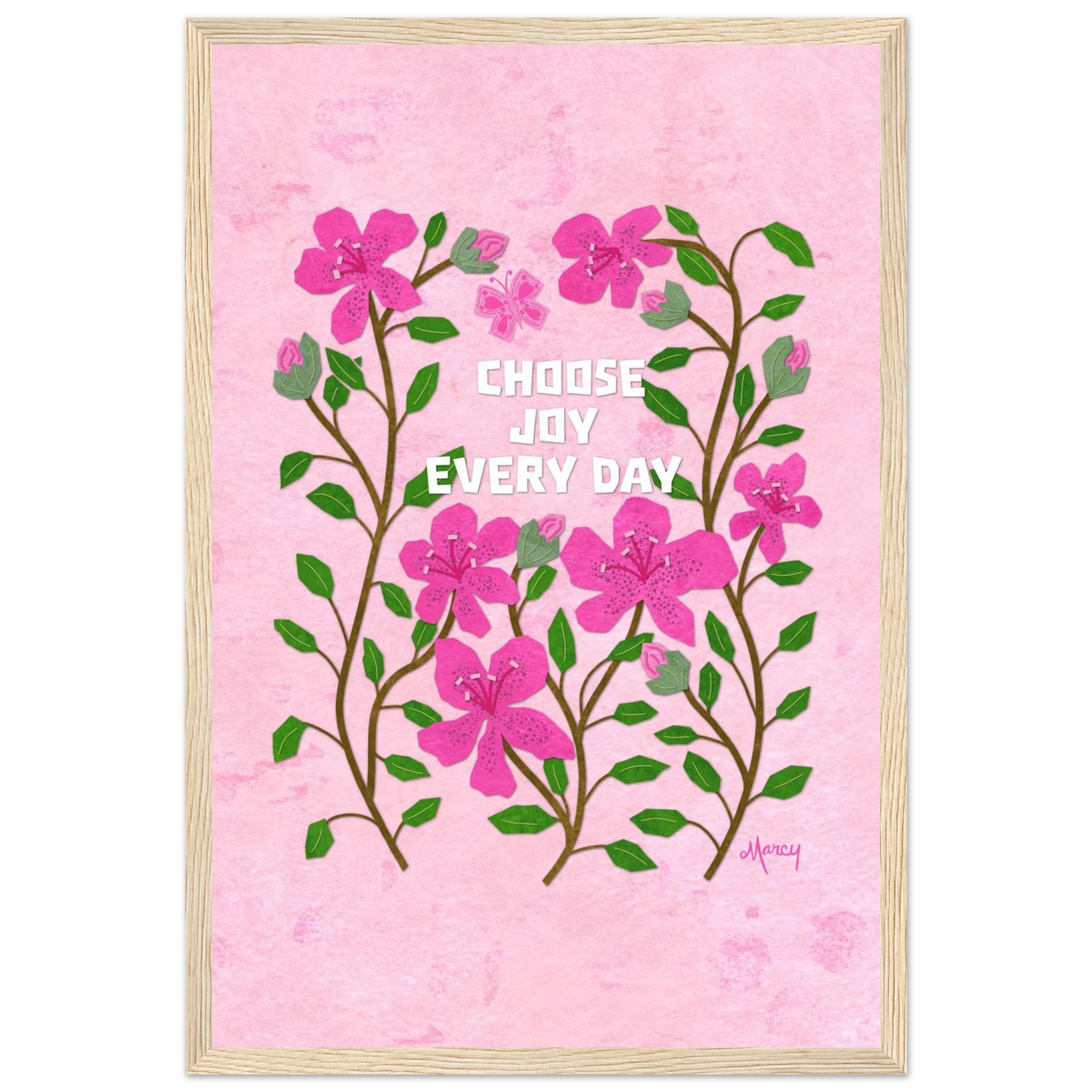 Infuse your space with beauty and inspiration with this wood-framed premium matte print featuring a vibrant collage of pink azaleas and the uplifting quote “Choose Joy Every Day.” Set on a soft pink collage paper background, this artwork offers a harmonious blend of elegance and motivation. The premium matte finish enhances the texture and color of the illustration, while the classic wood frame adds a timeless touch—perfect for home offices, bedrooms, or gallery walls. A daily reminder to focus on positivity, beautifully framed and ready to brighten your world.