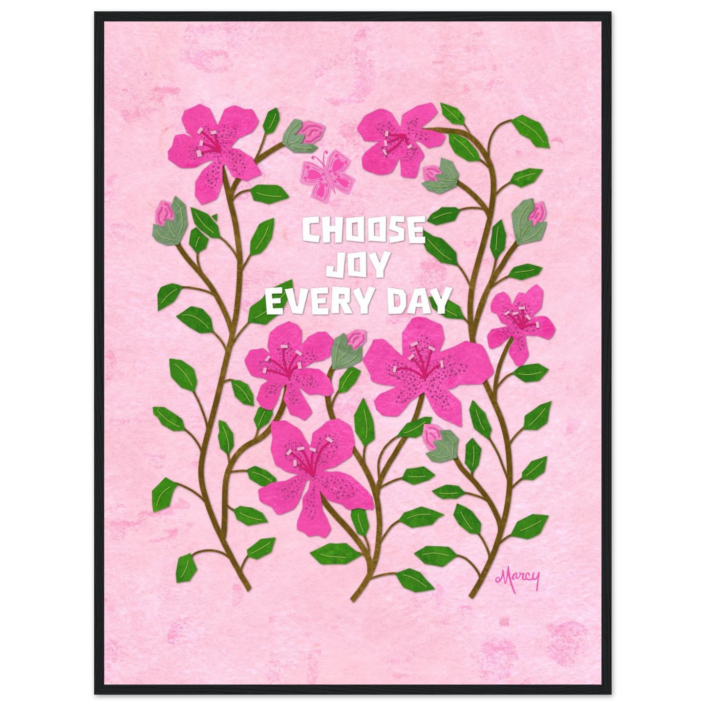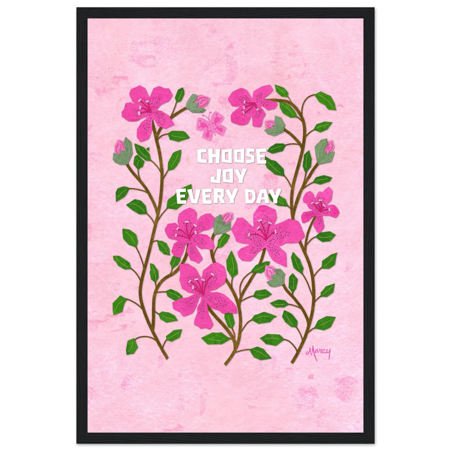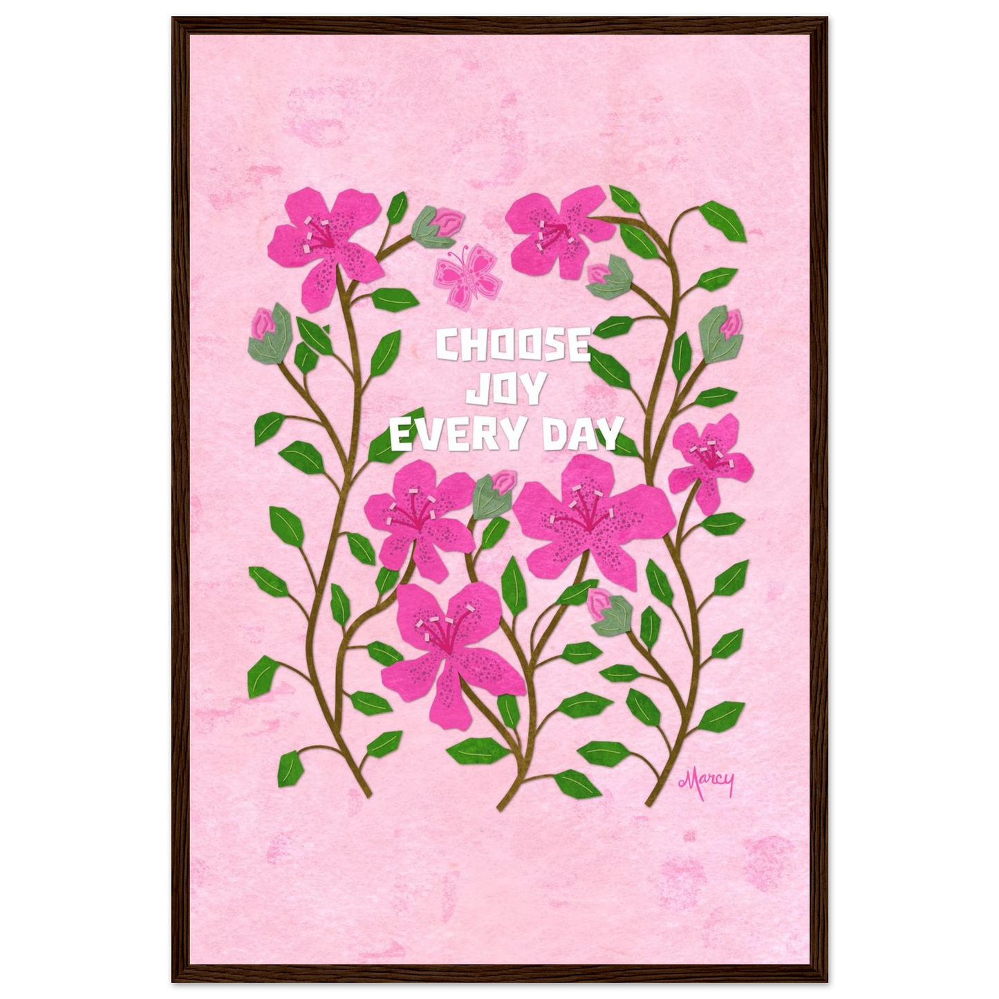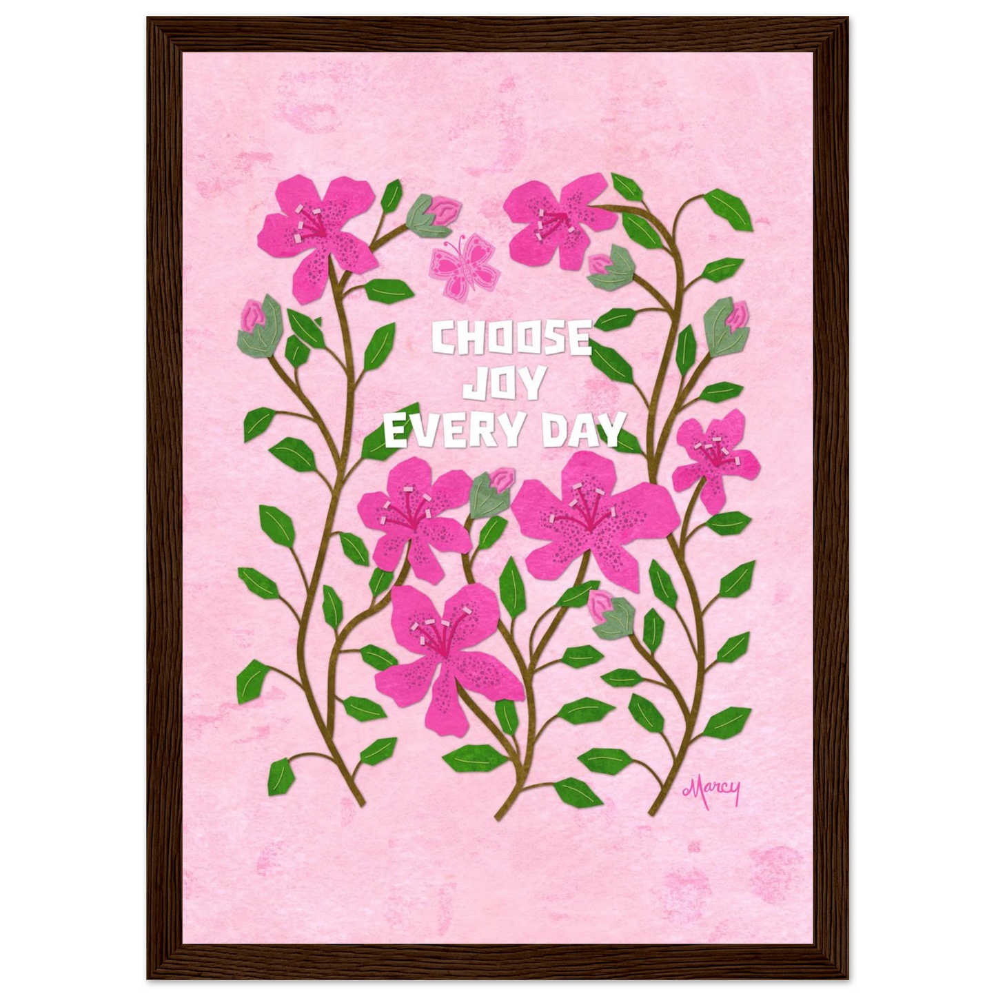 Infuse your space with beauty and inspiration with this wood-framed premium matte print featuring a vibrant collage of pink azaleas and the uplifting quote “Choose Joy Every Day.” Set on a soft pink collage paper background, this artwork offers a harmonious blend of elegance and motivation. The premium matte finish enhances the texture and color of the illustration, while the classic wood frame adds a timeless touch—perfect for home offices, bedrooms, or gallery walls. A daily reminder to focus on positivity, beautifully framed and ready to brighten your world.
