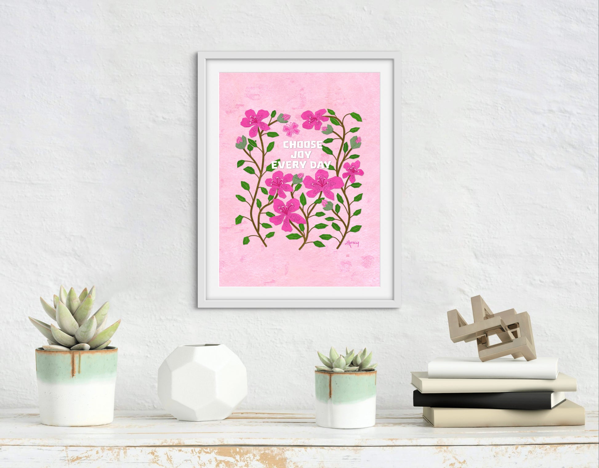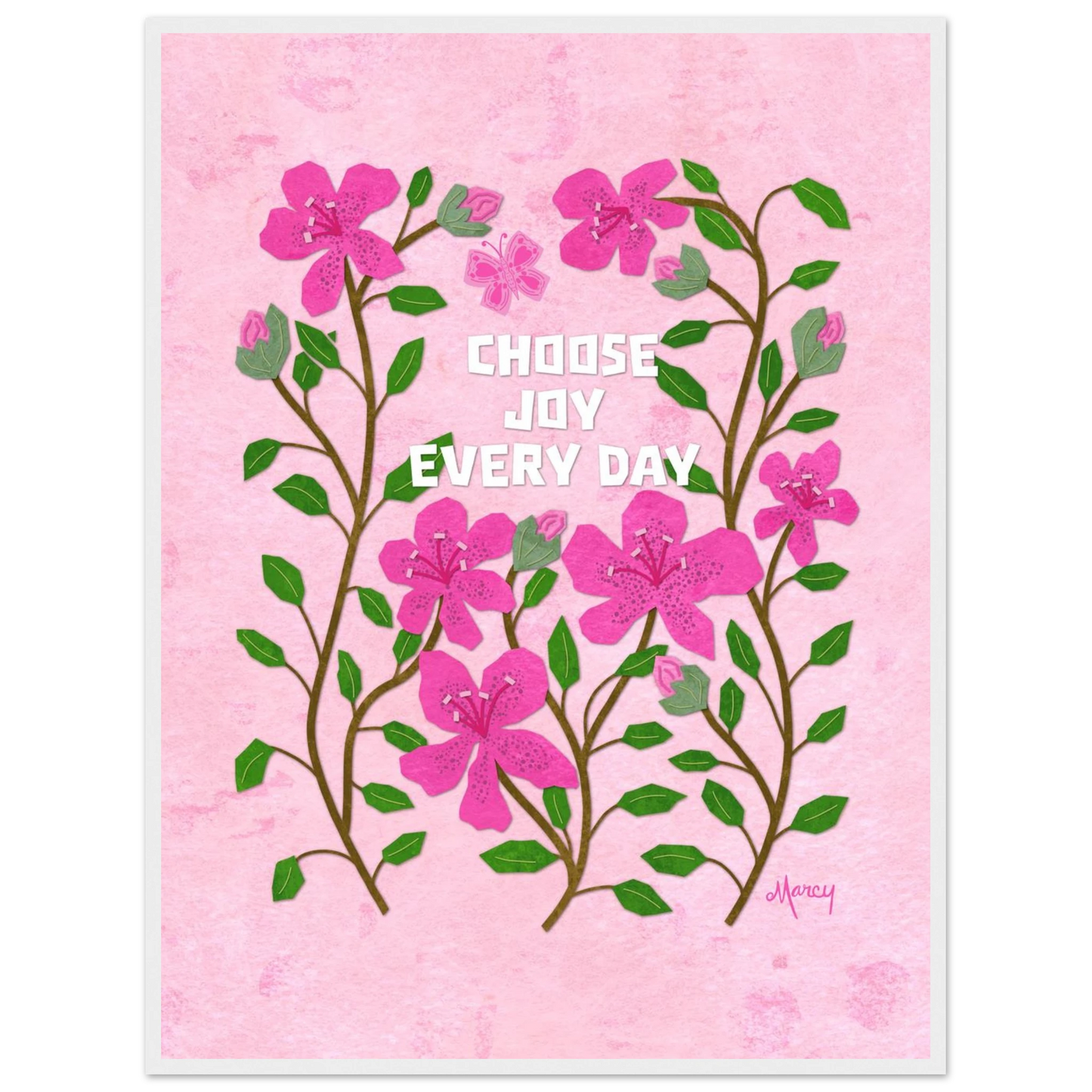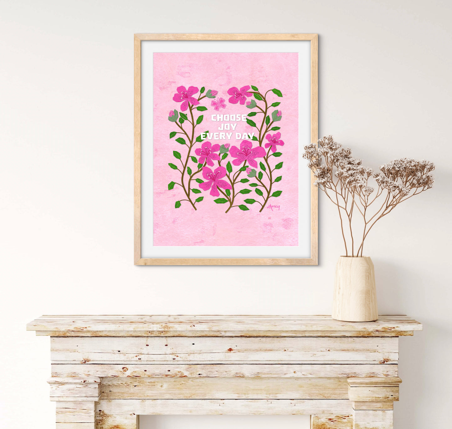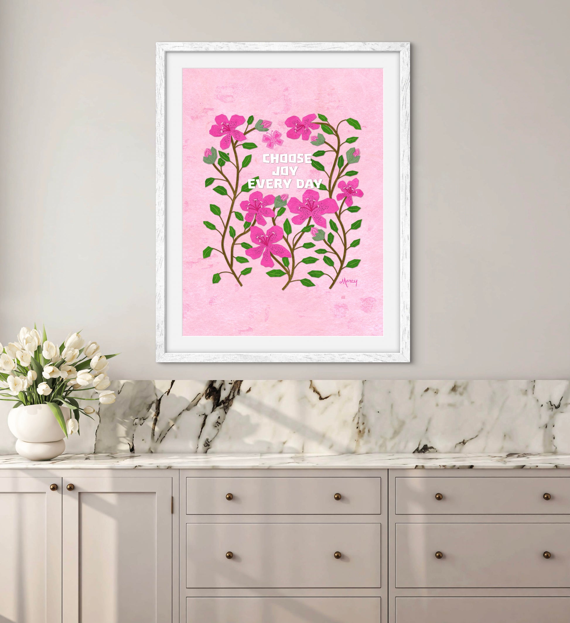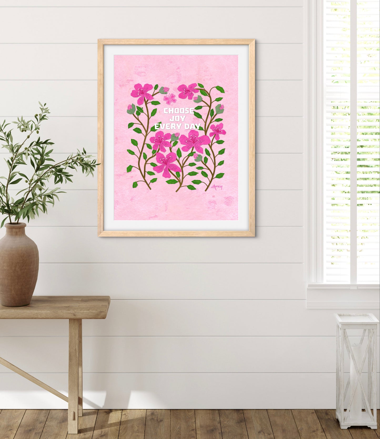Infuse your space with beauty and inspiration with this wood-framed premium matte print featuring a vibrant collage of pink azaleas and the uplifting quote “Choose Joy Every Day.” Set on a soft pink collage paper background, this artwork offers a harmonious blend of elegance and motivation. The premium matte finish enhances the texture and color of the illustration, while the classic wood frame adds a timeless touch—perfect for home offices, bedrooms, or gallery walls. A daily reminder to focus on positivity, beautifully framed and ready to brighten your world.