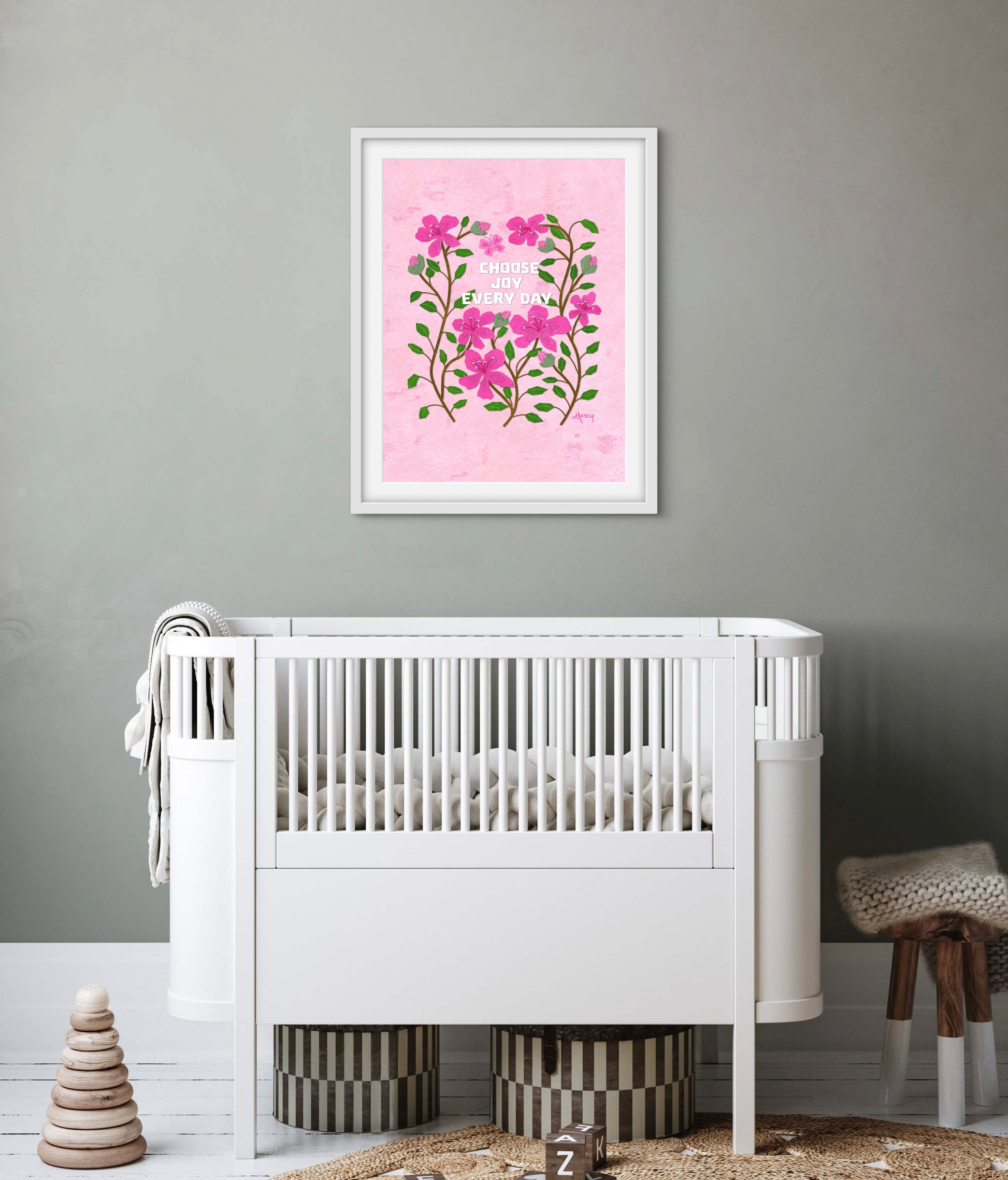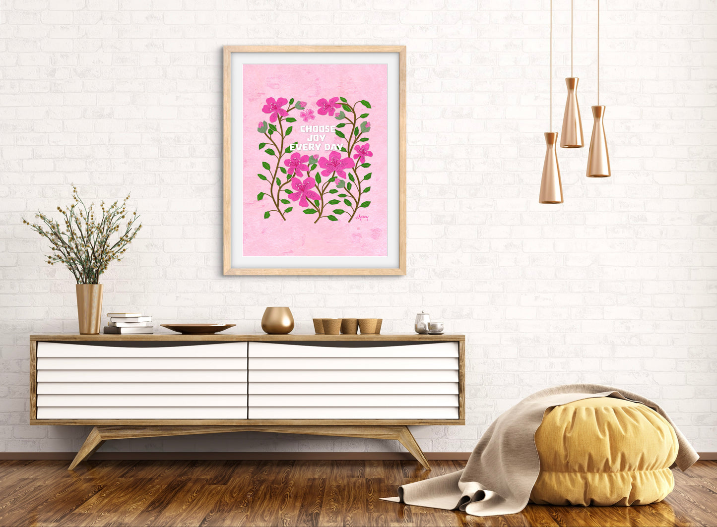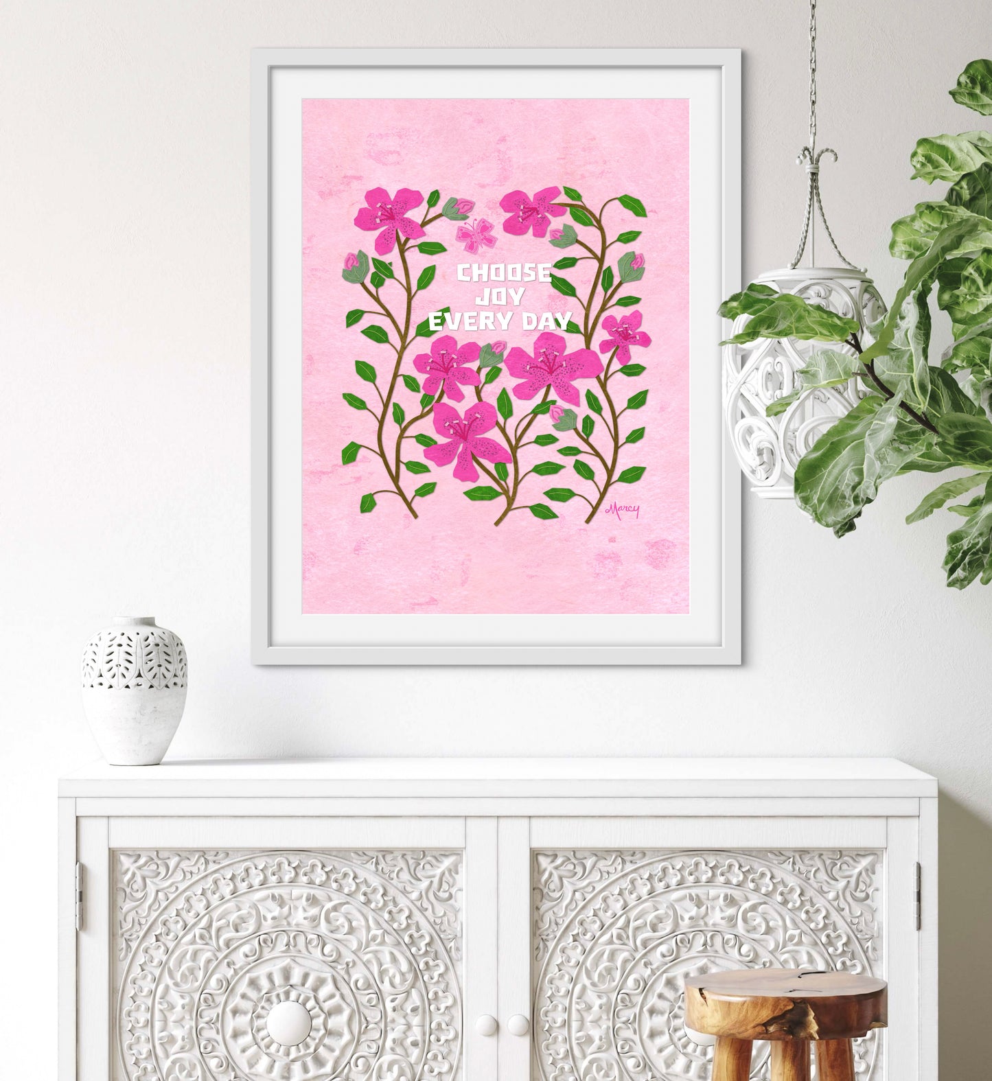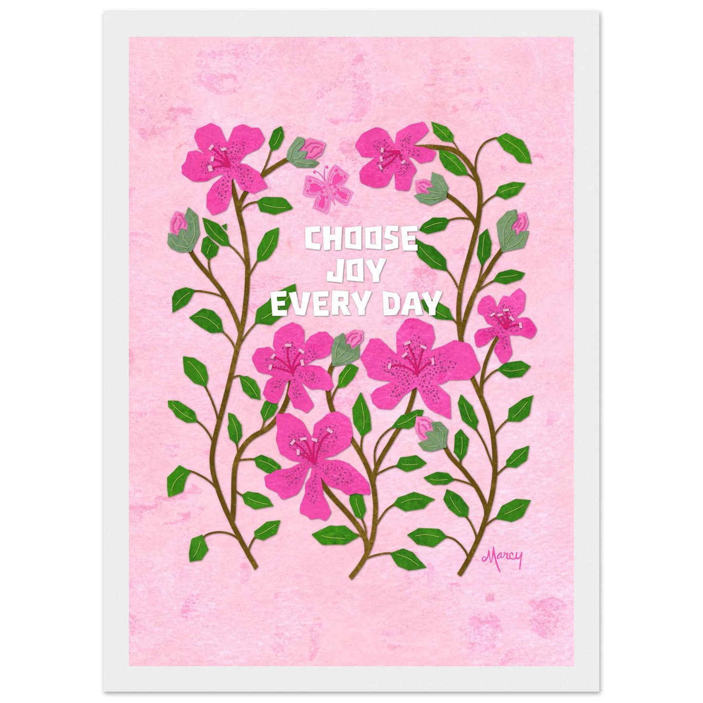 Infuse your space with beauty and inspiration with this wood-framed premium matte print featuring a vibrant collage of pink azaleas and the uplifting quote “Choose Joy Every Day.” Set on a soft pink collage paper background, this artwork offers a harmonious blend of elegance and motivation. The premium matte finish enhances the texture and color of the illustration, while the classic wood frame adds a timeless touch—perfect for home offices, bedrooms, or gallery walls. A daily reminder to focus on positivity, beautifully framed and ready to brighten your world.