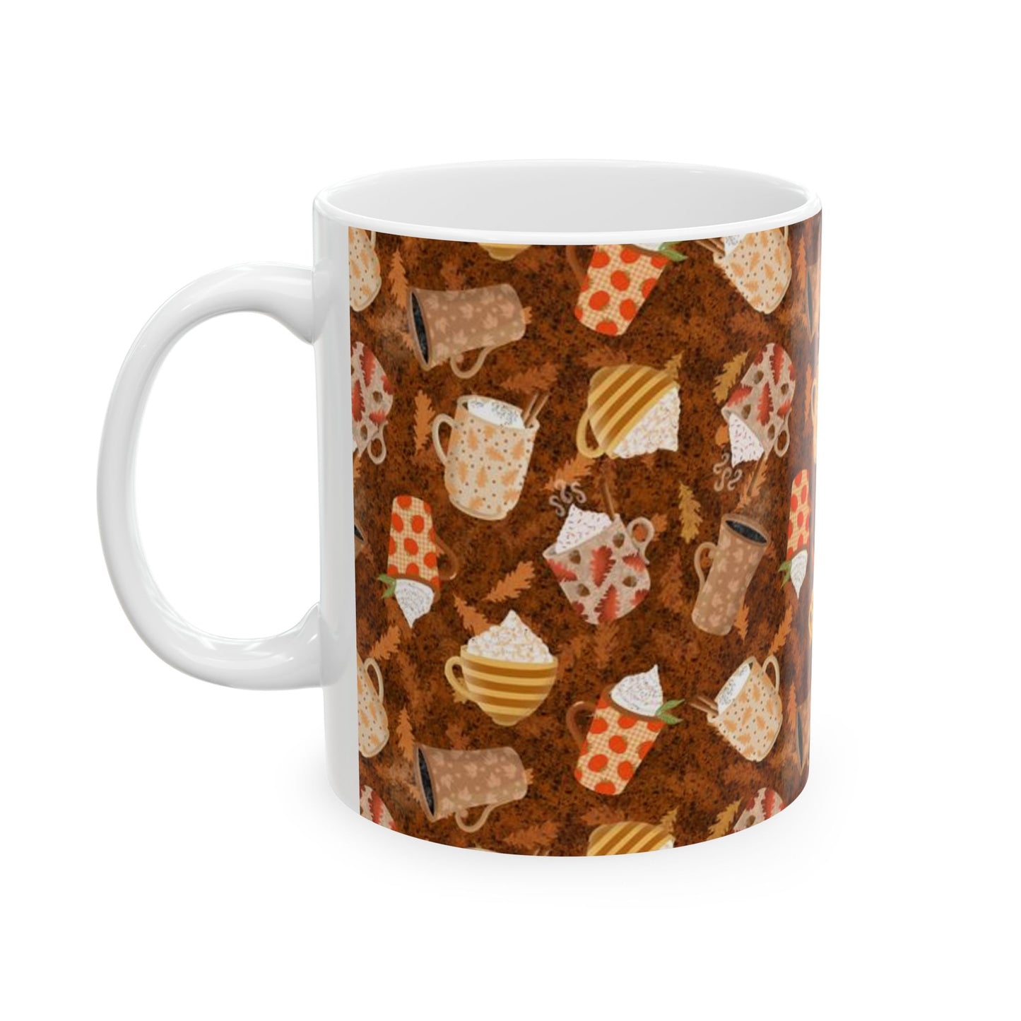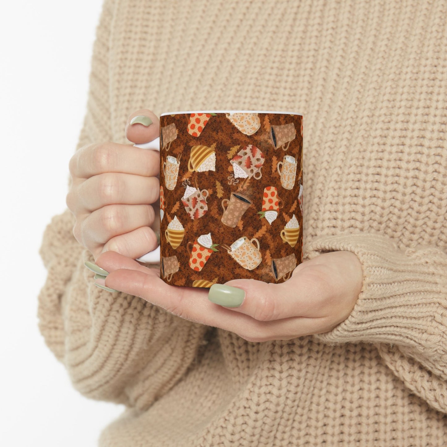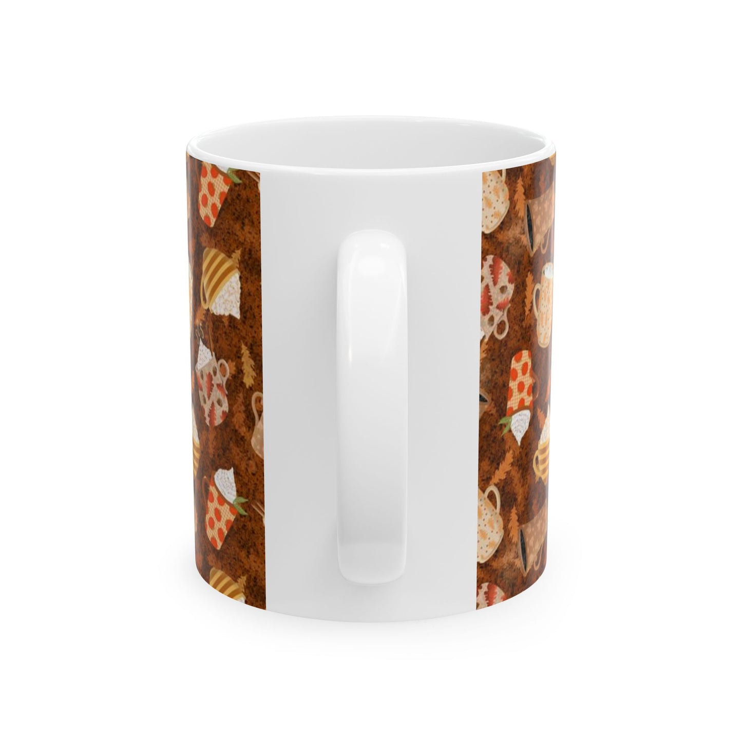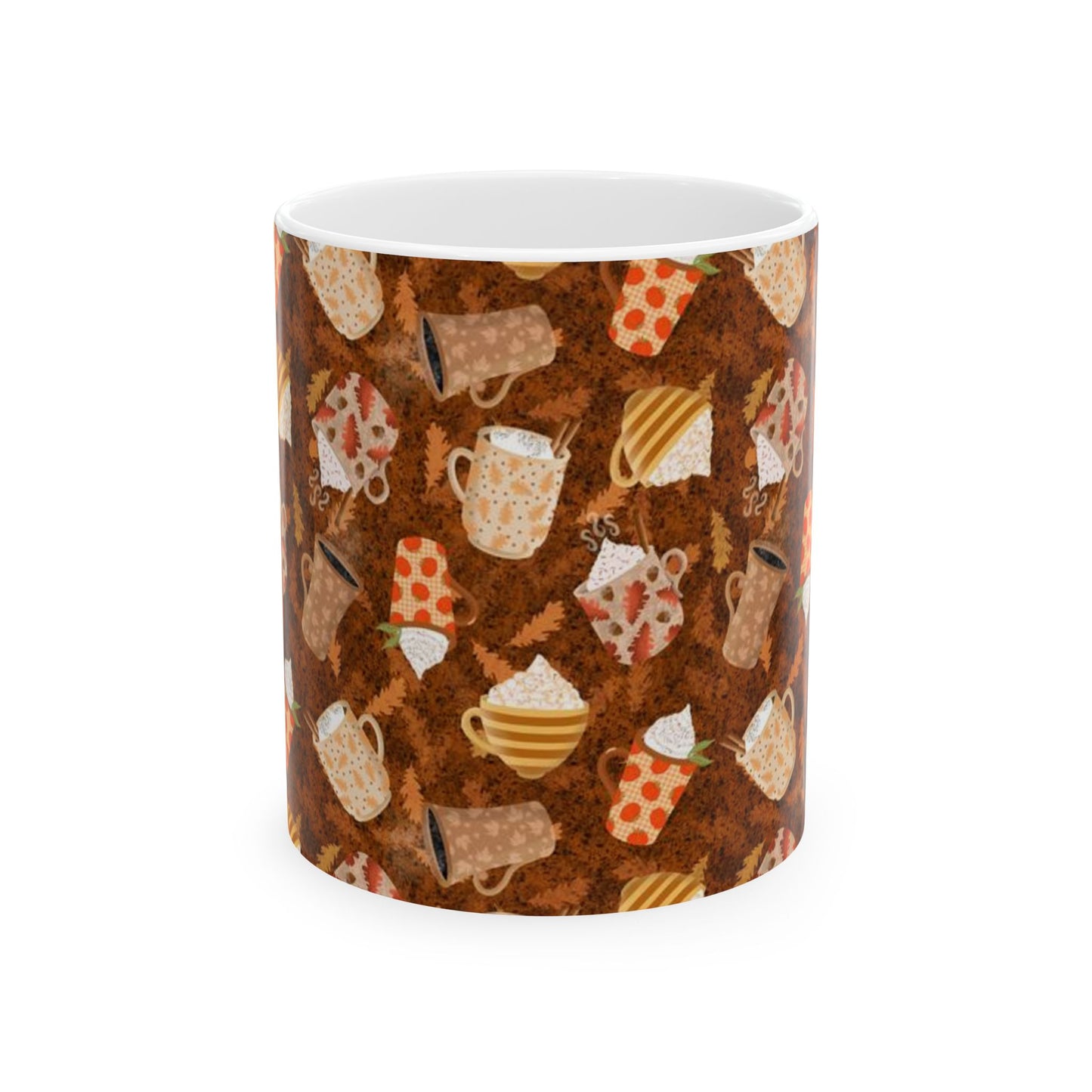 The "Cozy Fall Mugs" design on an 11 oz ceramic mug features charming fall-themed mugs brimming with hot beverages such as hot chocolate, chai, and coffee, all topped with whipped cream, cinnamon sticks, and sprinkles, all on a deep brown background. This delightful design captures the essence of autumn comfort, perfect for enjoying your favorite seasonal drinks.